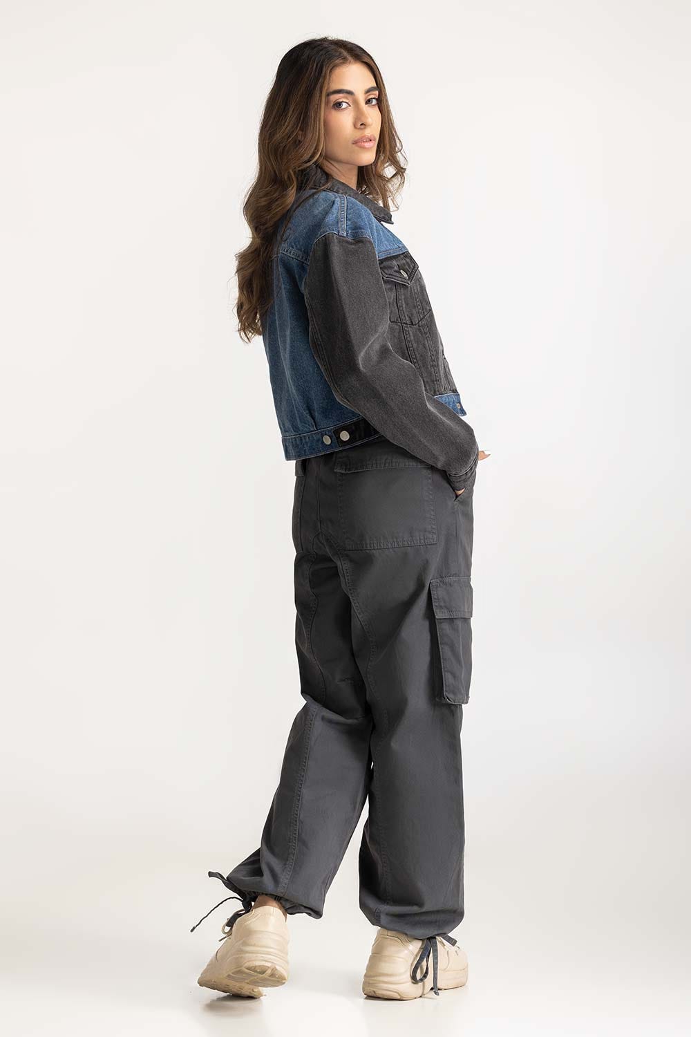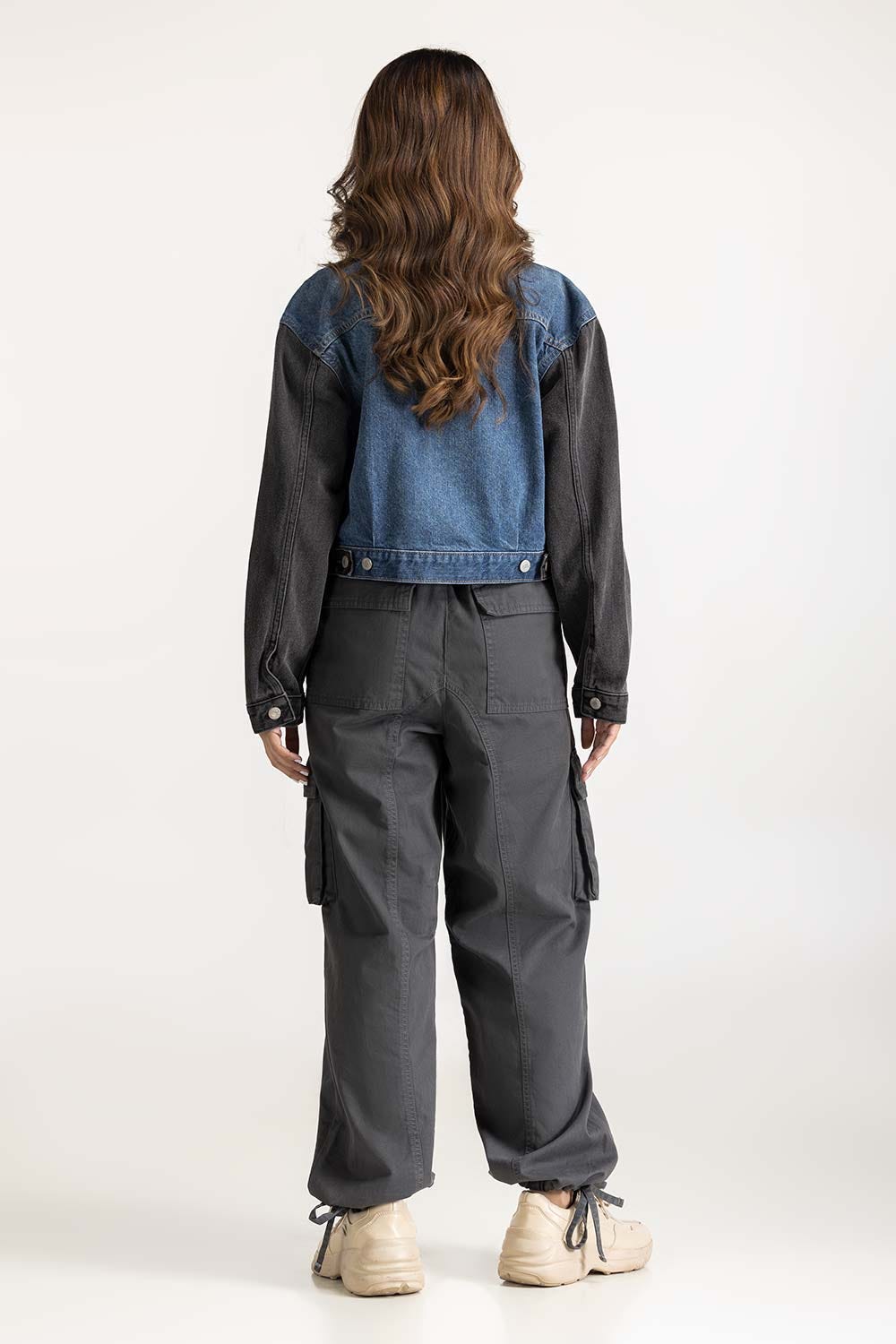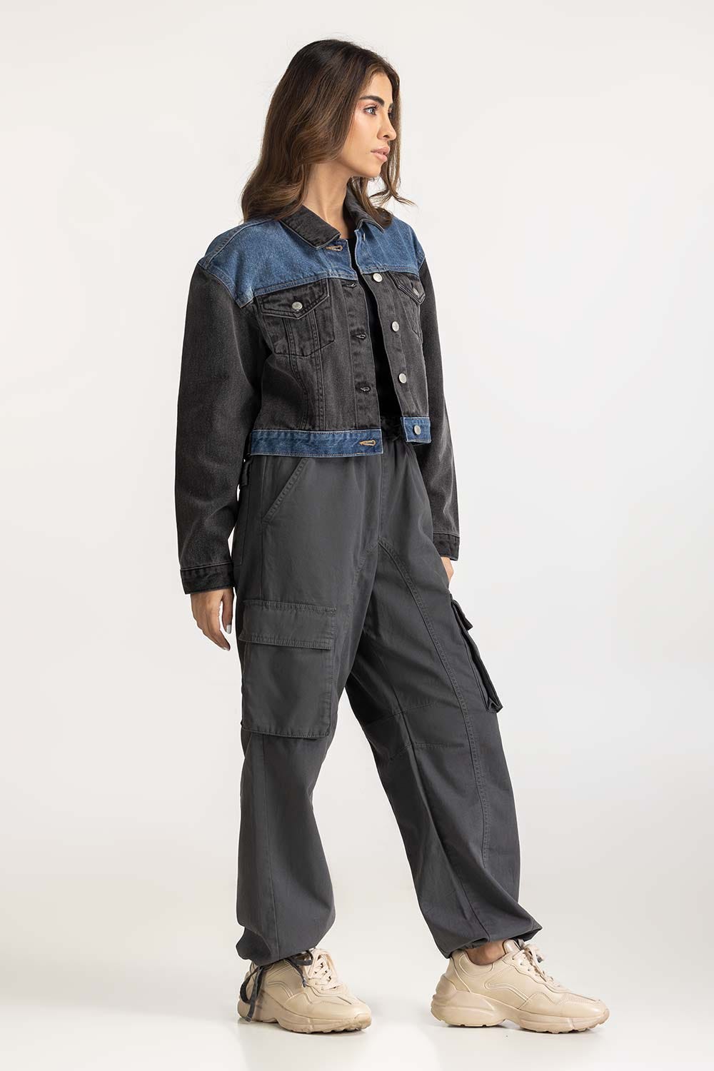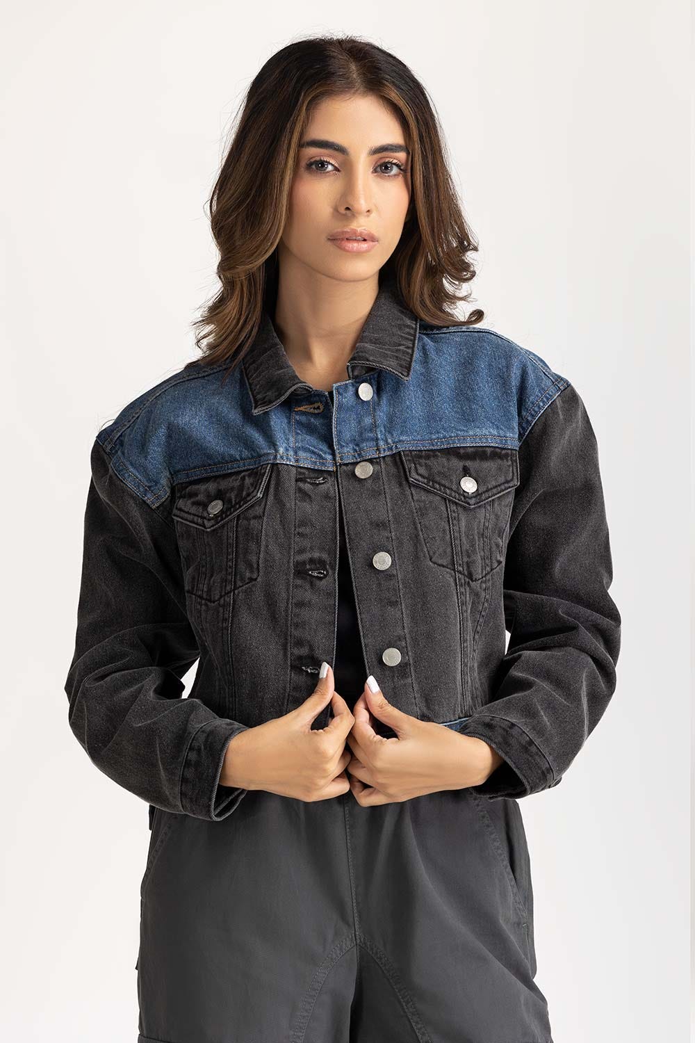 Cropped Denim Jacket With Contrast Panel Detail, Button Closure