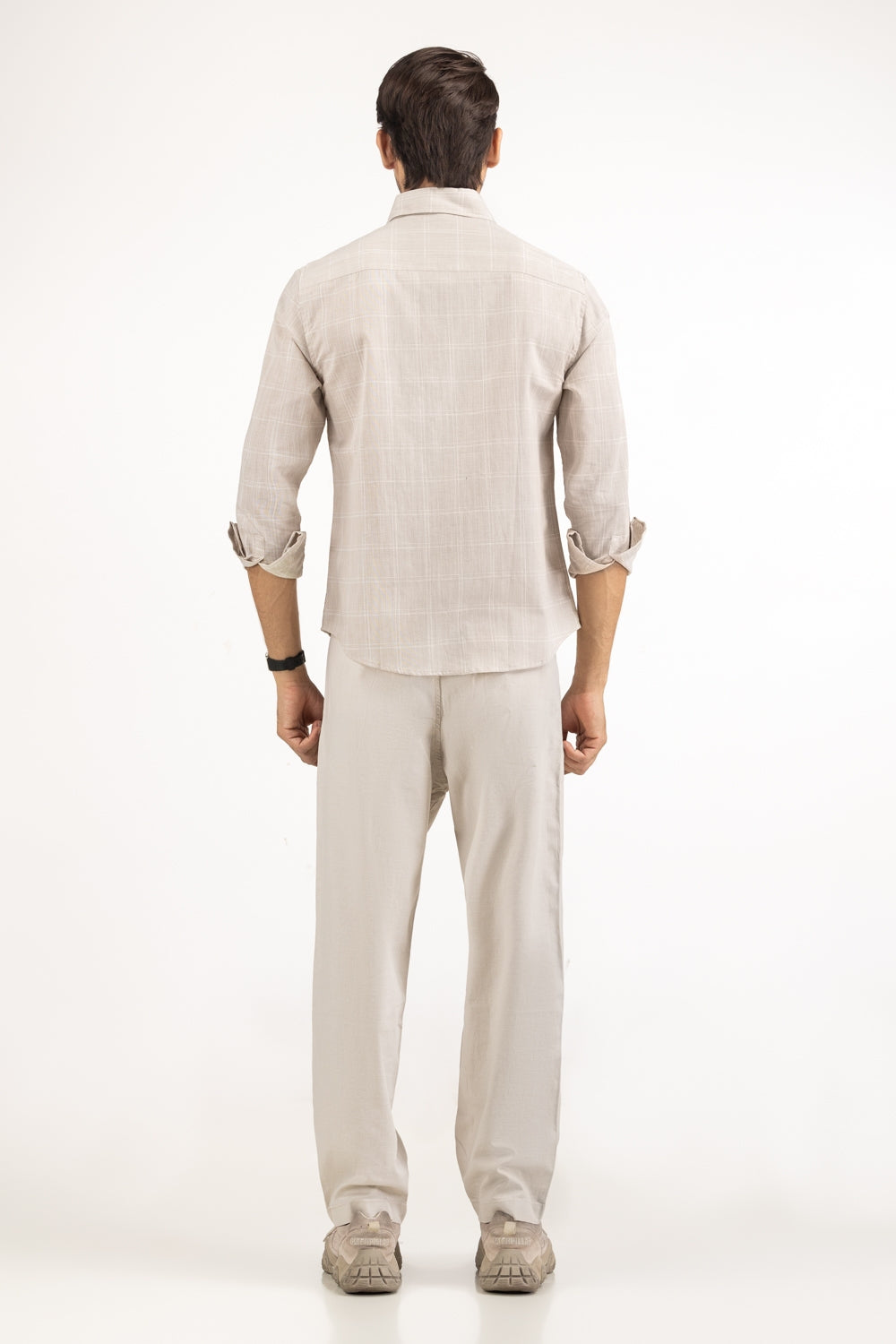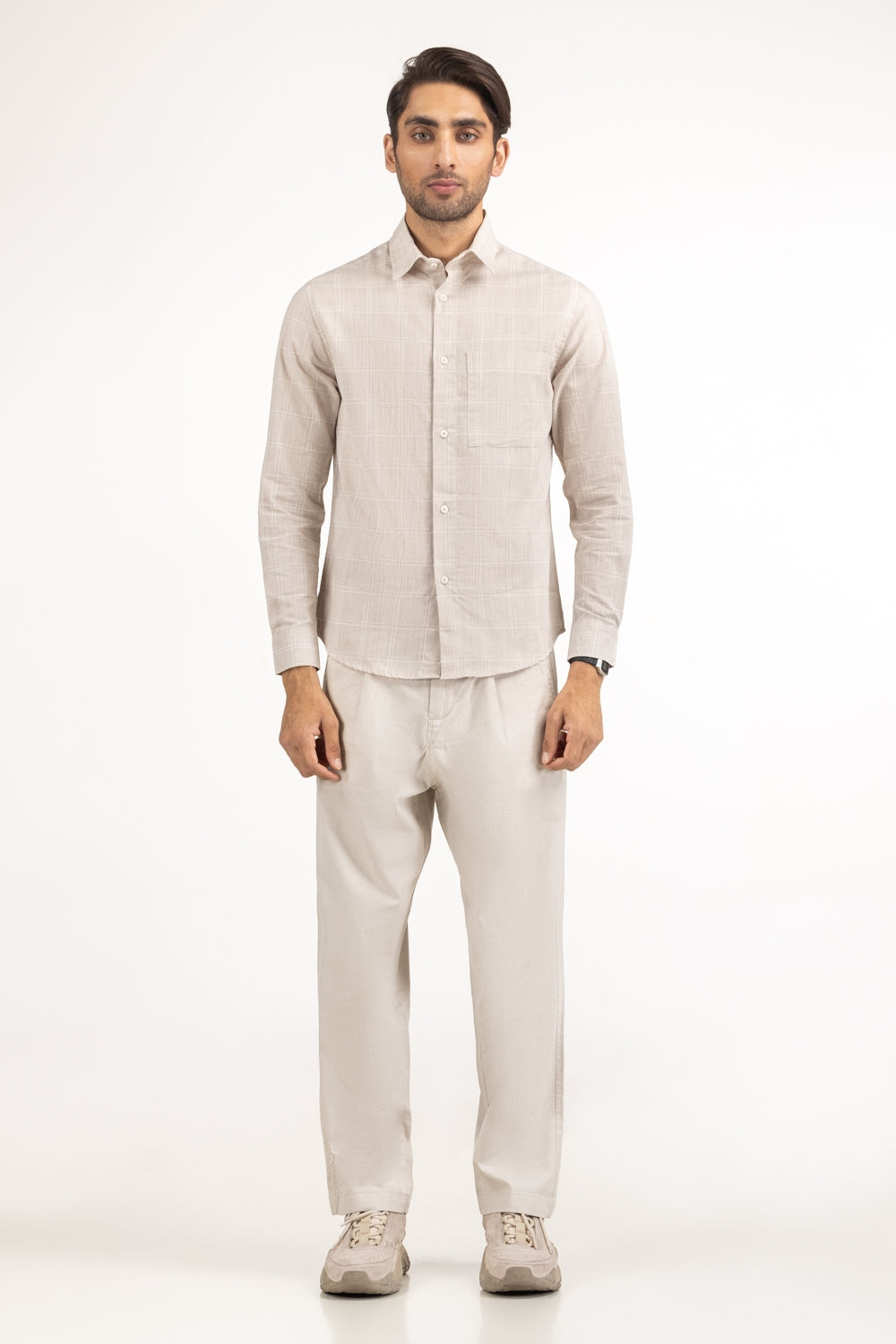 Tailored from breathable cotton-linen fabric in a soothing beige tone, this button-down shirt features a soft checkered...