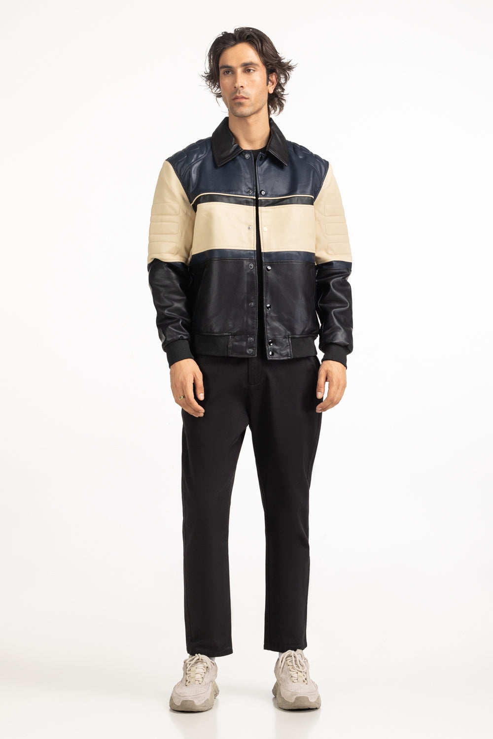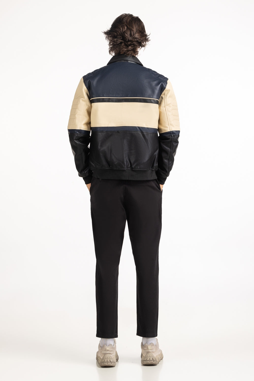 Sleek and season-ready, this front-open black jacket features a structured collar and defined shoulder lines for a commanding shape. The beige accents offer tonal contrast, adding depth to its sharp silhouette. While the dual side pockets underscore its day-to-day utility. An understated essential with a contemporary edge