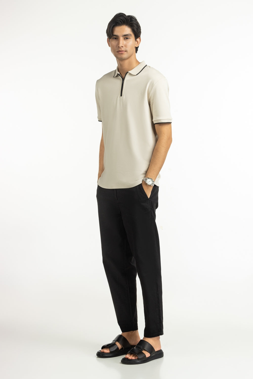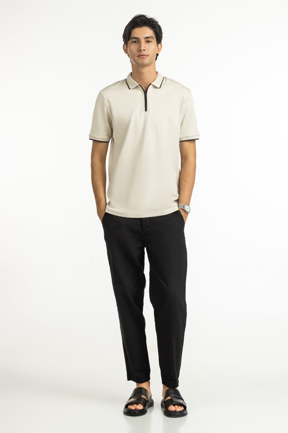 This polo combines the subtle texture with a functional zipped neckline, offering breathability with a modern edge. The regular fit sculpts a sharp silhouette while maintaining all-day comfort under summer’s heat.
