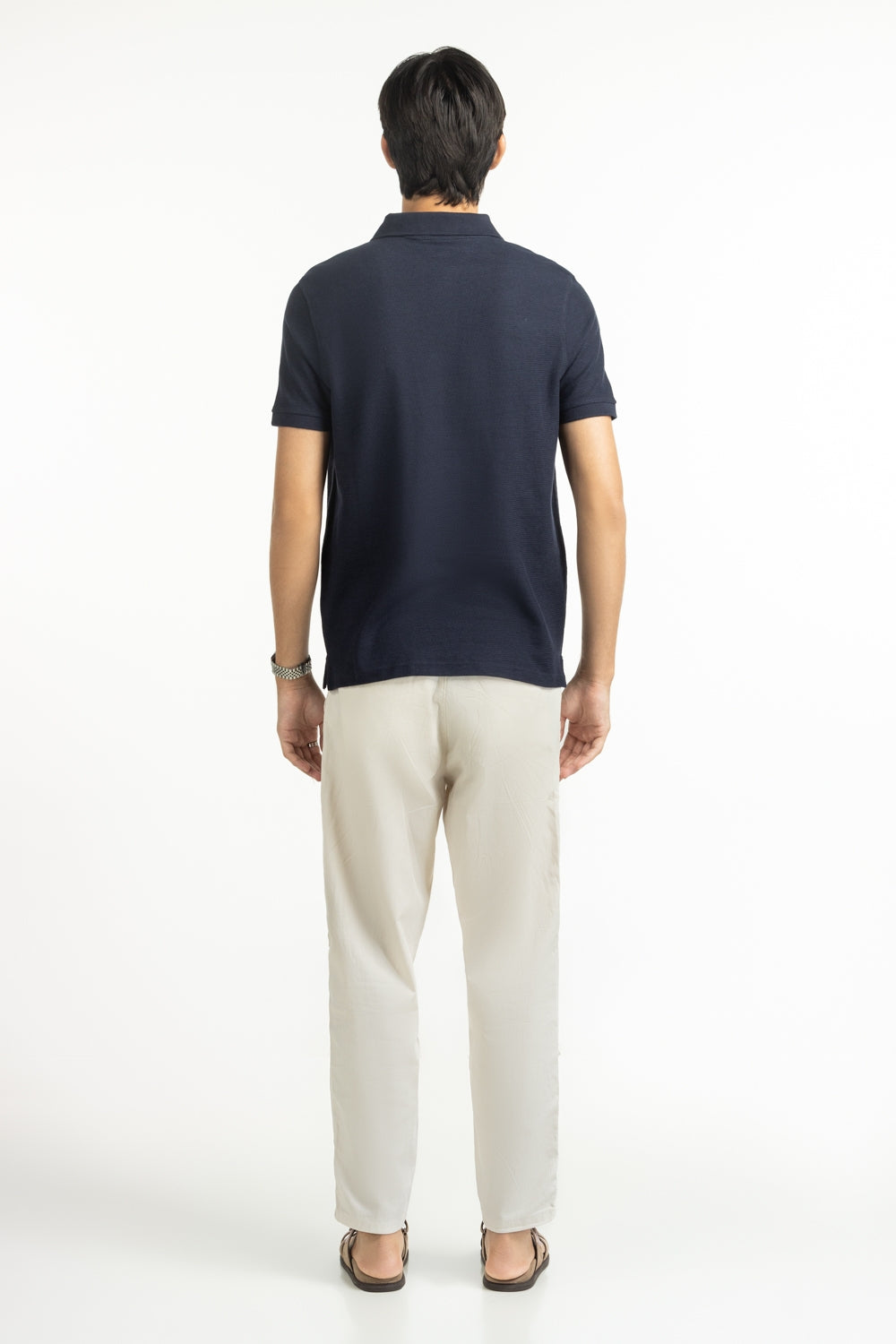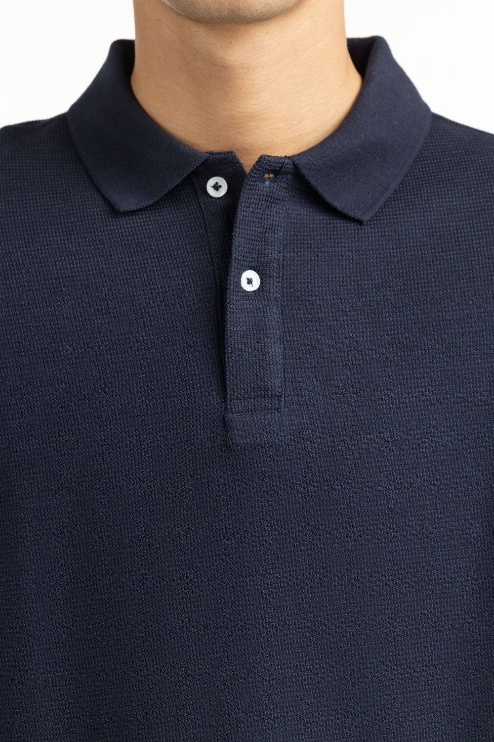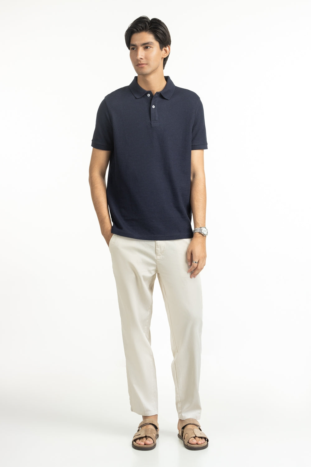 A textured knit brings quiet depth to the classic navy polo, giving it a tactile richness. The regular fit keeps the silhouette sharp yet easy to wear, while lightweight breathability makes it perfect for warm days.