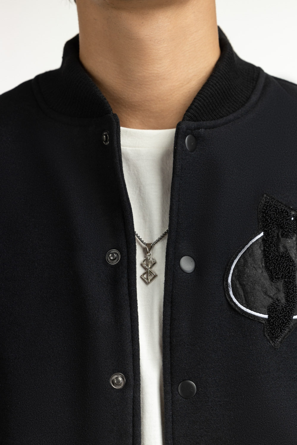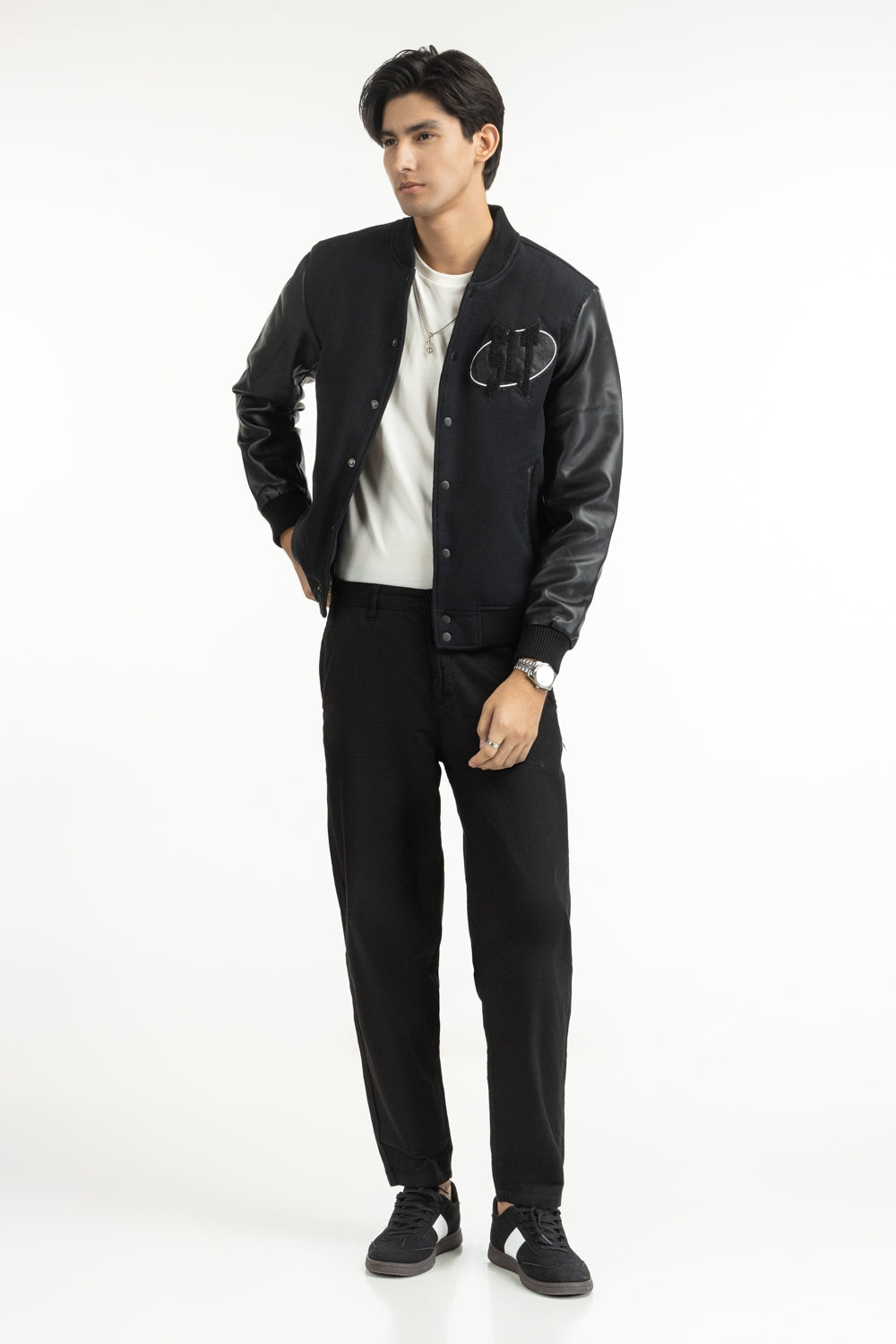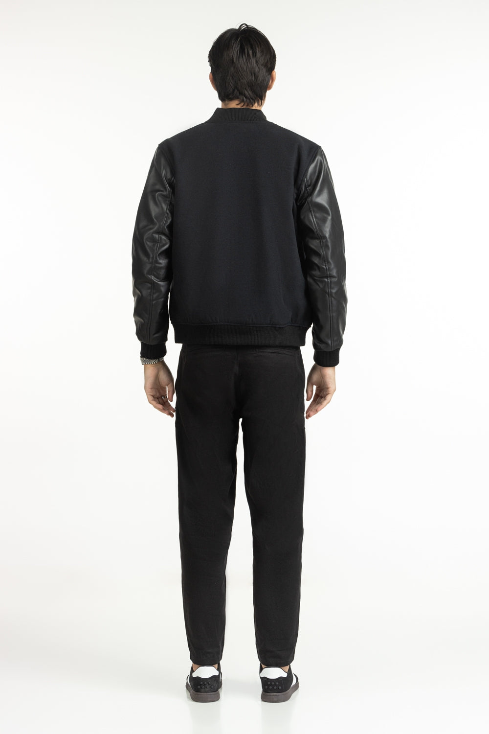 Cut from premium faux leather with a subtle grain, this black jacket is a statement. A soft band collar keeps the look sharp without sacrificing comfort. Designed with deep welt pockets to hold essentials and warmth alike. Contemporary yet comforting, just the way winters should be.