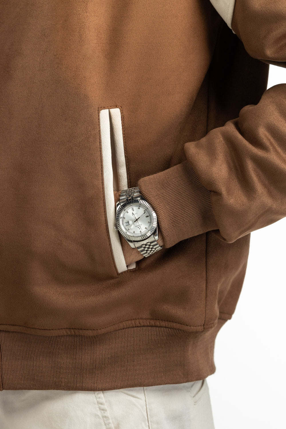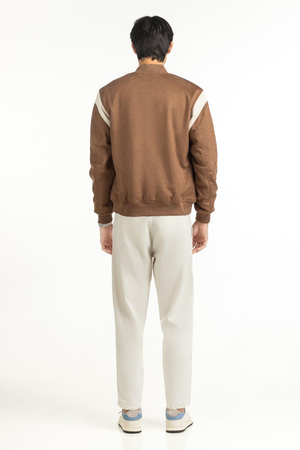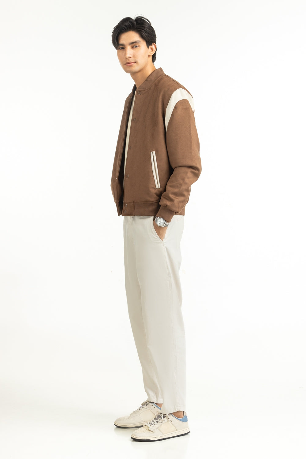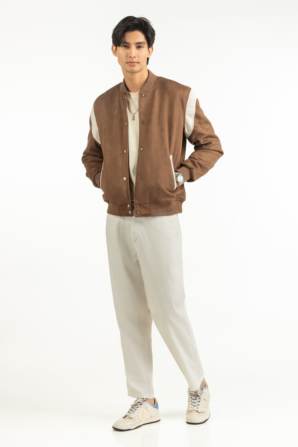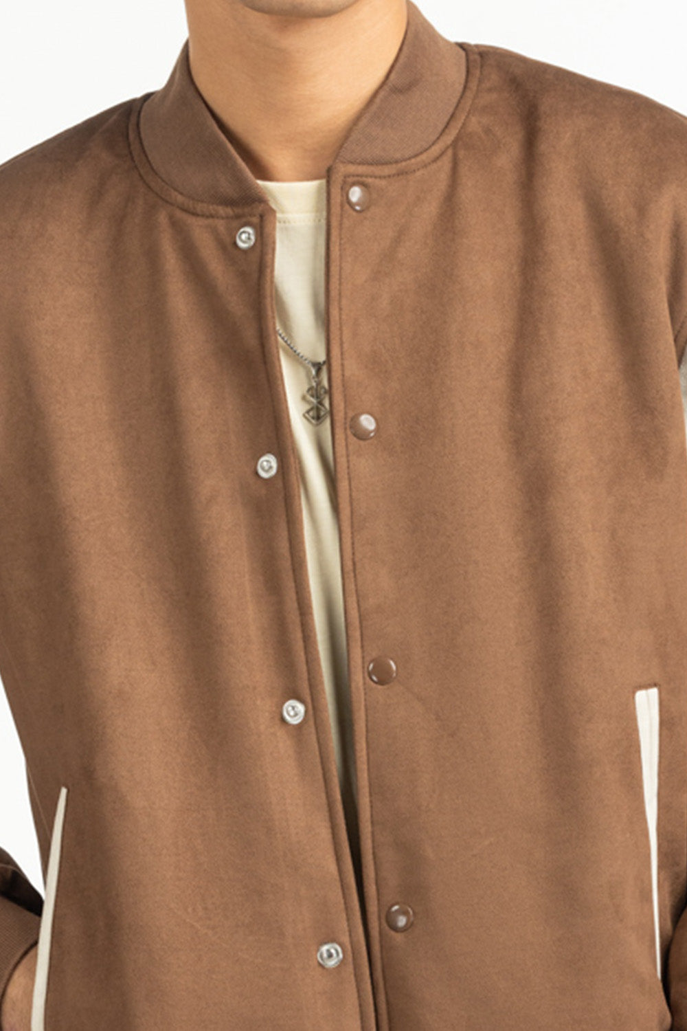 Tailored in supple suede with a buttoned front, this brown jacket hits the sweet spot between rugged charm and urban polish. The band collar adds a crisp frame to the neckline, while the unctional pockets meet smooth craftsmanship. Perfect for layering in throughout winters.