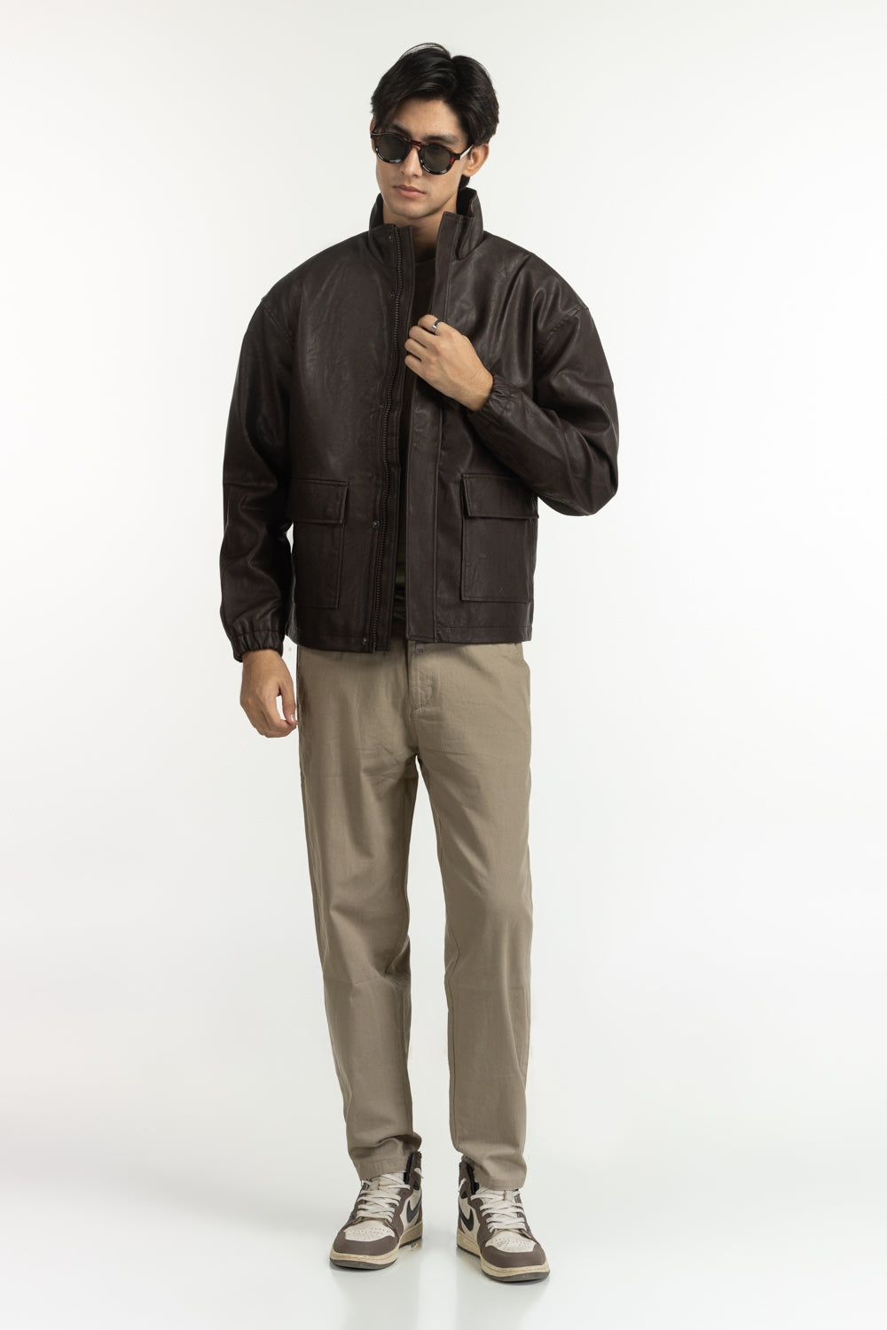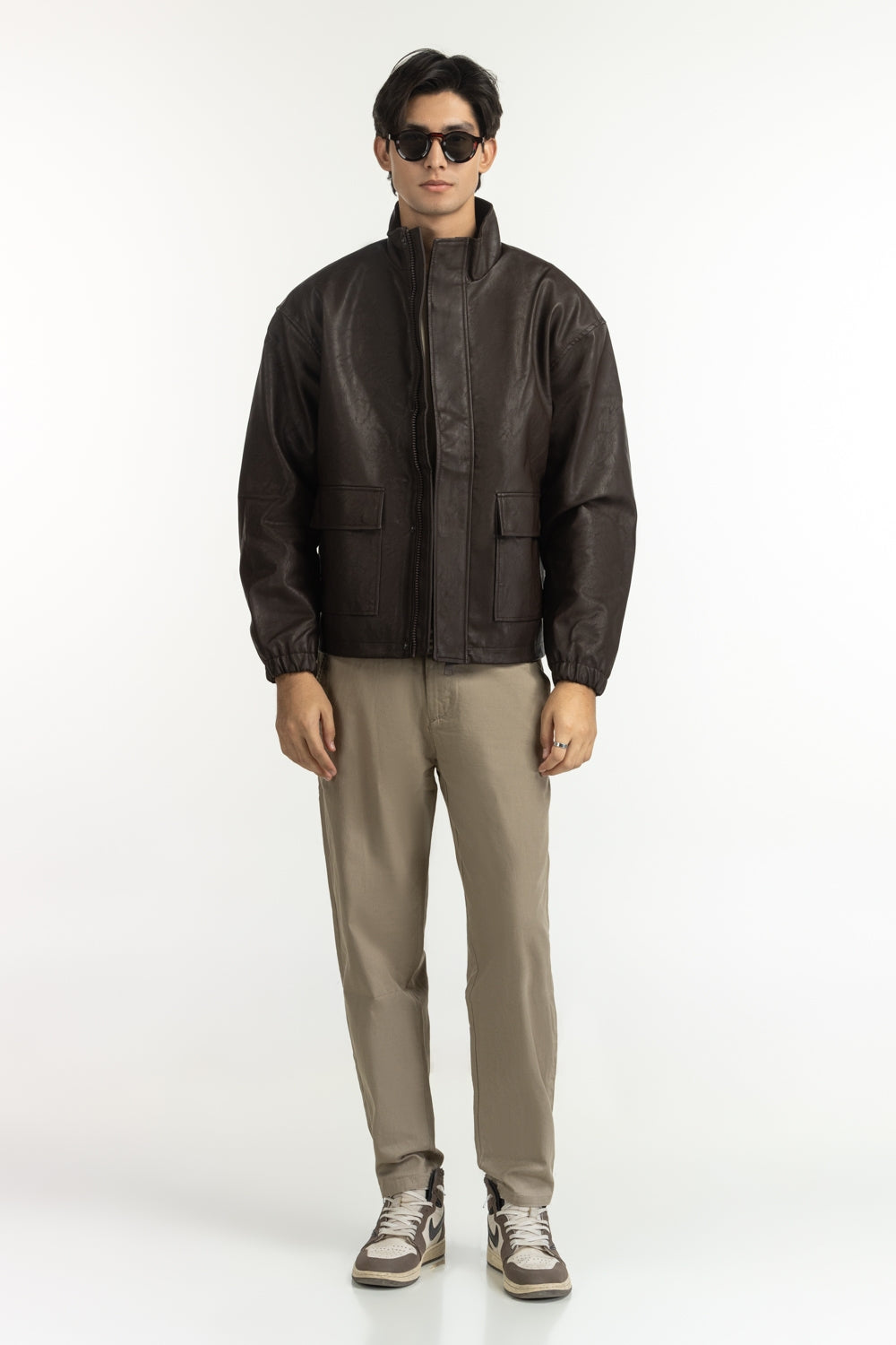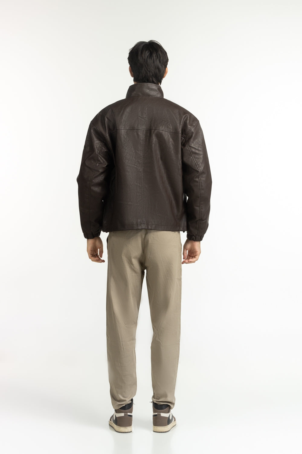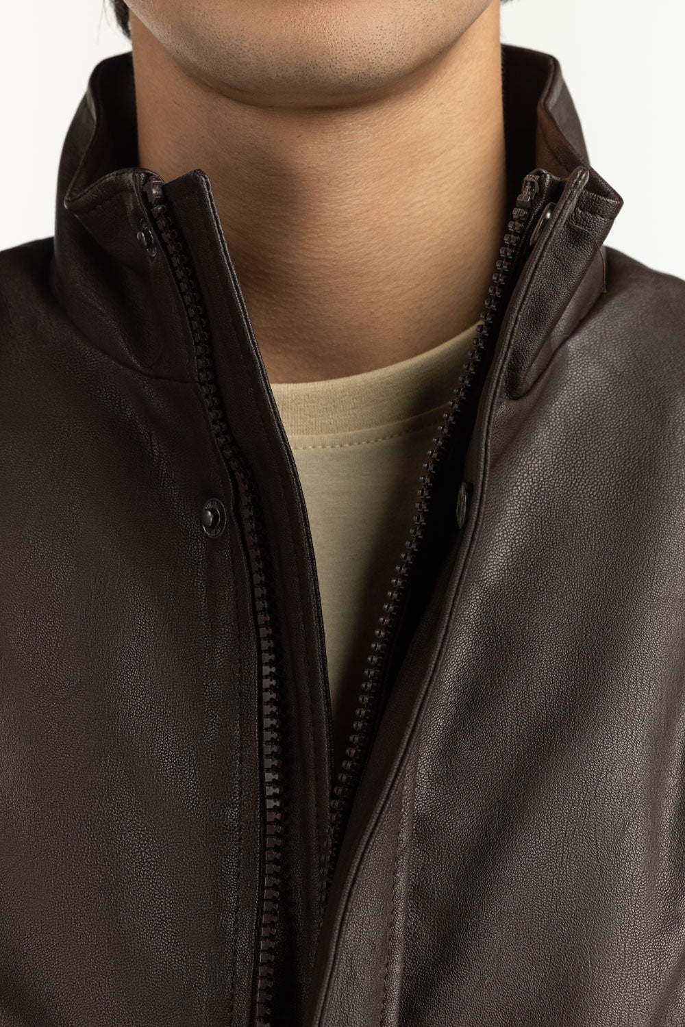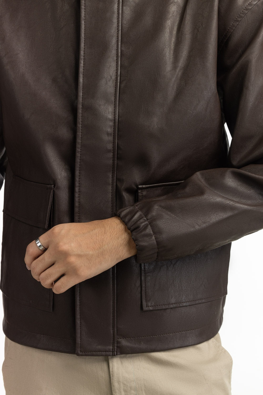 A statement in structure and tone, this jacket redefines winter layering. The high neck collar provides a sleek shield against wind, complemented by two flapped pockets for on-the-go practicality. Crafted from fine faux leather, it delivers a polished sheen and durable wear.