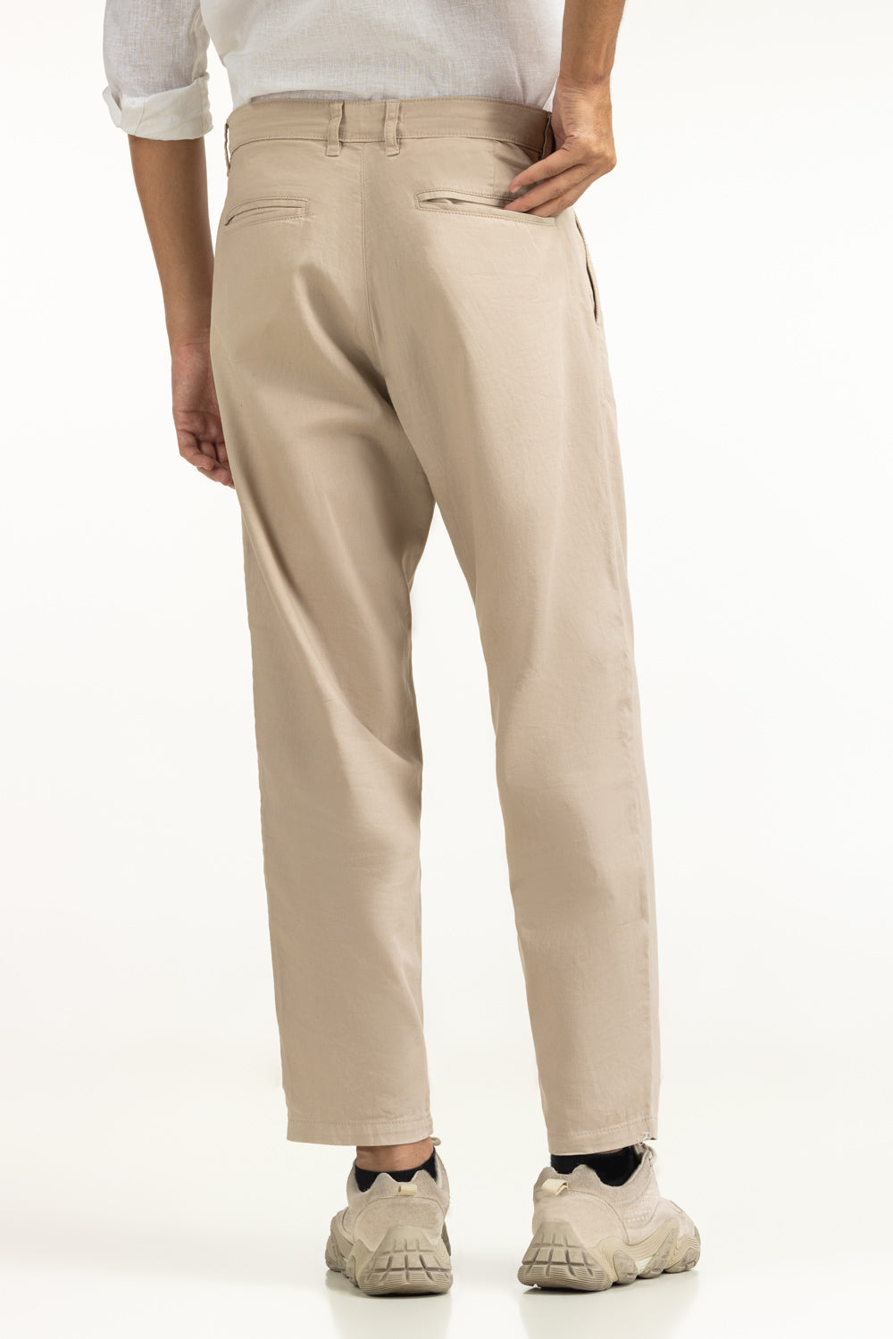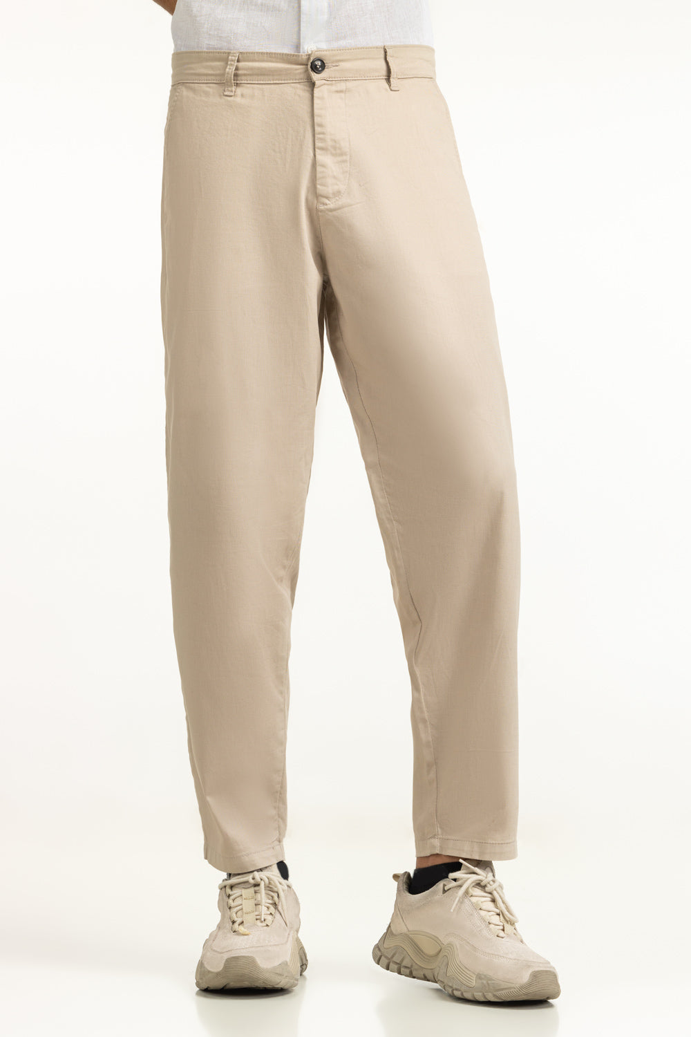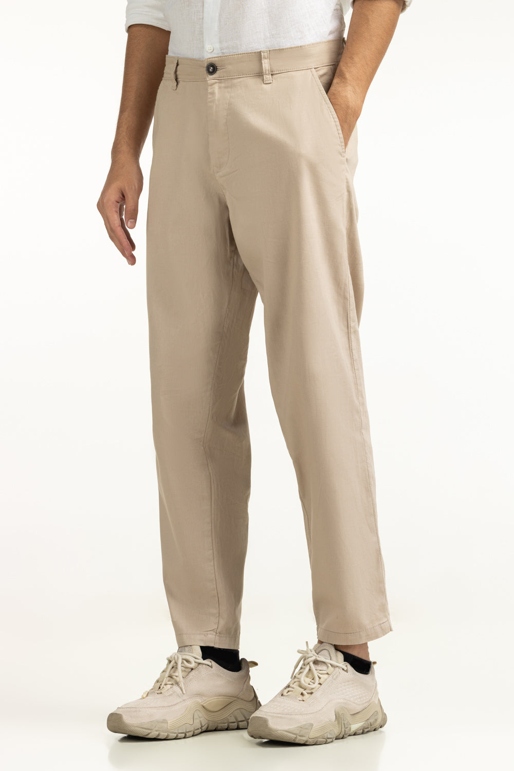 90%Cotton 10% Linen These beige trousers redefine minimalism with a crisp, tailored silhouette that speaks of quiet sophistication. The airy fabric offers a breathable touch, ideal for long hours in summer. Its regular fit design allows unrestricted movement while keeping a refined edge. A wardrobe essential for men who value subtle elegance with functional purpose.