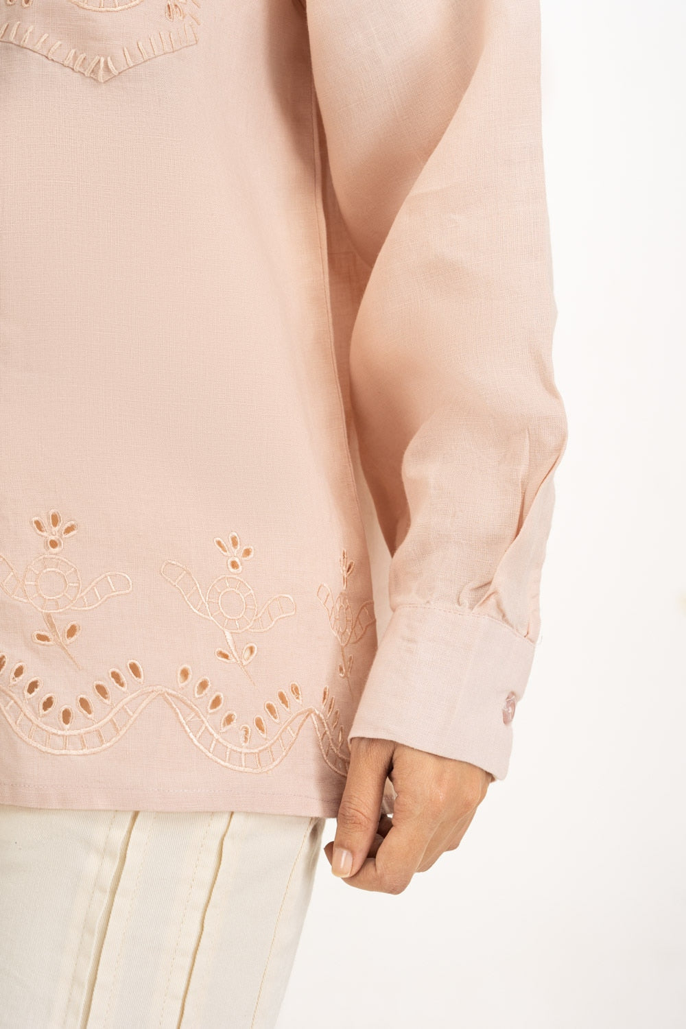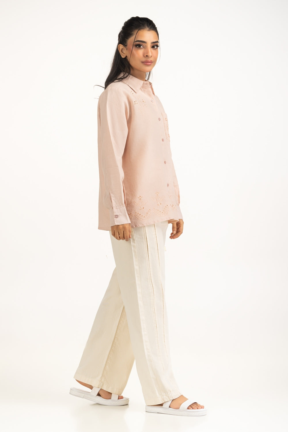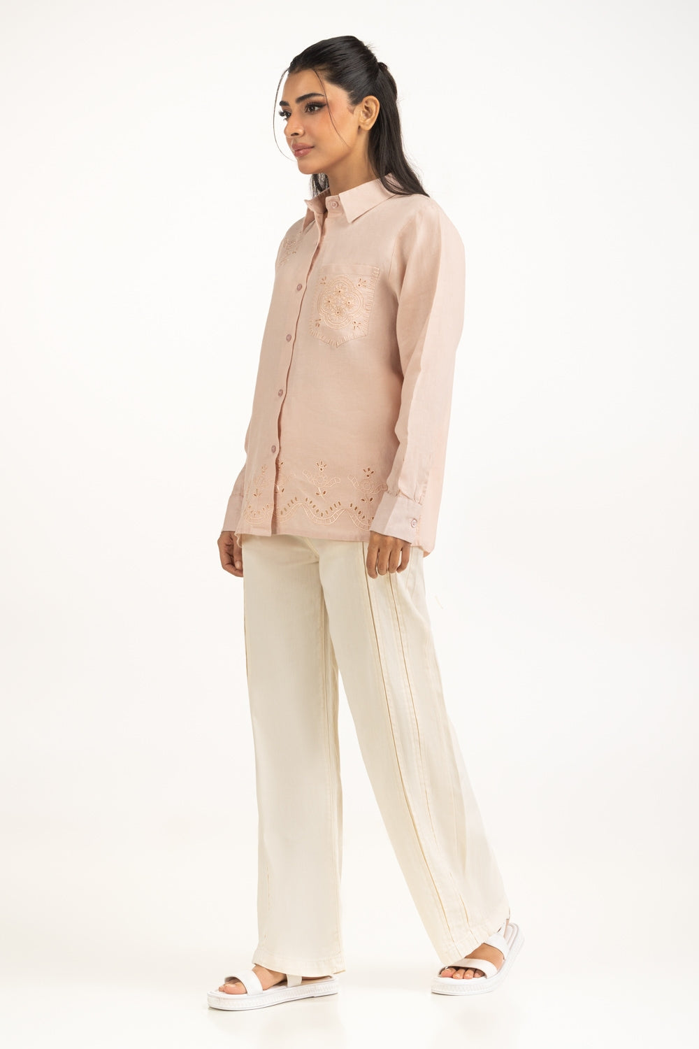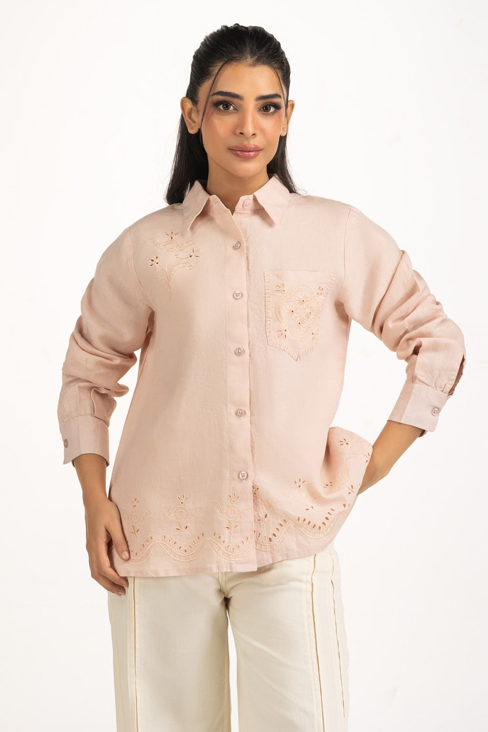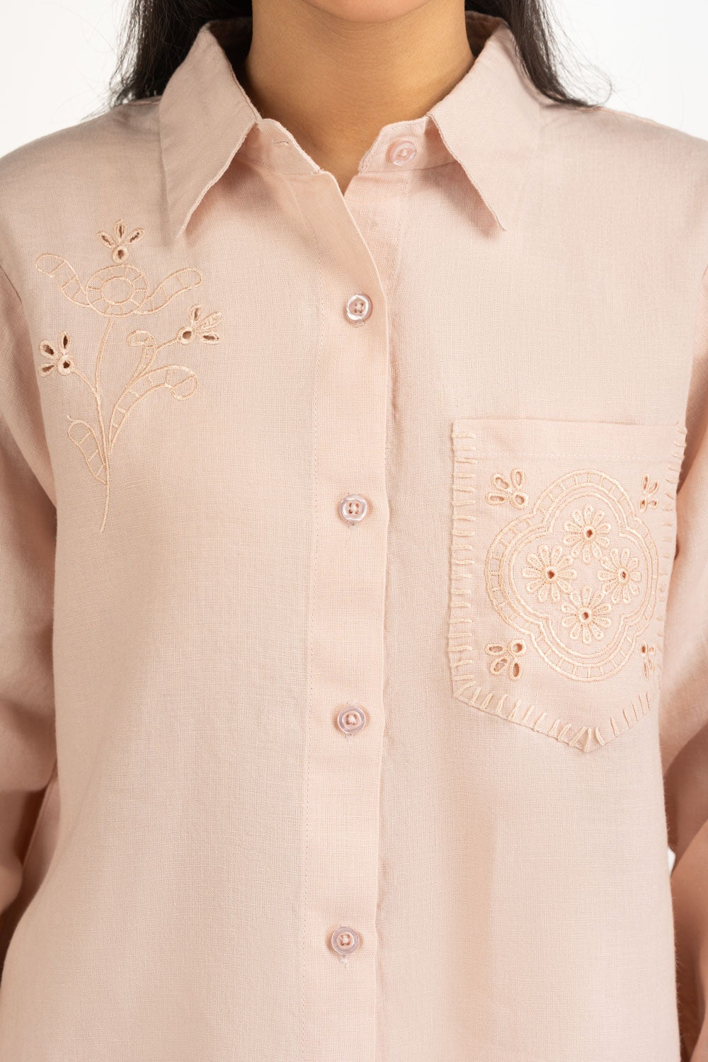 Youthful and chic, this embroidered button-down shirt is made to redefine casual dressing. Its front pocket adds functional appeal, while the soft peach shade paired with light fabric makes it a cool and comfortable summer essential.