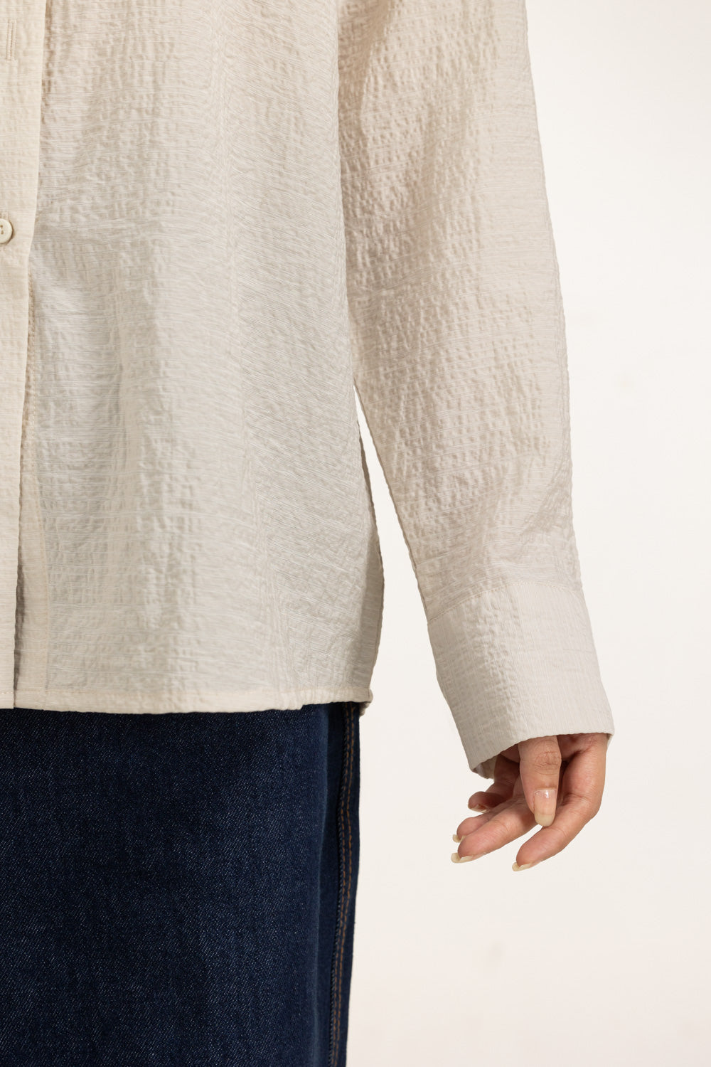 This beige button-down shirt features a unique crinkle texture that adds depth to its regular-fit silhouette. Designed for modern comfort, it offers easy movement while maintaining a refined edge. Pair with loose trousers for a chic, winter-ready look.