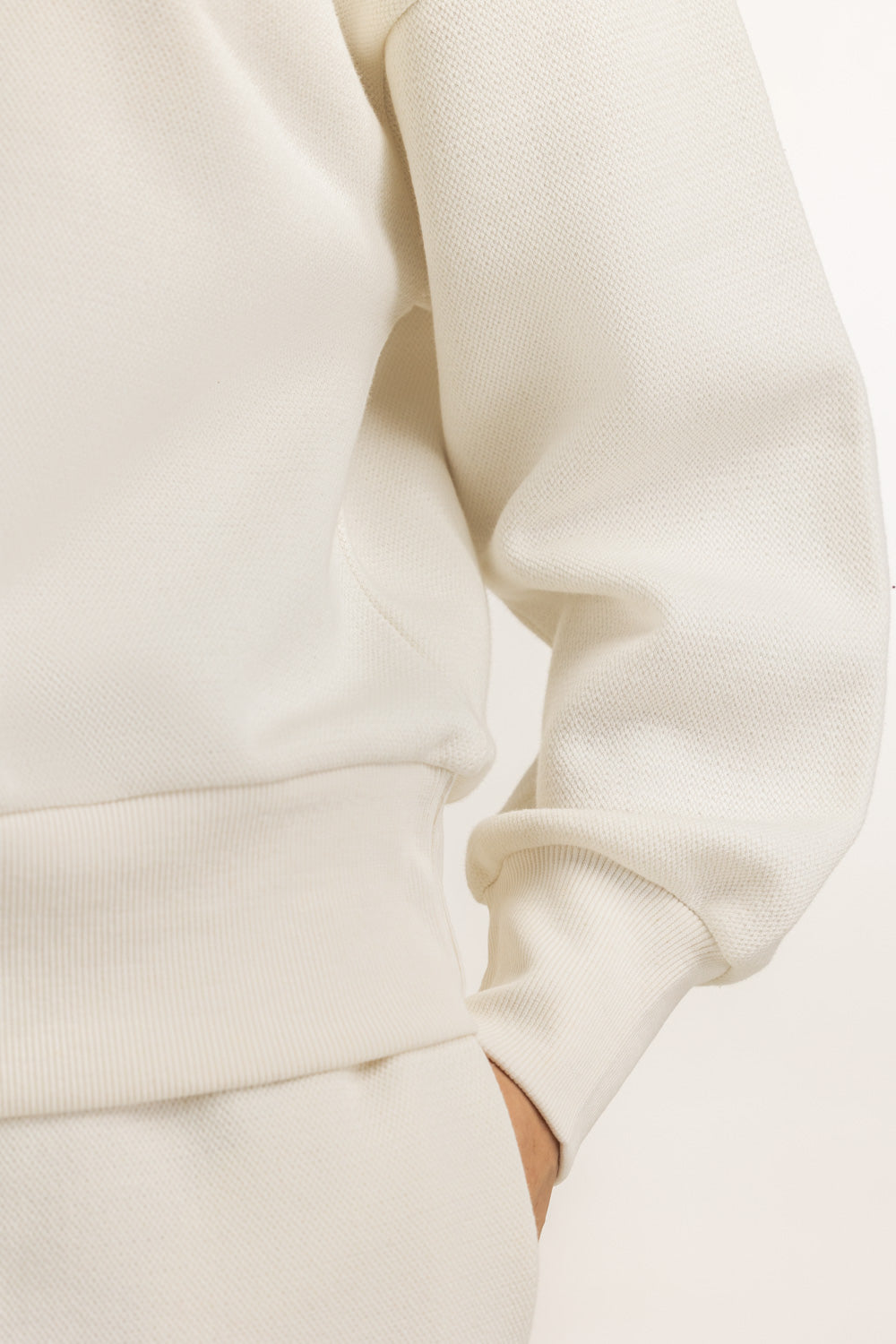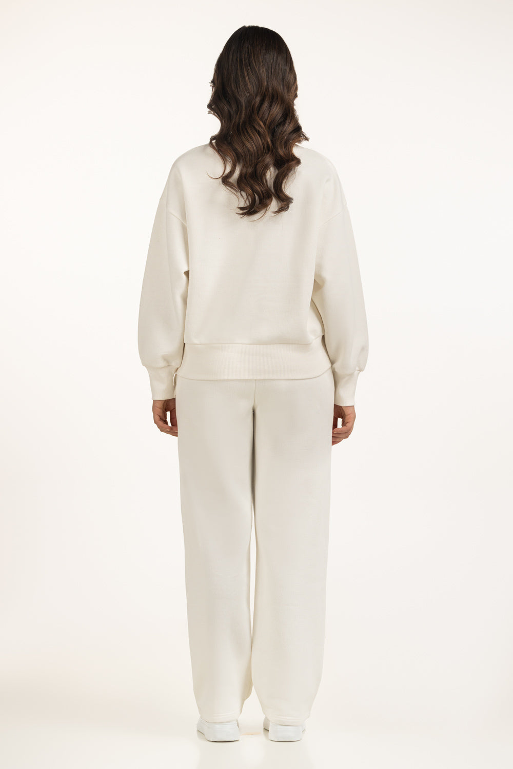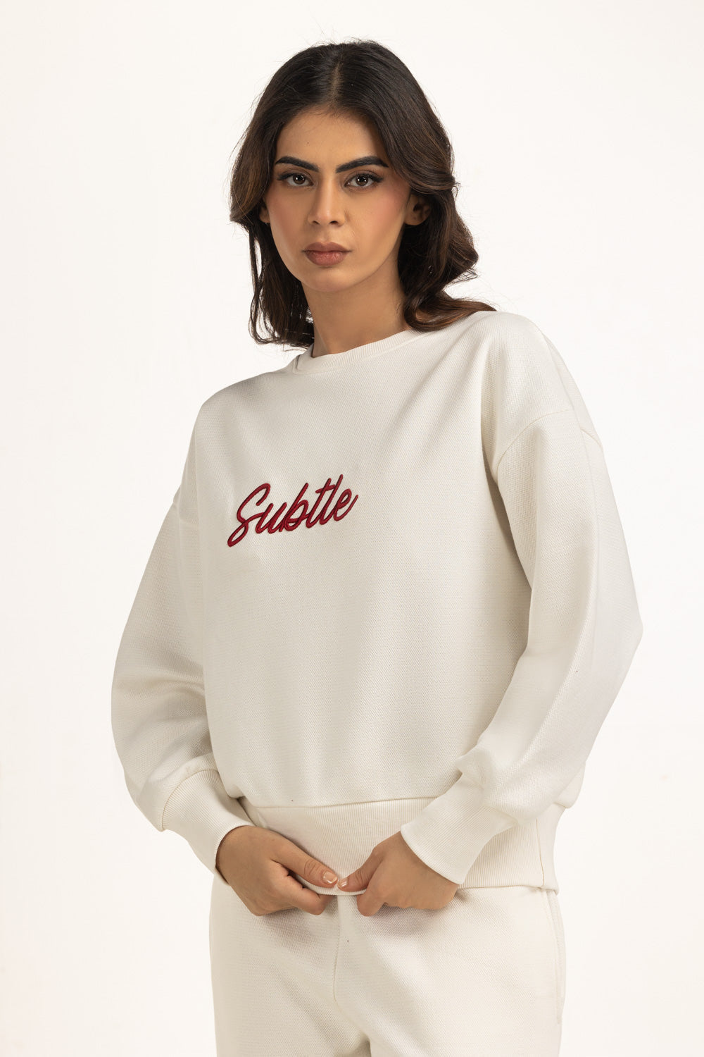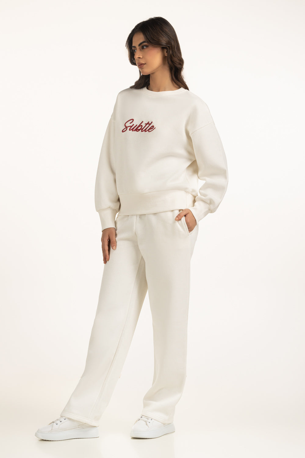 Crafted in a pristine white hue, this knitted Co-Ord set brings a modern spin to winter dressing. The sweatshirt is adorned with delicate embroidery on the front, while the regular fit ensures comfort without losing sharpness.