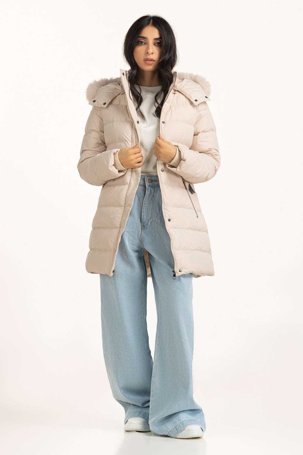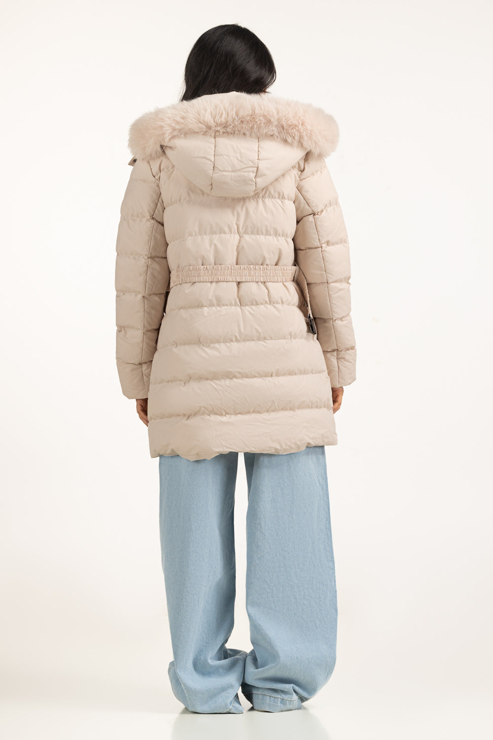 This long puffer jacket merges high-fashion with a distinctive youthful vibe. The inclusion of front zipper and an adjusting belt, secures the fit the way you want. Comes with a detachable furry hood, making it a versatile for contemporary layering.