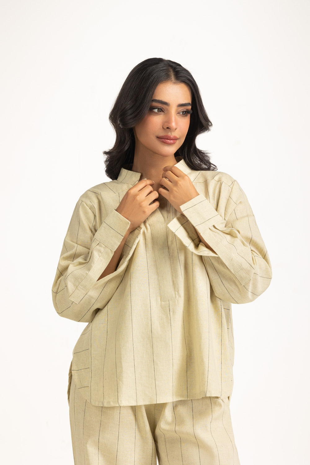 This pin-striped shirt in a soft hue brings elegance to everyday casual wear. The Ben collar with a V-neckline adds a modern twist to its refined design. While the slit sleeves create breezy movement, perfect for effortless summer styling.