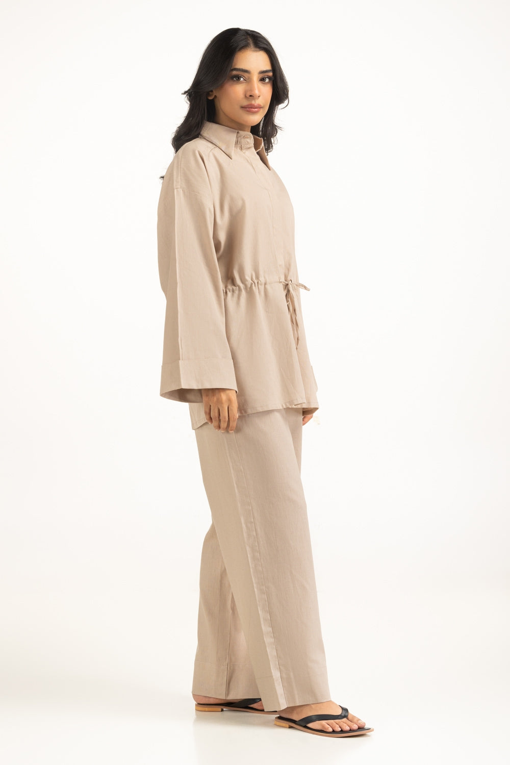 In a muted khaki hue, this shirt defines understated elegance. The shirt collar and adjustable strap merge timeless tailoring with contemporary flair. Its button-down front allows styling freedom, while the breathable fabric, makes it a perfect pick for warm days.
