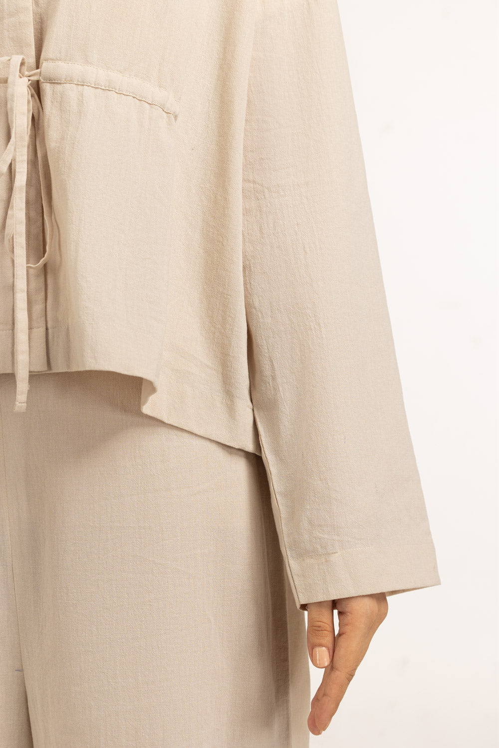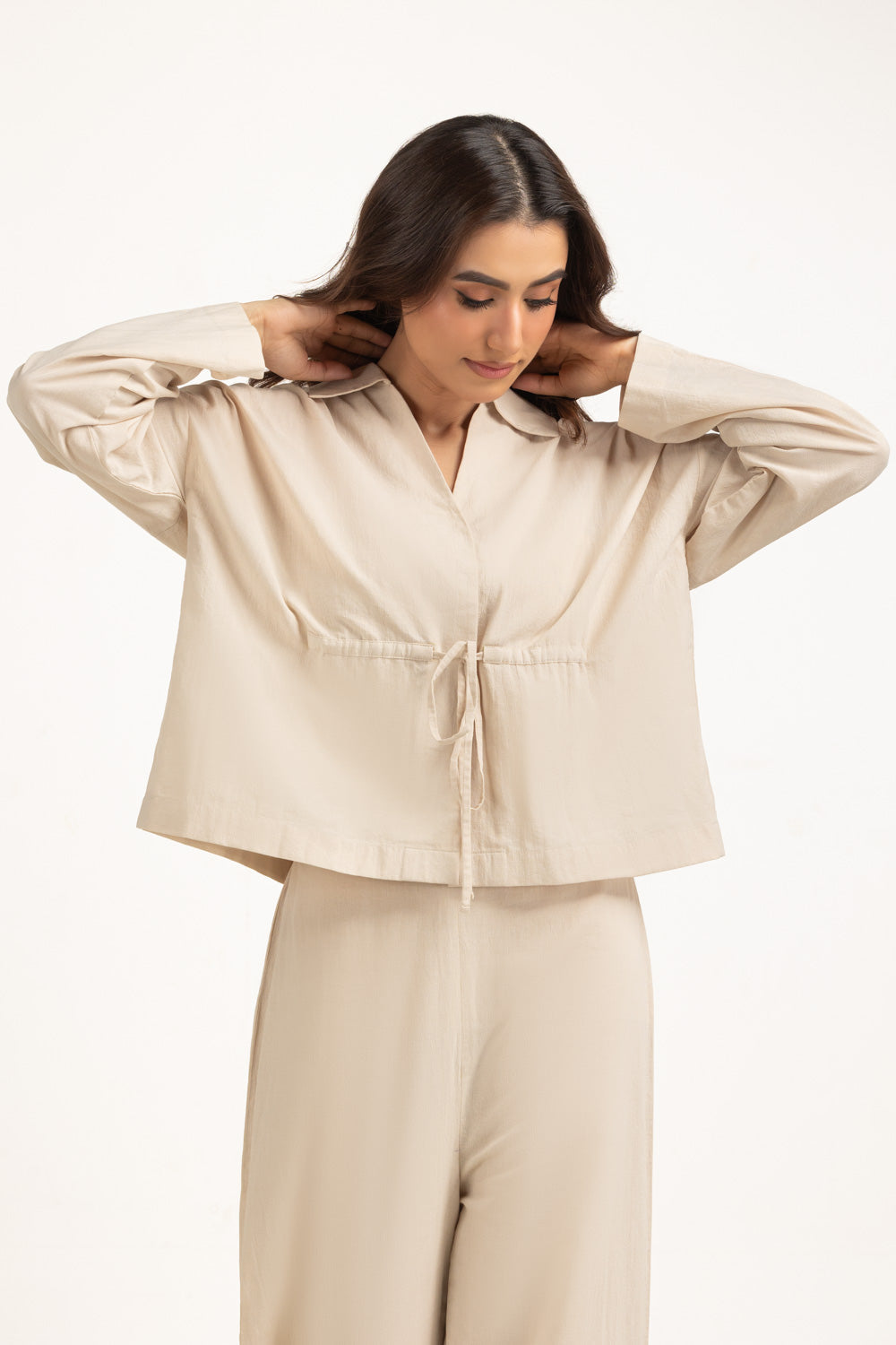 Structured yet relaxed, this crinkle-textured top is tailored in a cotton-linen fabric that defines quiet luxury. A shirt collar with the V-neckline highlight its refined details, making it perfect for modern-day styling.
