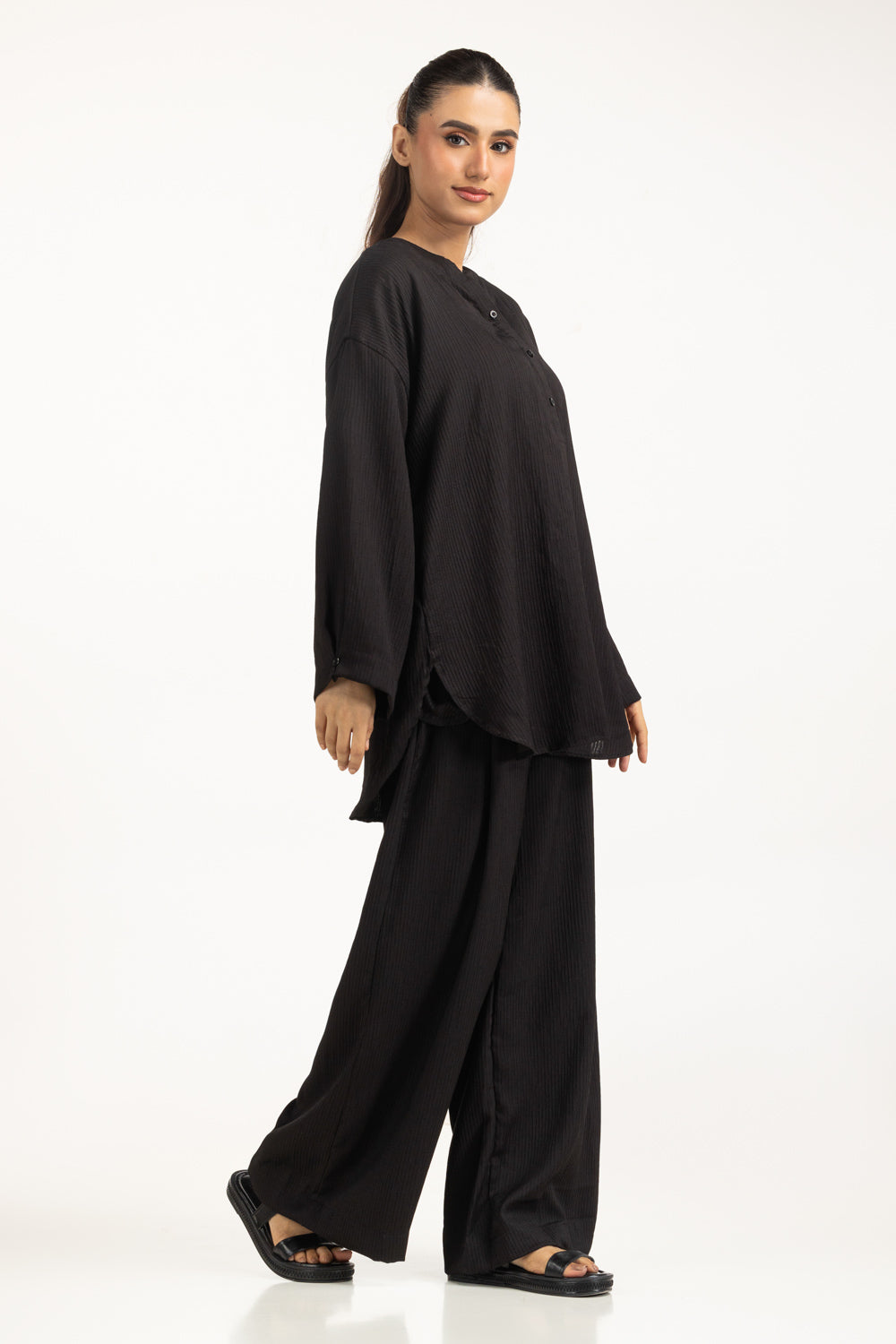 The textured fabric in deep black brings depth to this contemporary winter essential. Featuring a round neckline with neatly placed buttons, it speaks of refined minimalism. Functional yet chic, it pairs effortlessly with the matching trousers for the everyday casual look.