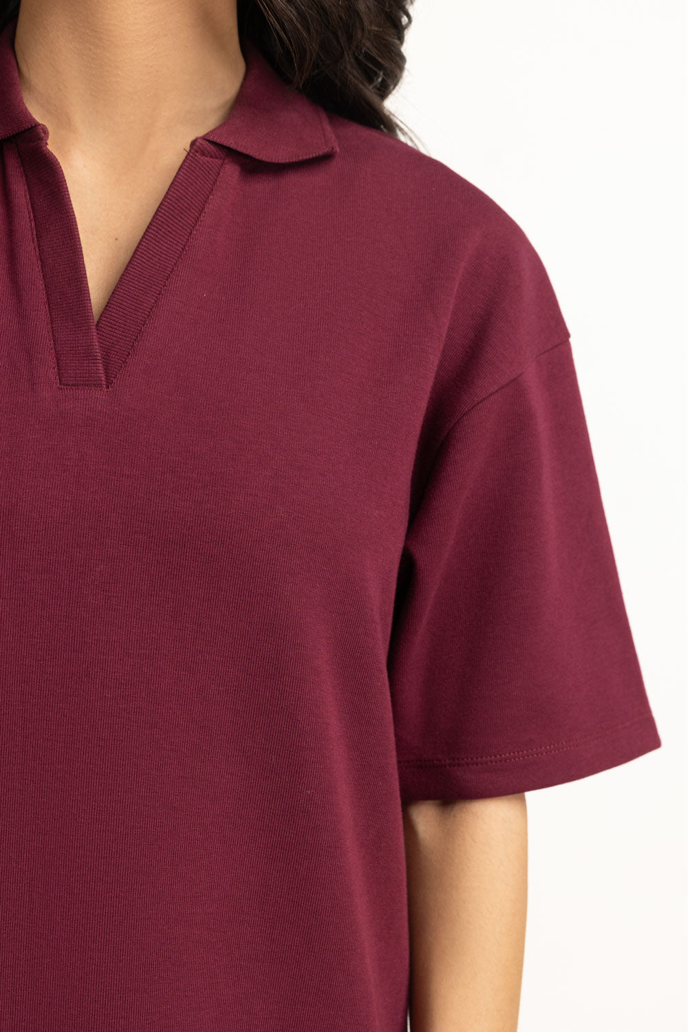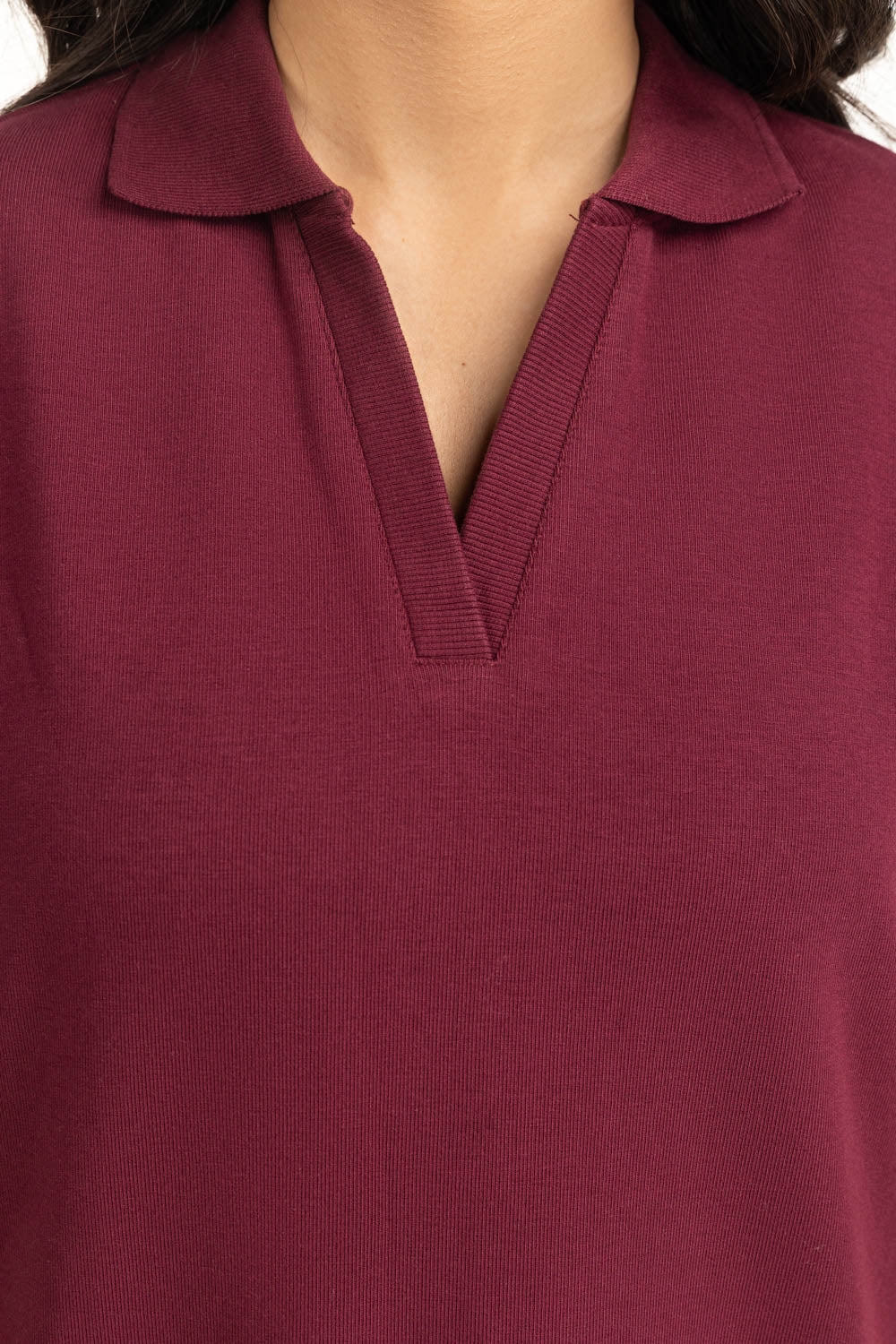 Styled with modern-day aesthetics, this dress in a deep, bold hue redefines a chic winter look with its side-slit design. The structured collar offers a polished contrast to its relaxed cut, adding balance and elegance.