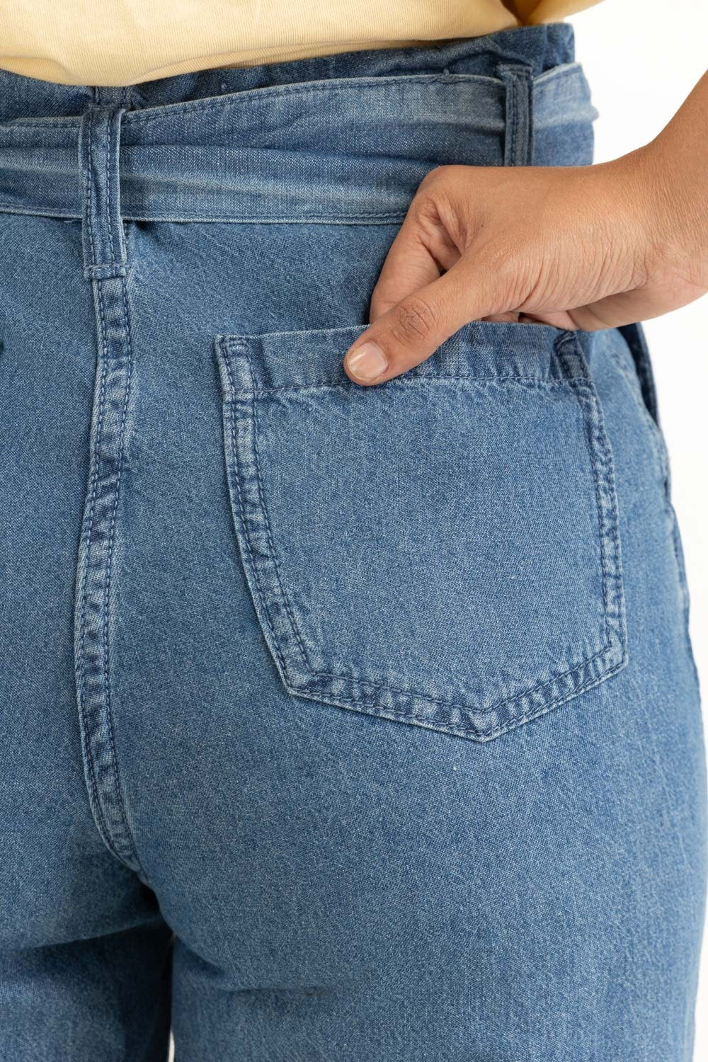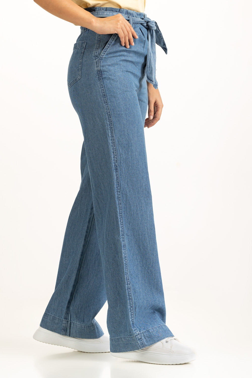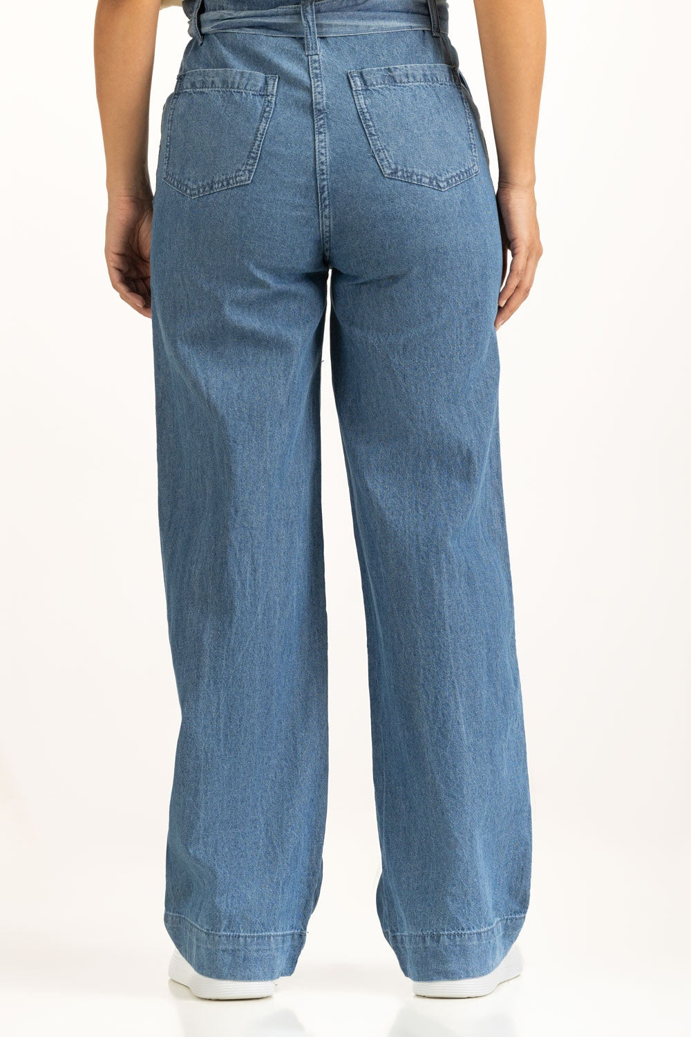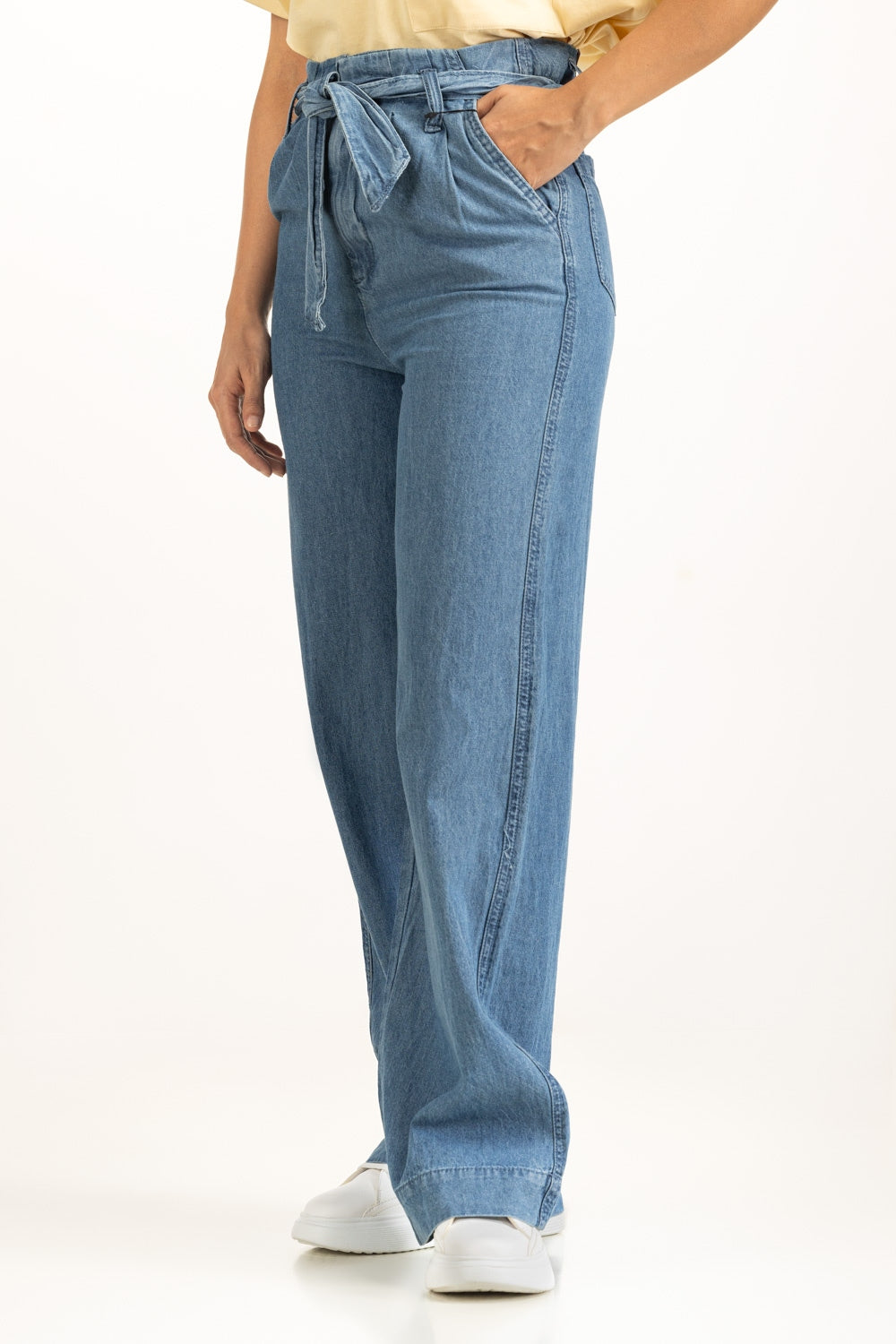 These denim trousers offer a relaxed wide-leg fit with a sleek, youthful silhouette. The soft light-blue shade is perfect for pairing across summer outfits, and the belt adds subtle definition. Its 100% cotton weave ensures comfort for all-day wear.
