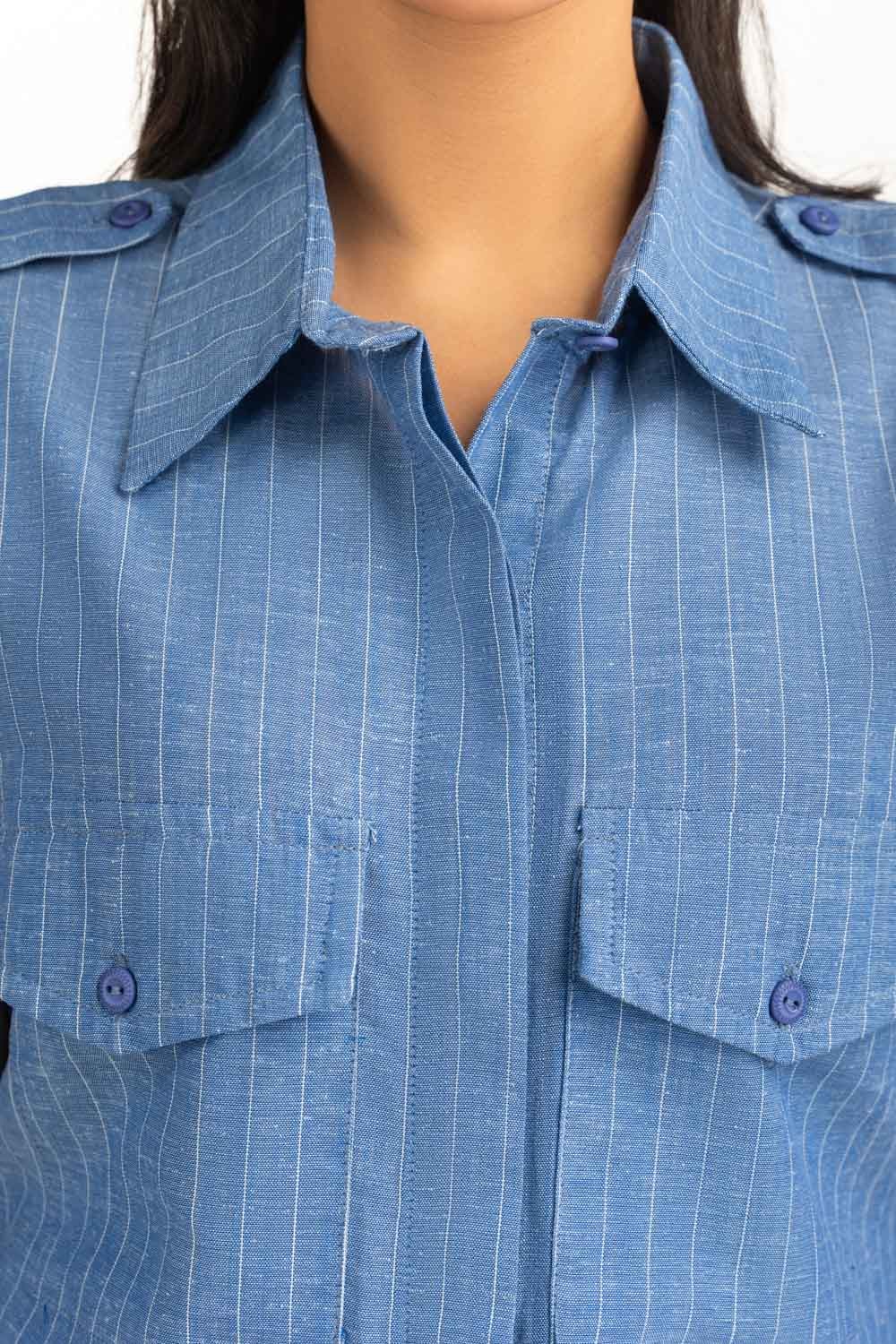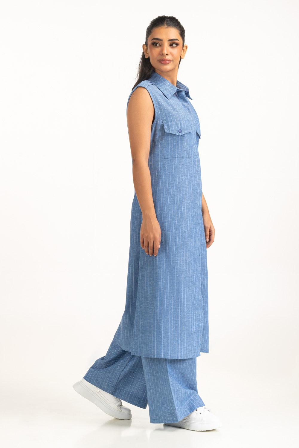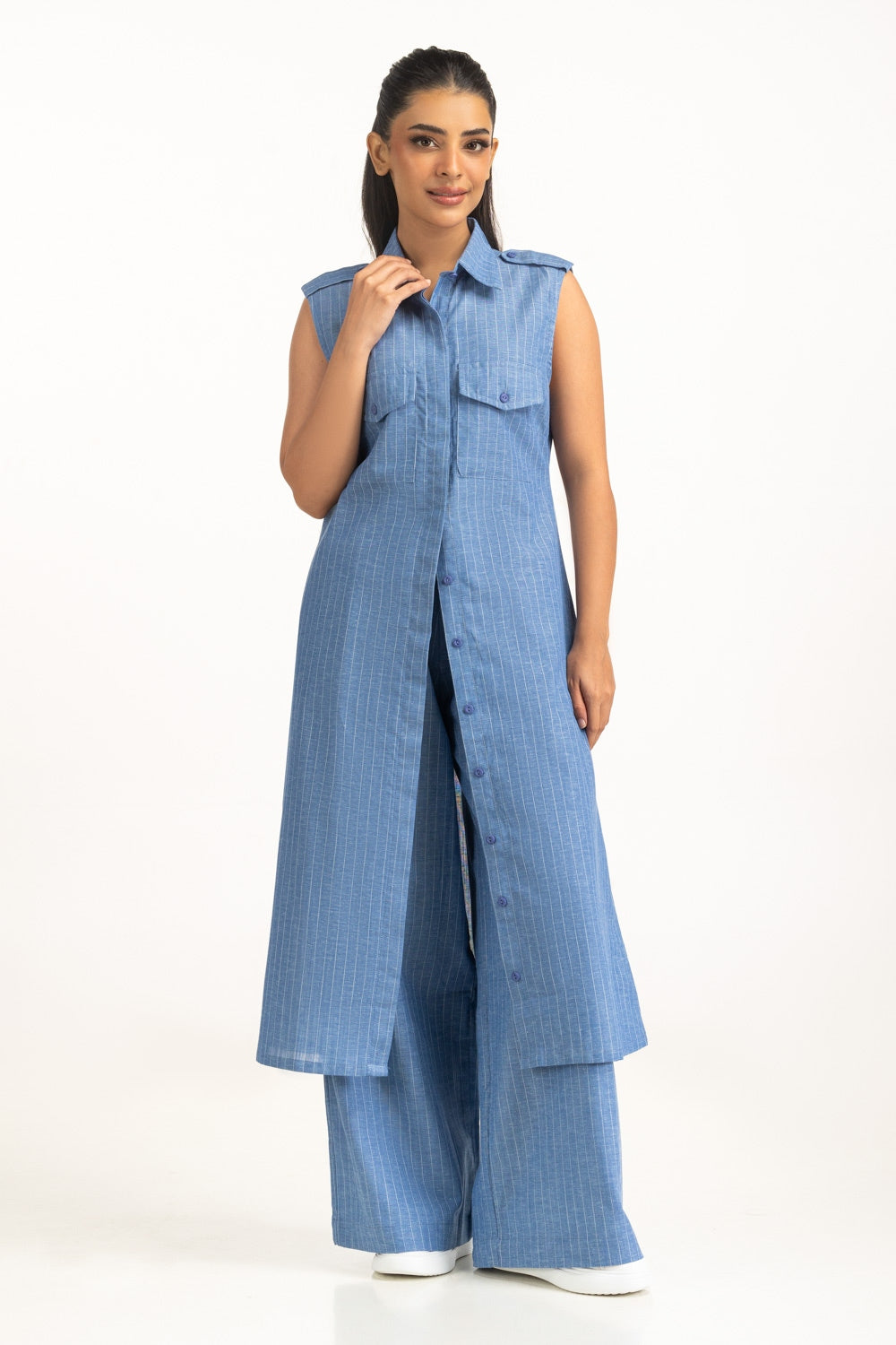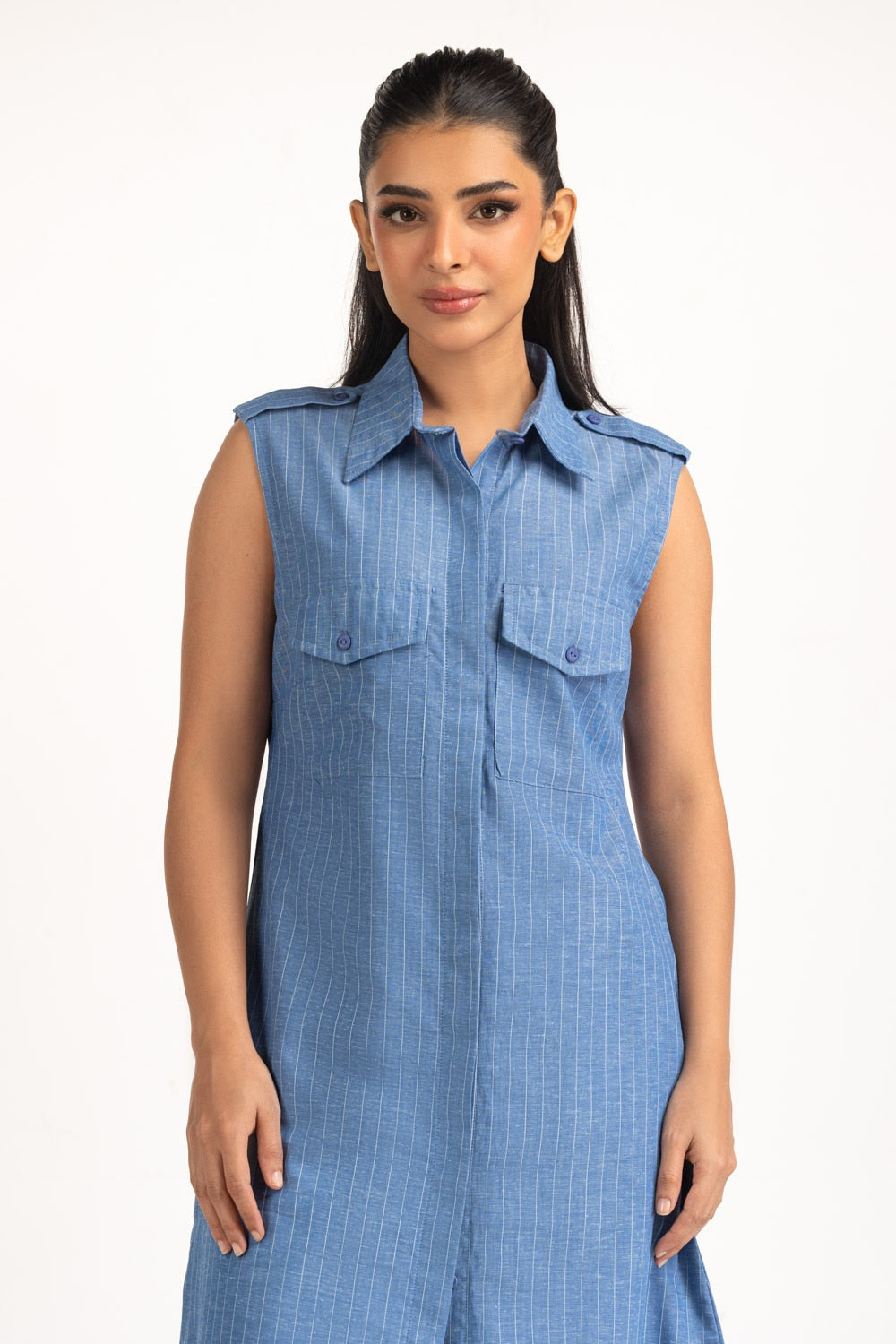 A minimalist take on casual elegance, this pin-stripe dress features a sleek silhouette with a button-down front. The front pockets adds functionality while keeping the design chic and breathable.