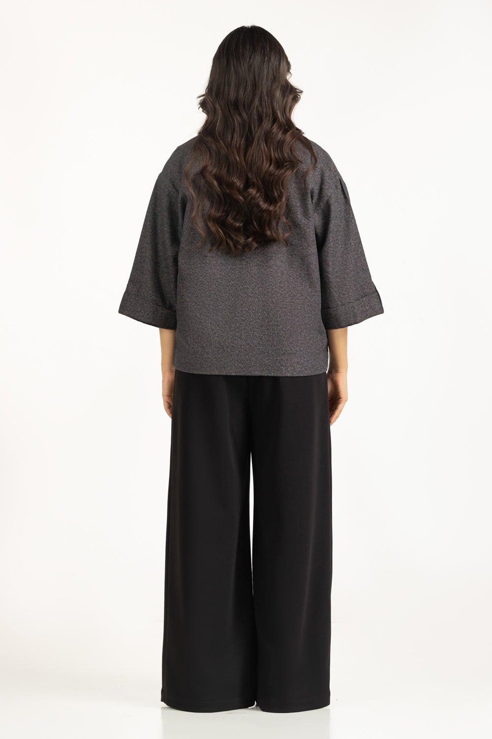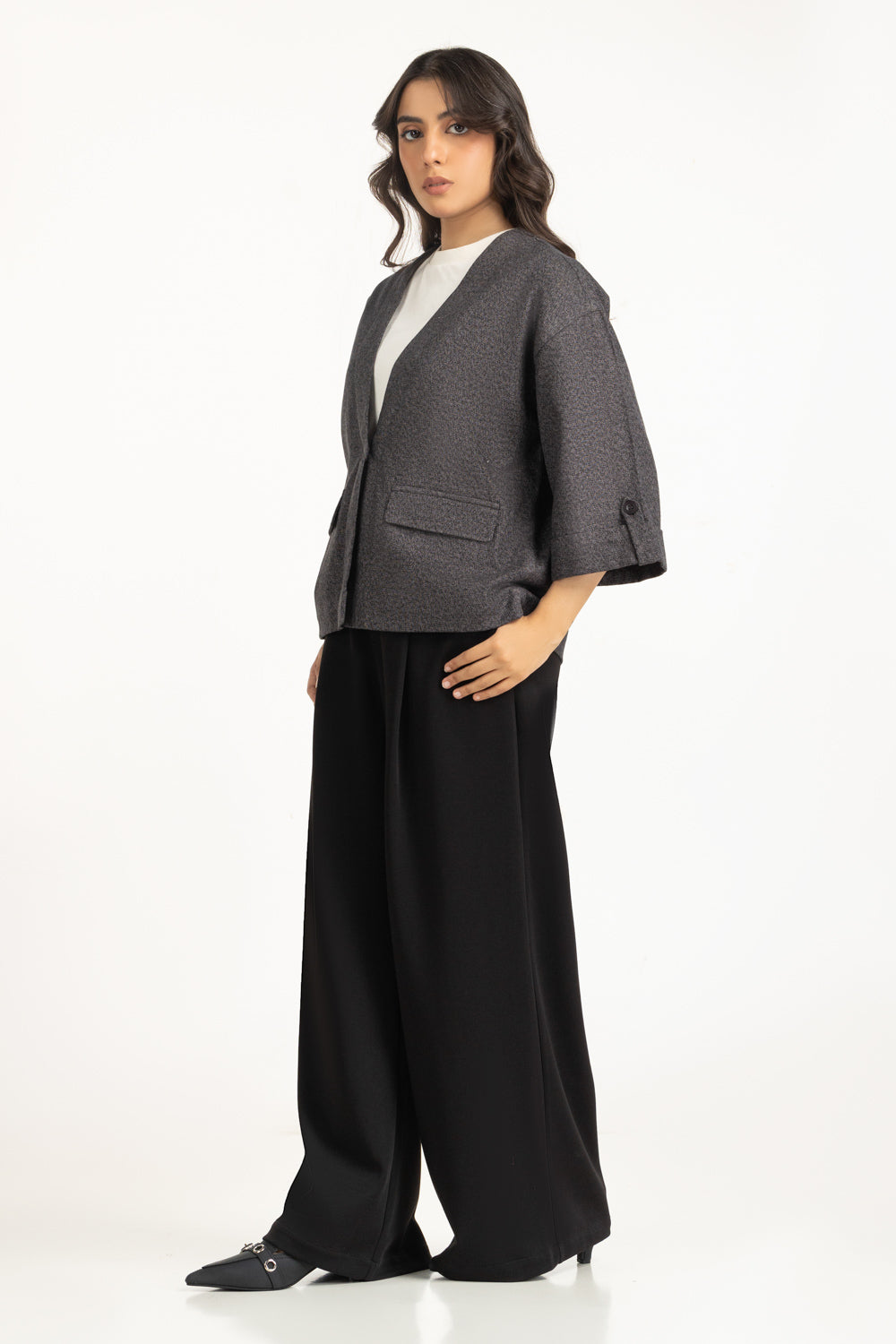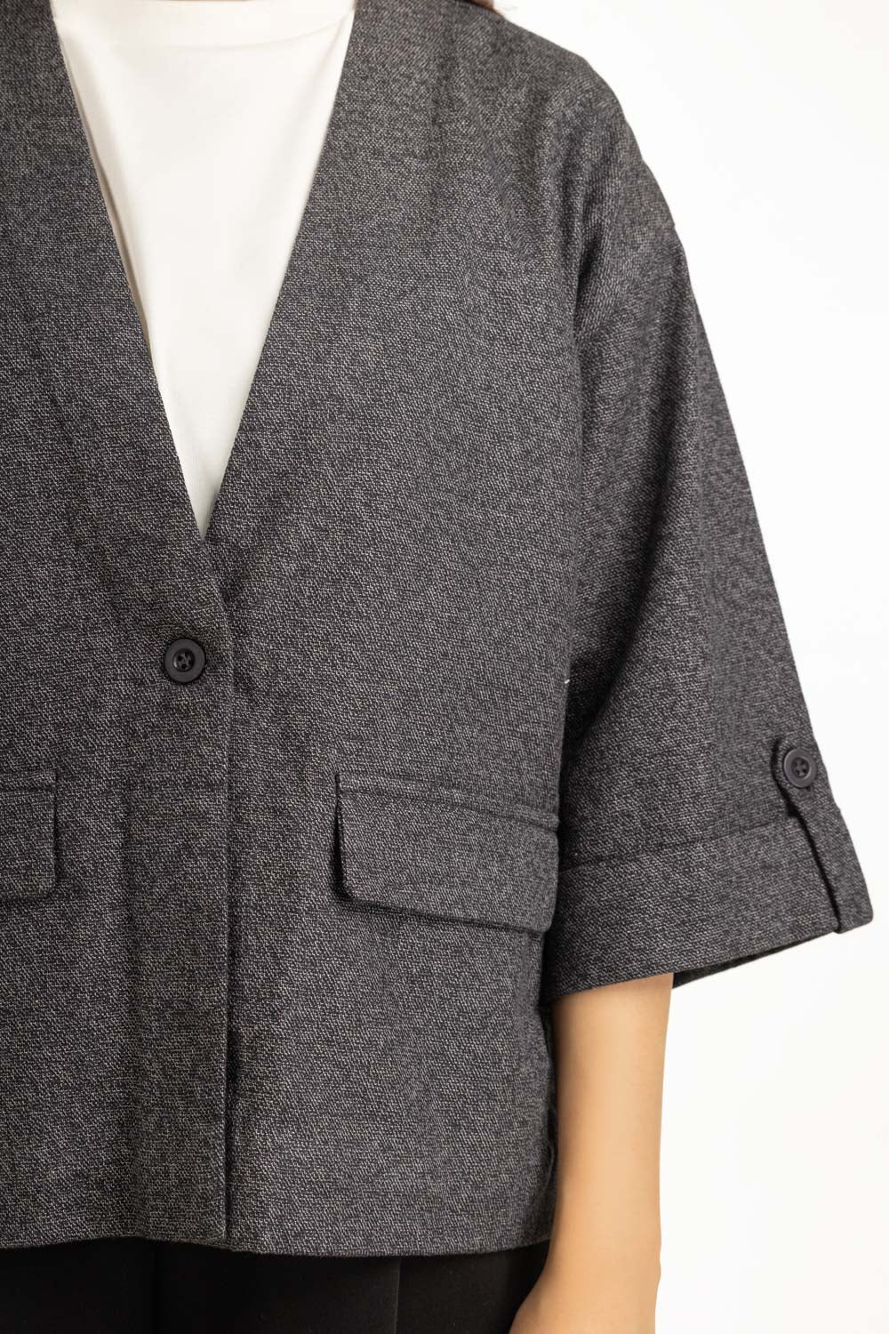 In a deep charcoal color, this textured jacket combines timeless structure with contemporary ease. The V-neckline and front pockets add subtle definition, making it perfect for layering over every day basics.