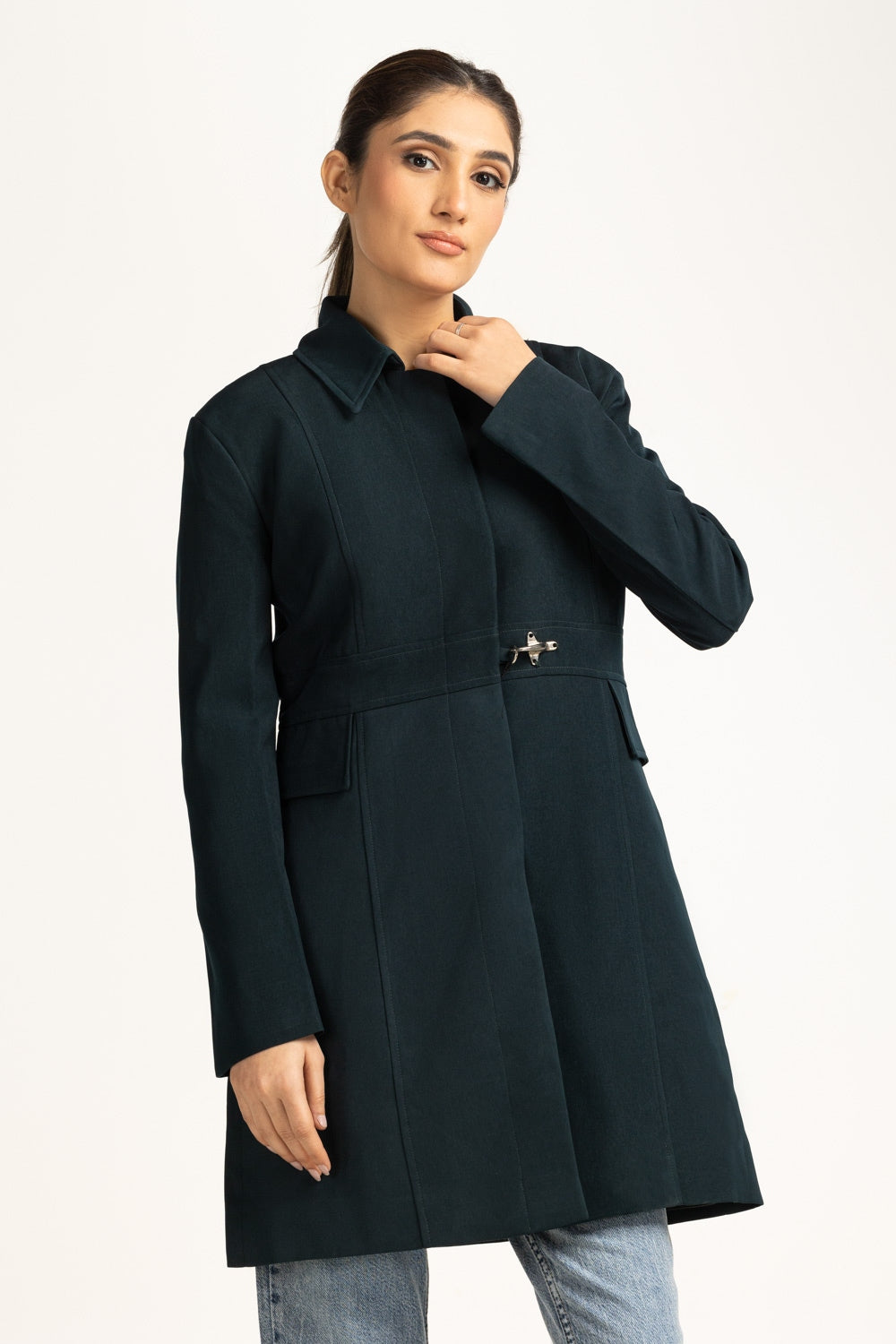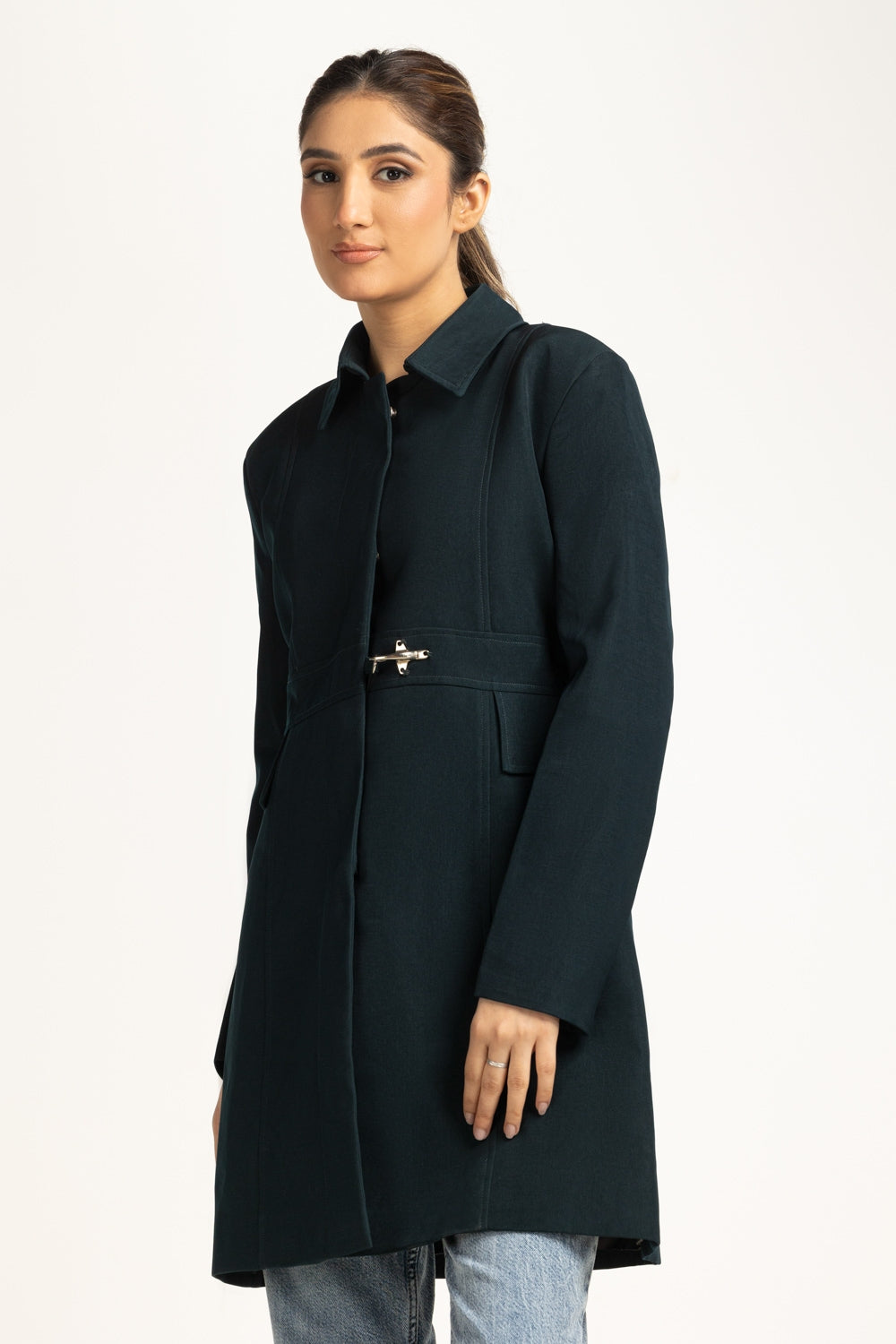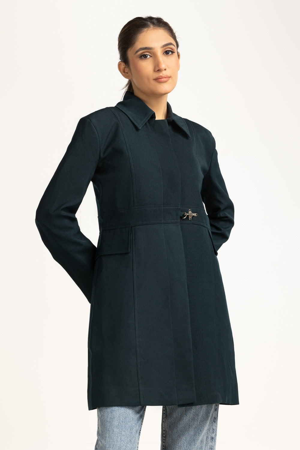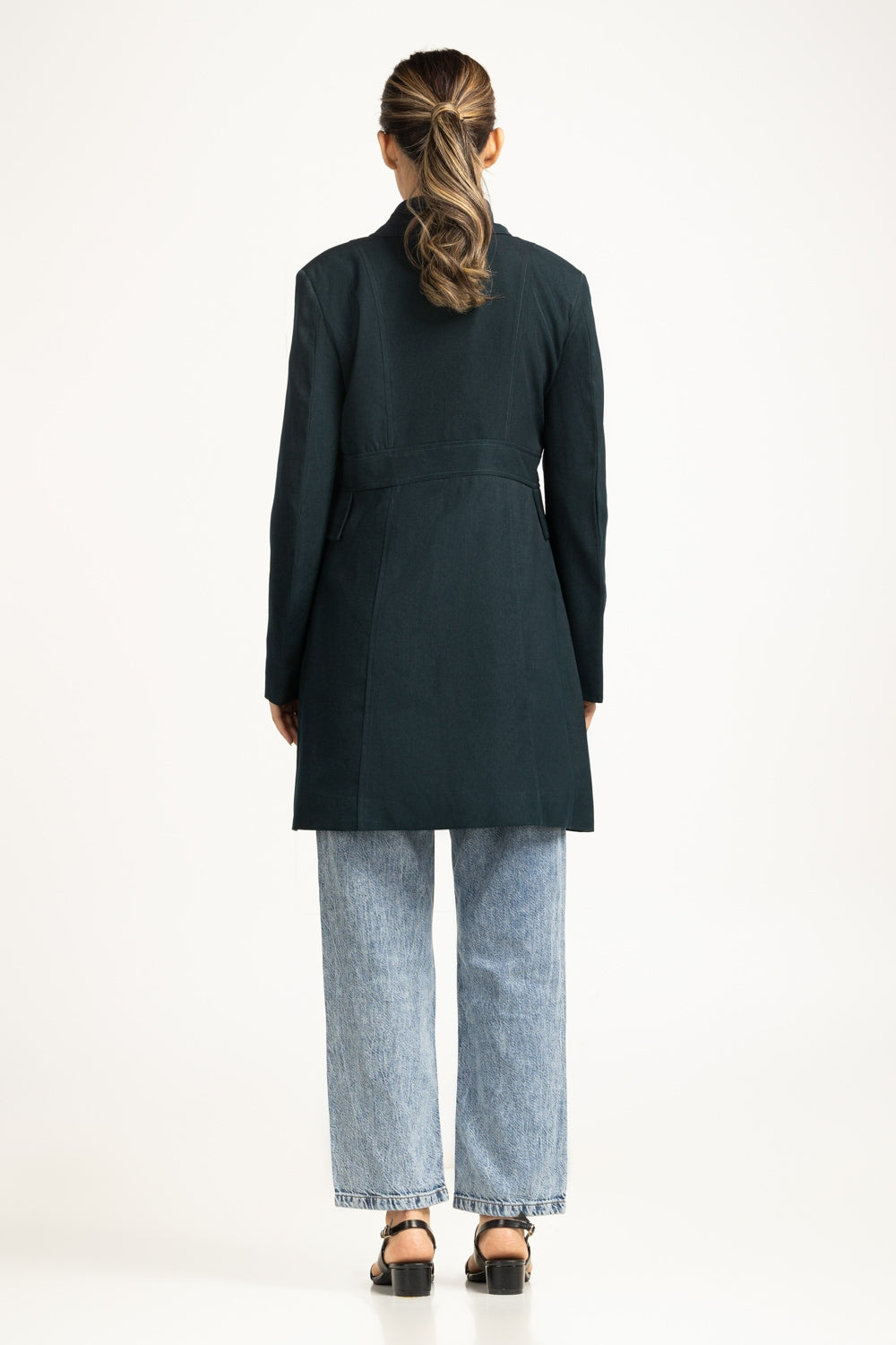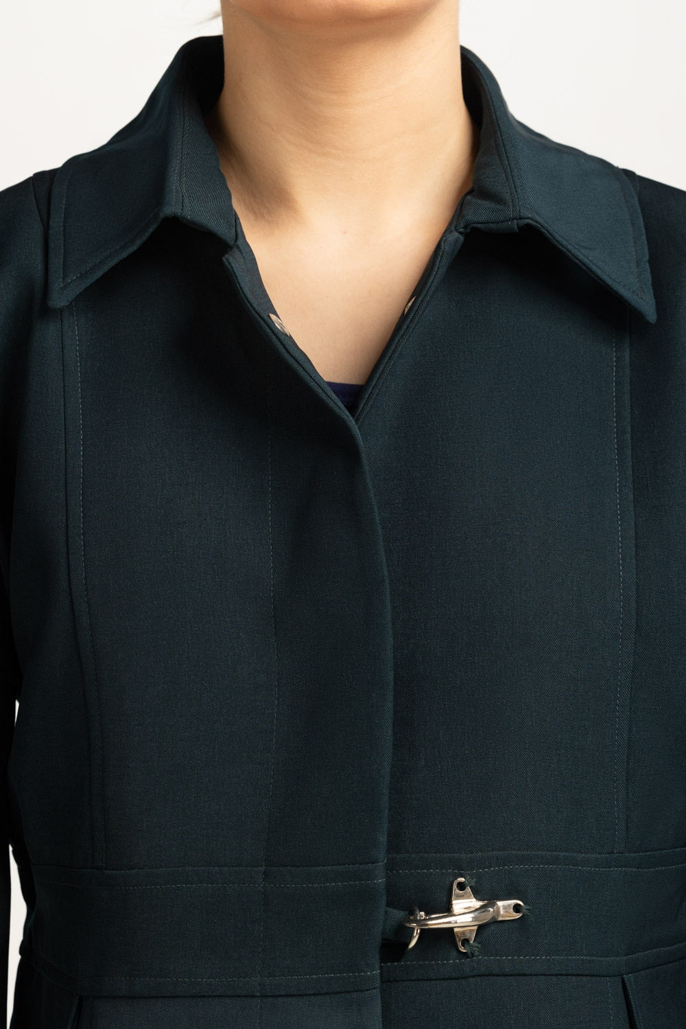 A tale of minimalism meeting modernity, this front-open jacket in a sleek silhouette is accented by a statement metallic hook, adding a contemporary edge. Lightweight yet structured, it’s ideal for layering over dresses or tailored separates. A refined piece for effortless sophistication.