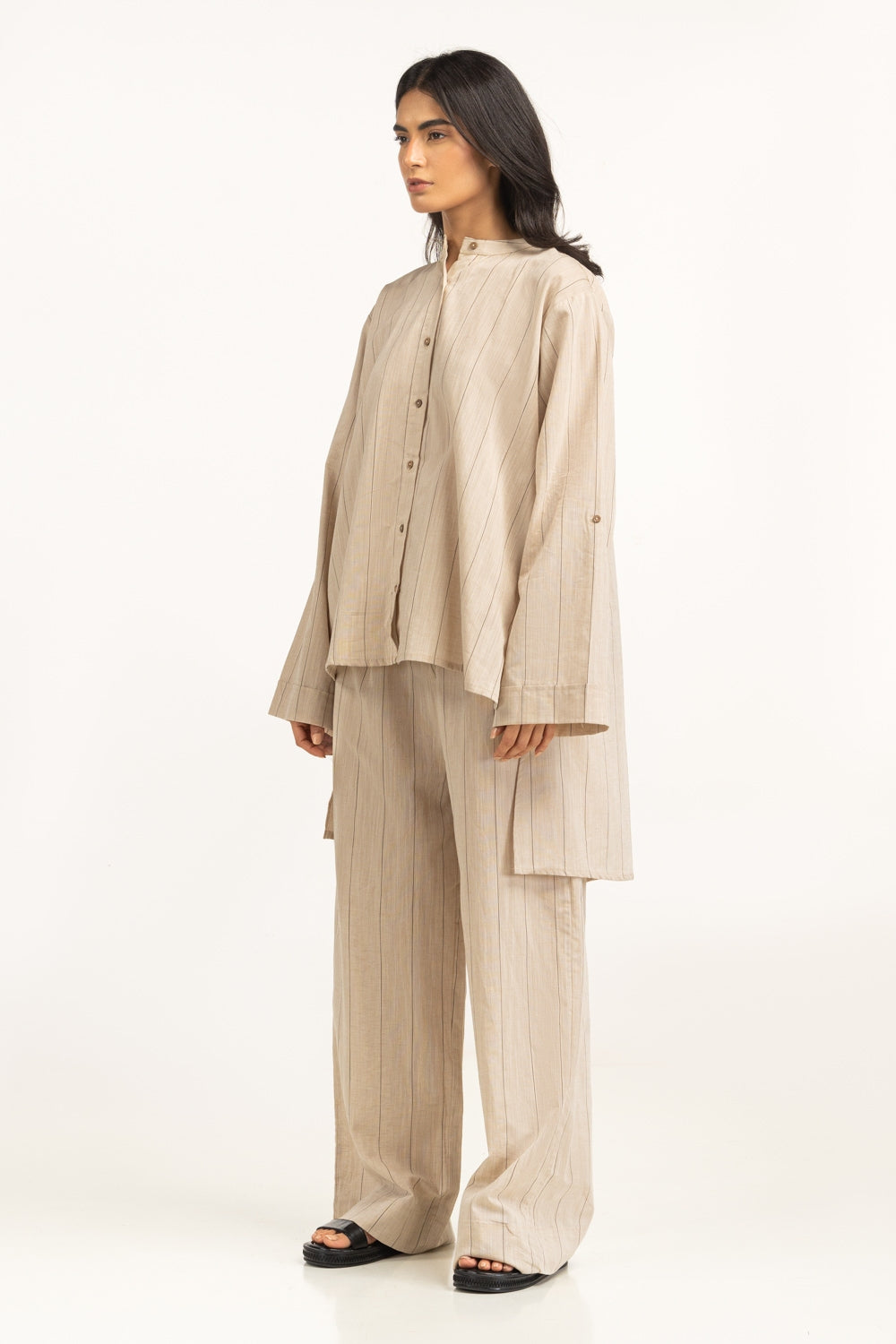 With its sharp stripes and an elongated back hem, this khaki shirt is a summer staple offering...