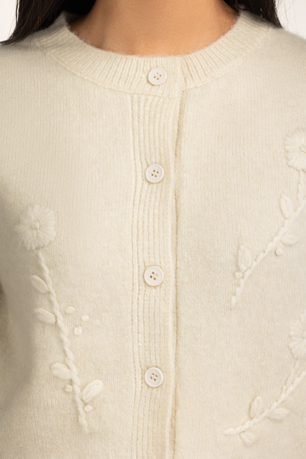 Crafted with finesse in a creamy off-white hue, this sweater pairs softness with structure. The crew neck frames the silhouette, while the floral accents on the front add a refined feminine touch. Offering versatility in layering through the winter season.������������������������