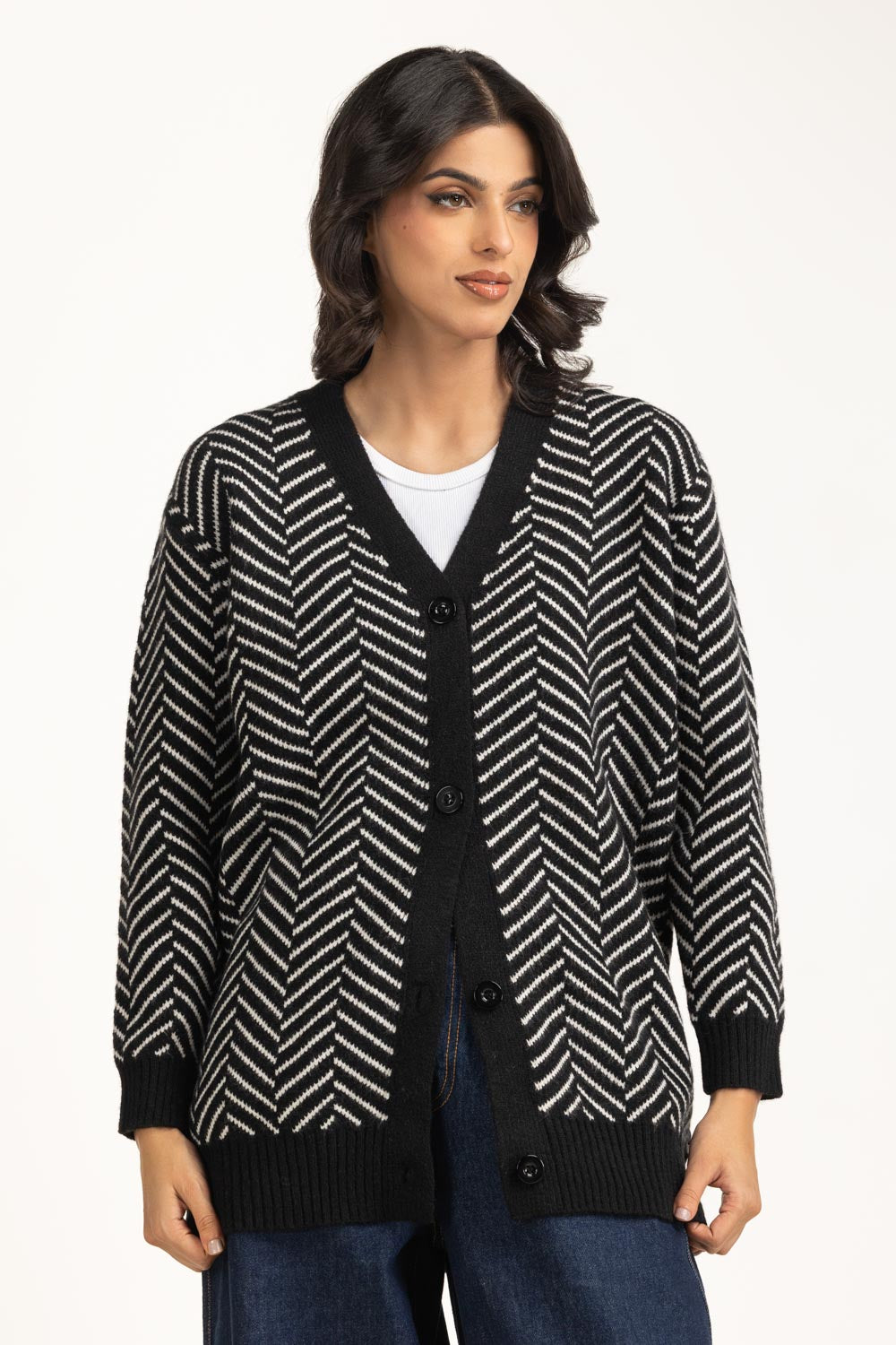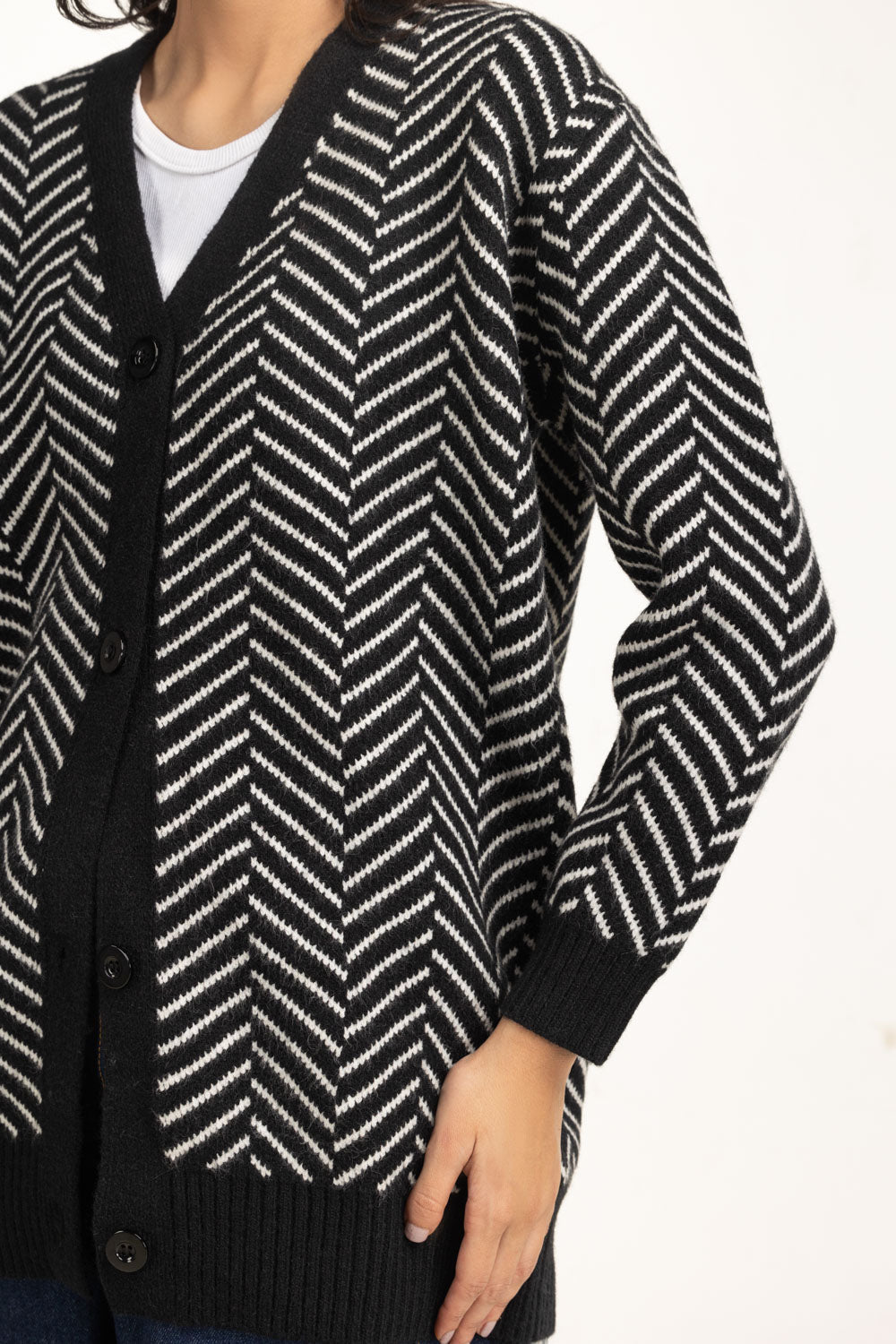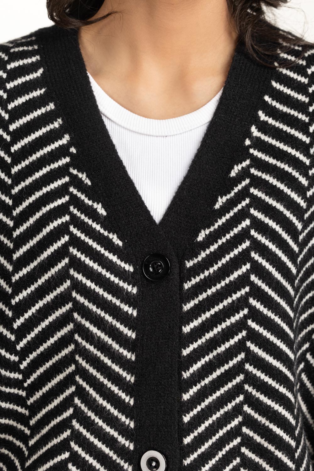 A striking black and white pattern gives this regular-fit cardigan its contemporary edge. The button-down style adds versatility, while the v-neckline lends a refined silhouette. Crafted in a knitted texture, it delivers warmth with an understated premium feel.
