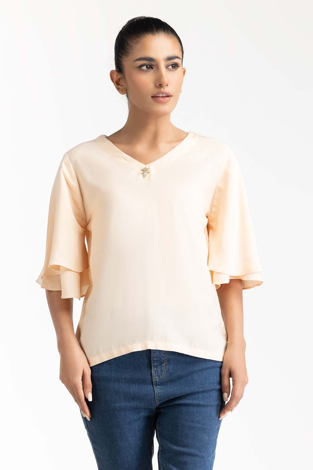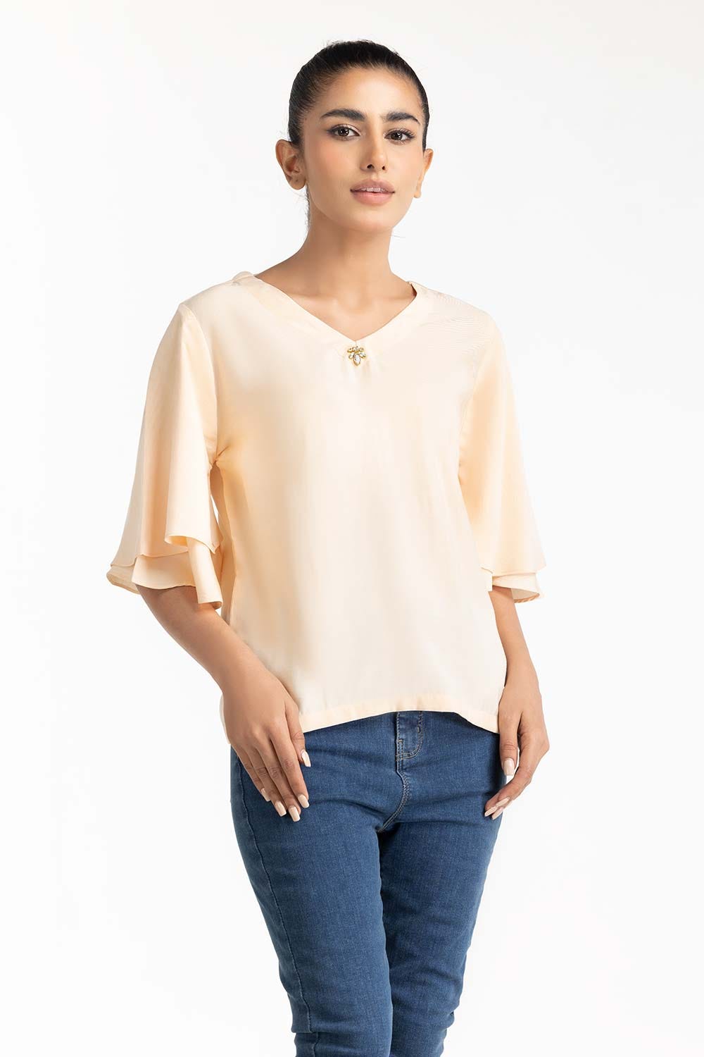 Blouse With V Neck And Double Flared Sleeves, Diamontees Detail On Front. Regular Fit Model height is...