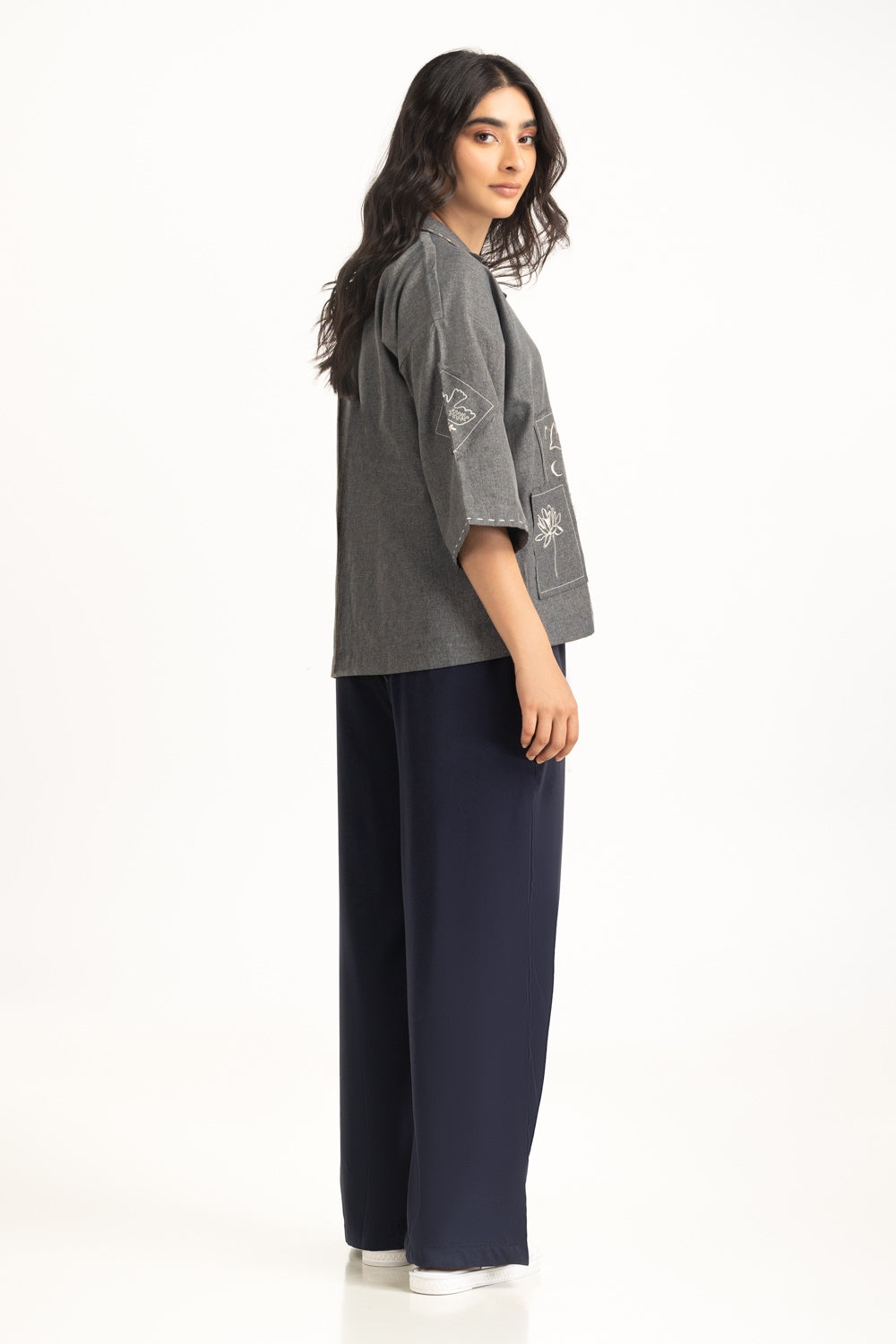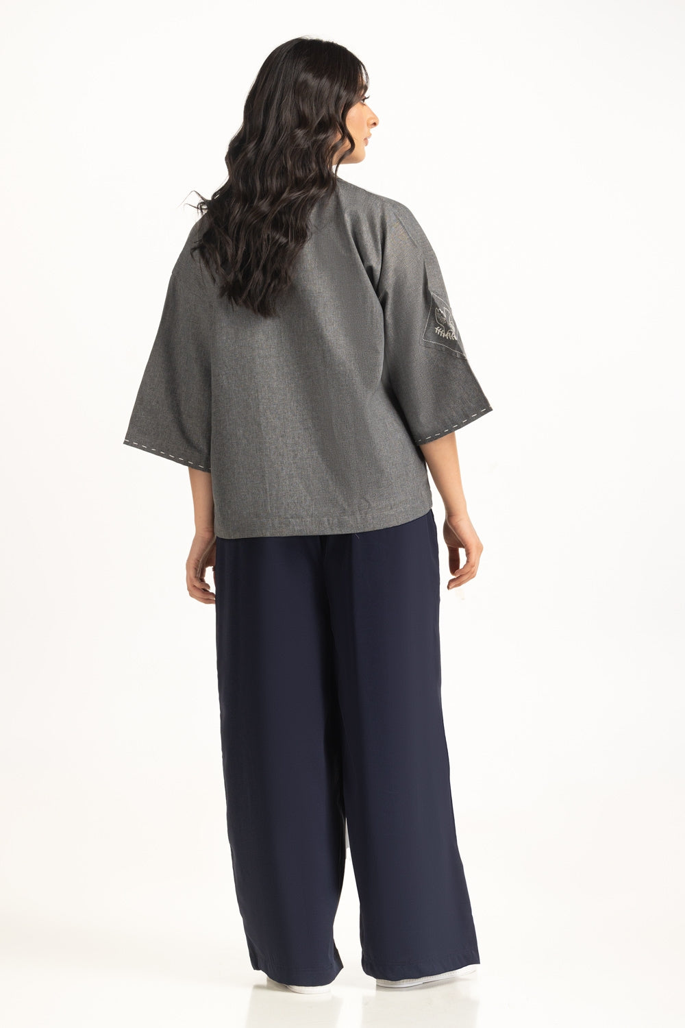 Minimal in color, rich in detail. This shirt plays with contrast through subtle embroidery at the front. The charcoal hue grounds the piece, while the regular fit delivers breathable comfort, a perfect pick for weekends plans.