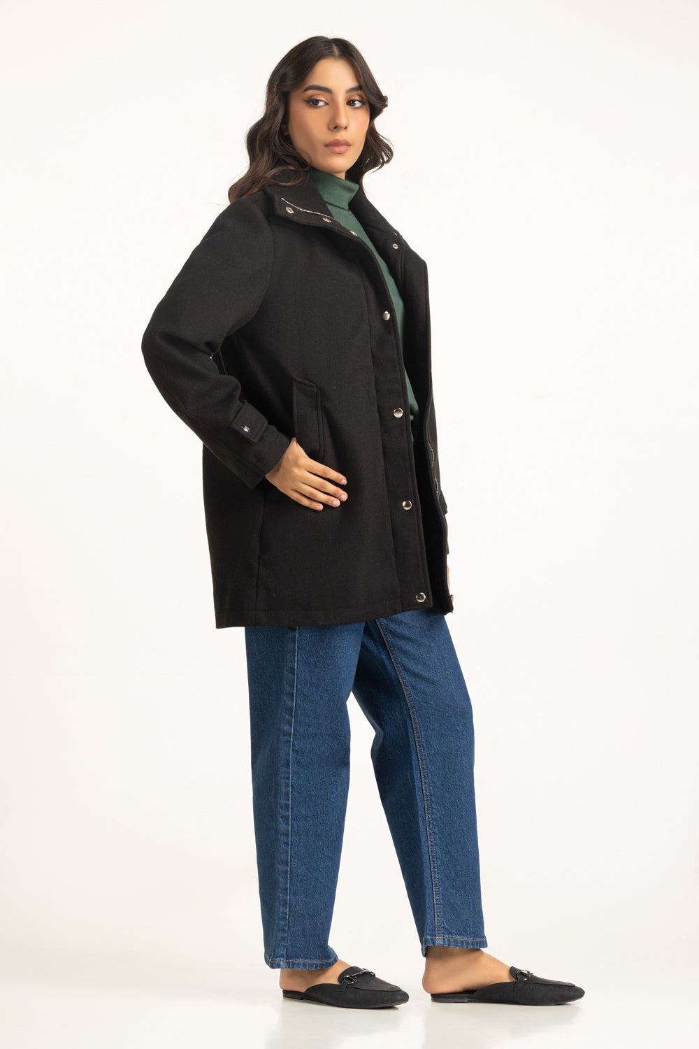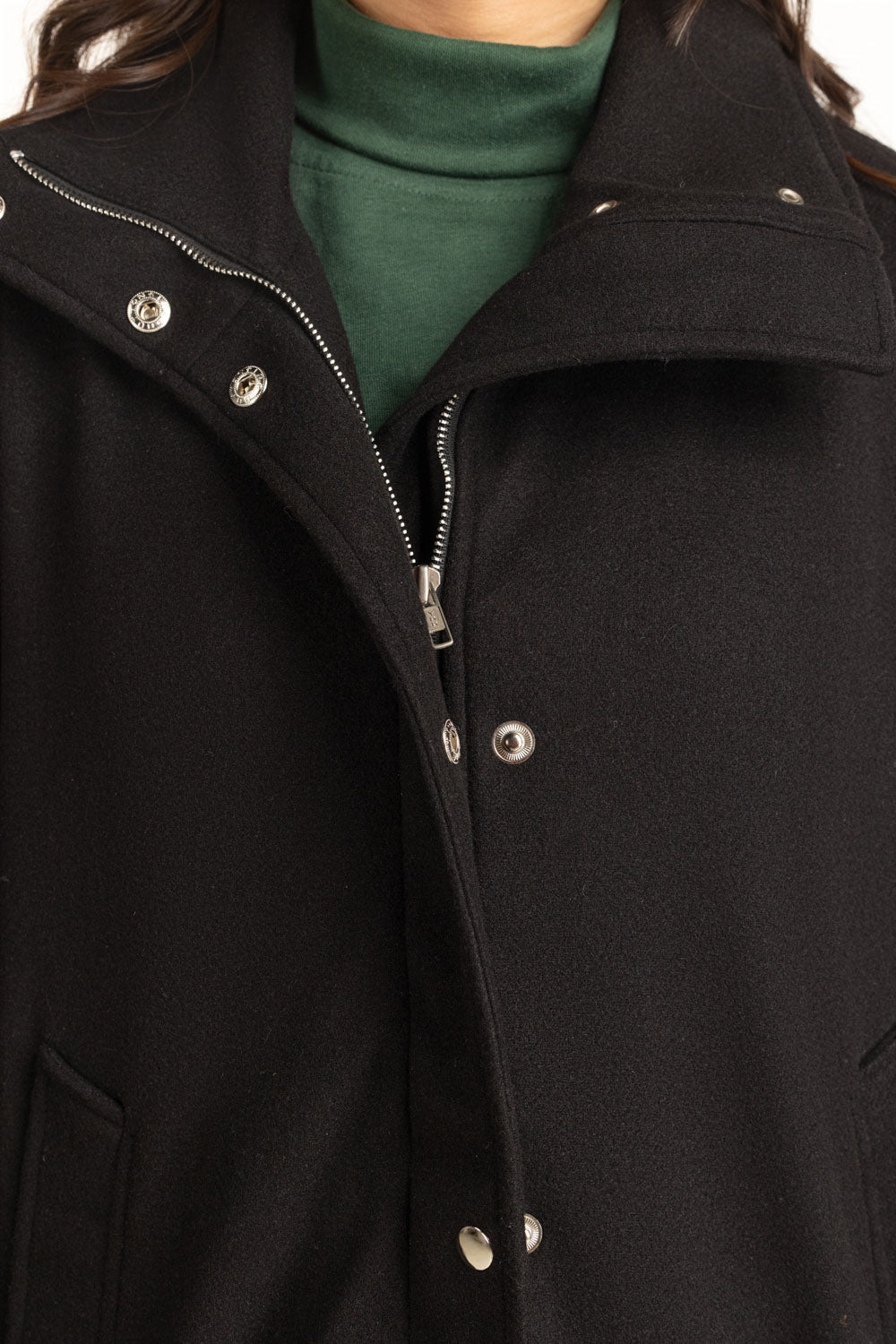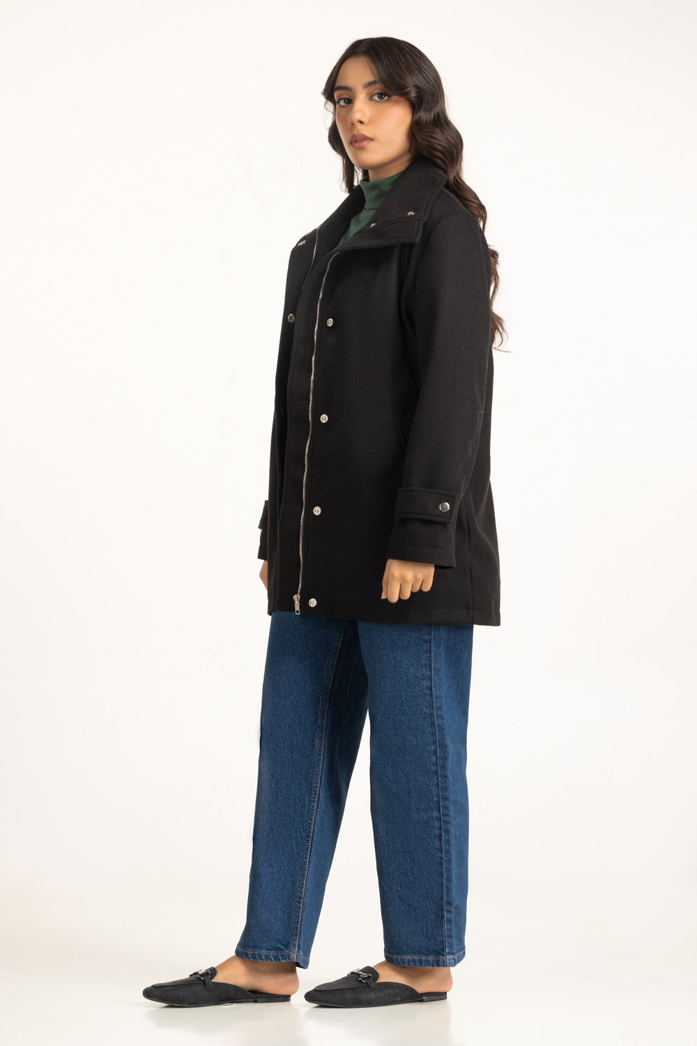 This coat in black redefines modern outerwear with its clean silhouette and secure zipper front, along with a twitch button closure. The structured design offers a sophisticated edge, while its cozy interior keeps the cold at bay. A go-to essential for crisp winter styling.