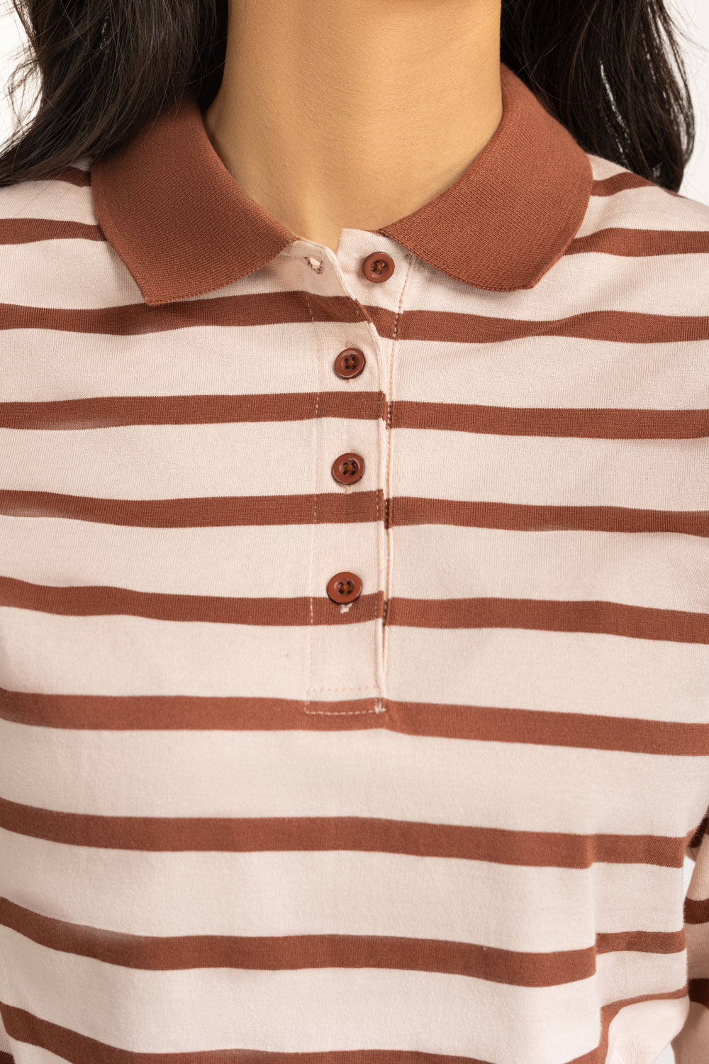 Designed in bold stripes, this knitted top keeps its form with a shirt collar and slim fit. The buttoned neckline makes it winter-ready essential that blends versatility with soothing comfort.