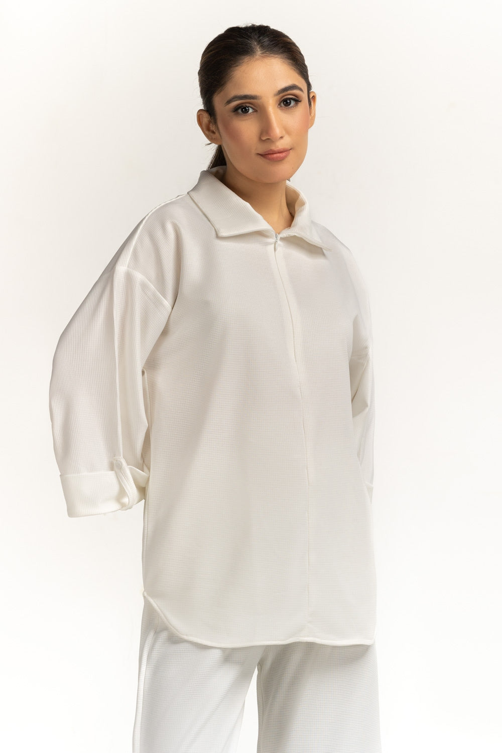 Experience the understated elegance of this shirt in soft hue. The textured weave provides a tactile richness, while the streamlined zipper front ensures a polished, contemporary look all day long.