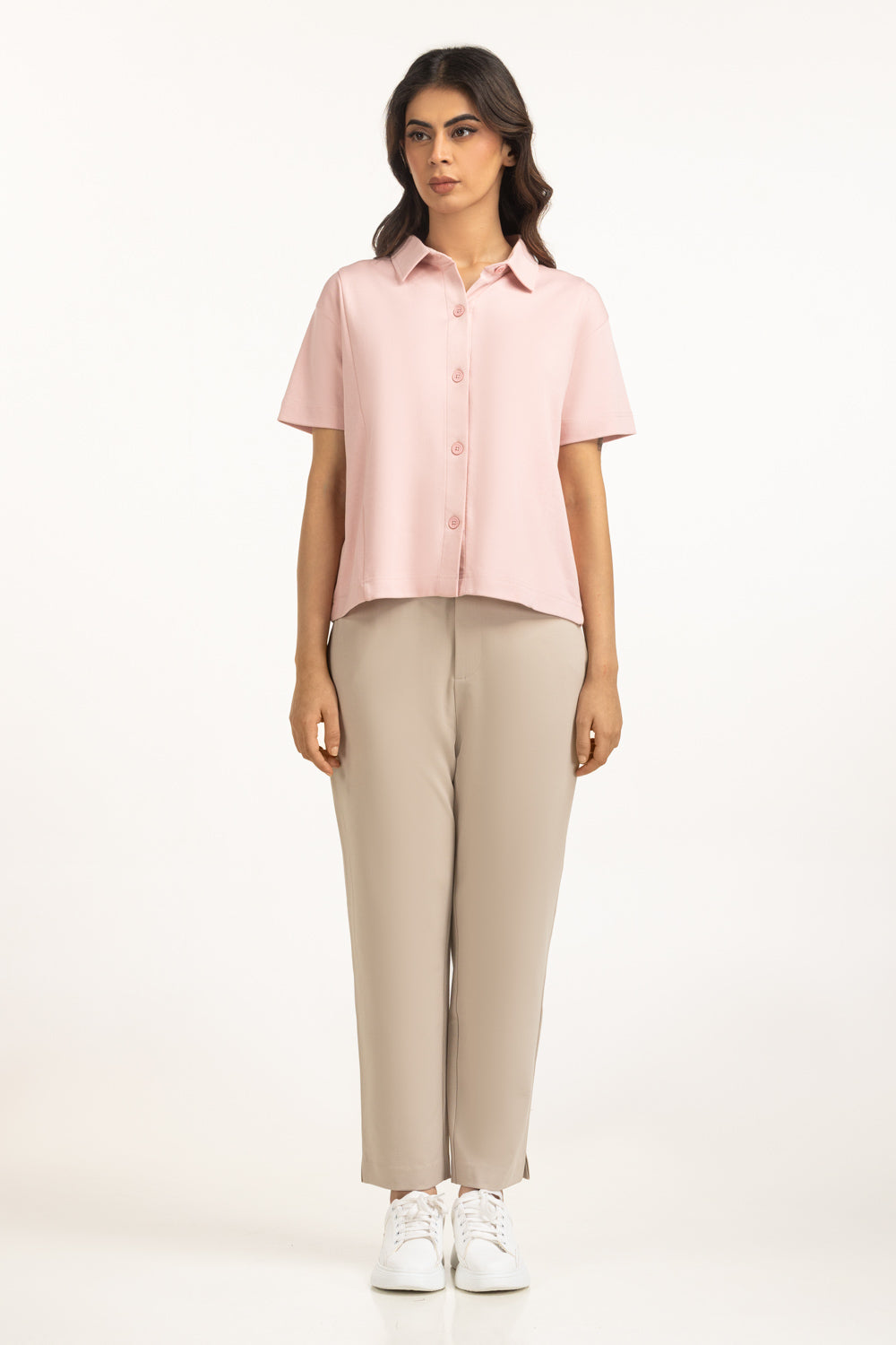 The button-down pink shirt in a relaxed fit offers a fresh take on winter casuals. The soft hue brings understated elegance, while the silhouette delivers effortless movement. Perfect for layering or wearing solo, it keeps functionality at its core.