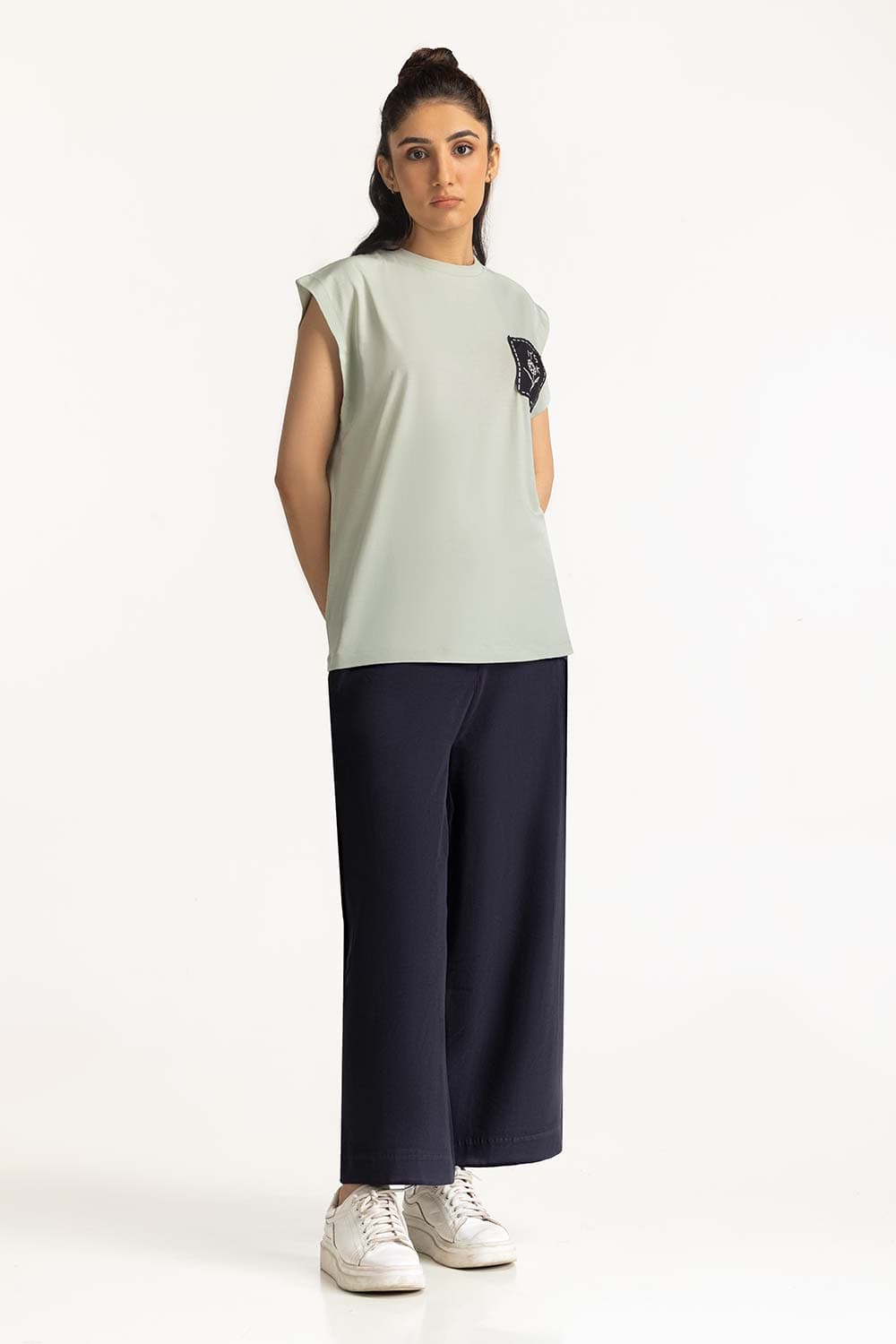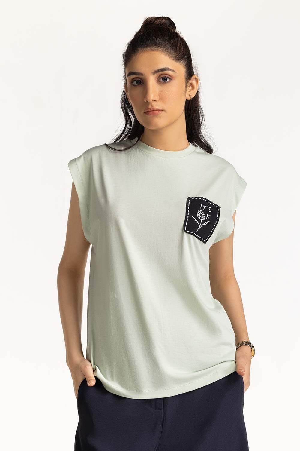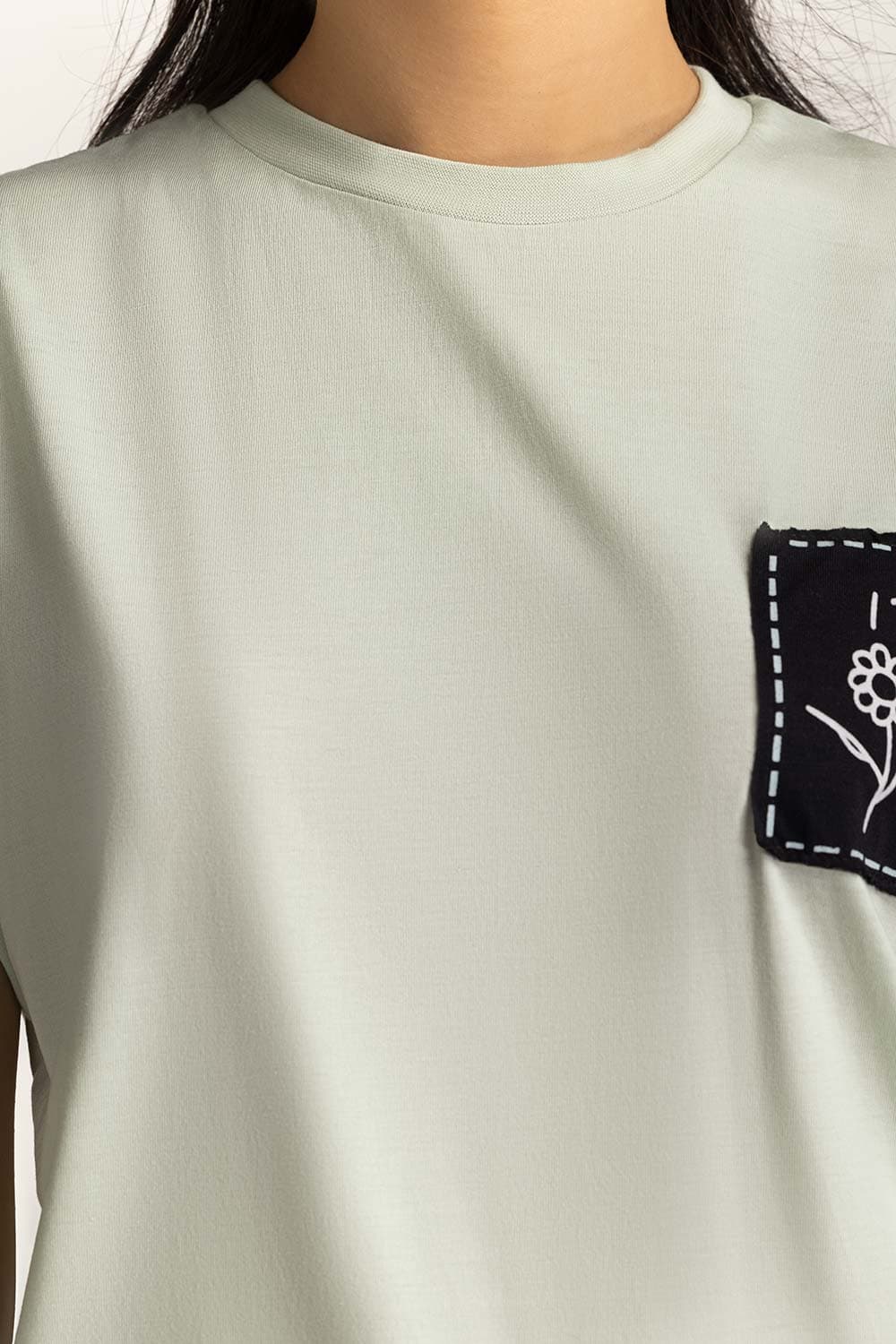 Crew neck tee. Ribbed trim and neck and armhole with center pleat detail at back. Artwork patch on side front.