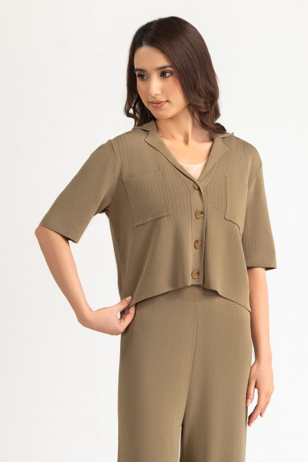 Crafted from 100% viscose, this Co-Ord top in lite olive color features a soft drape, smooth texture, and breathable feel, ideal for comfortable everyday wear.