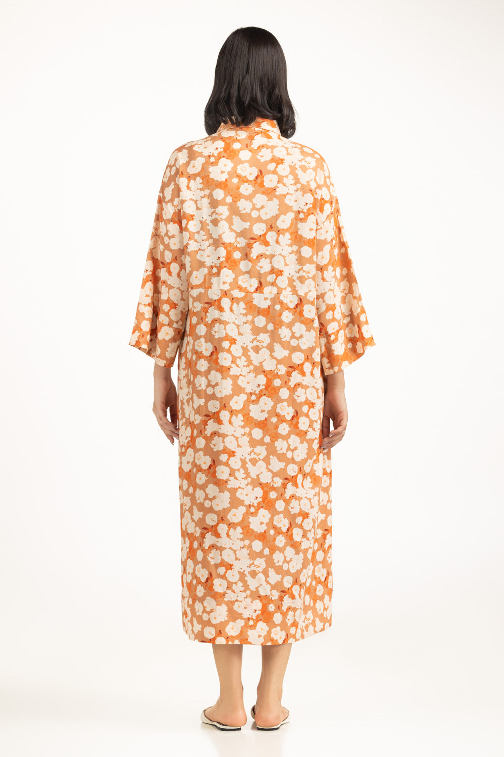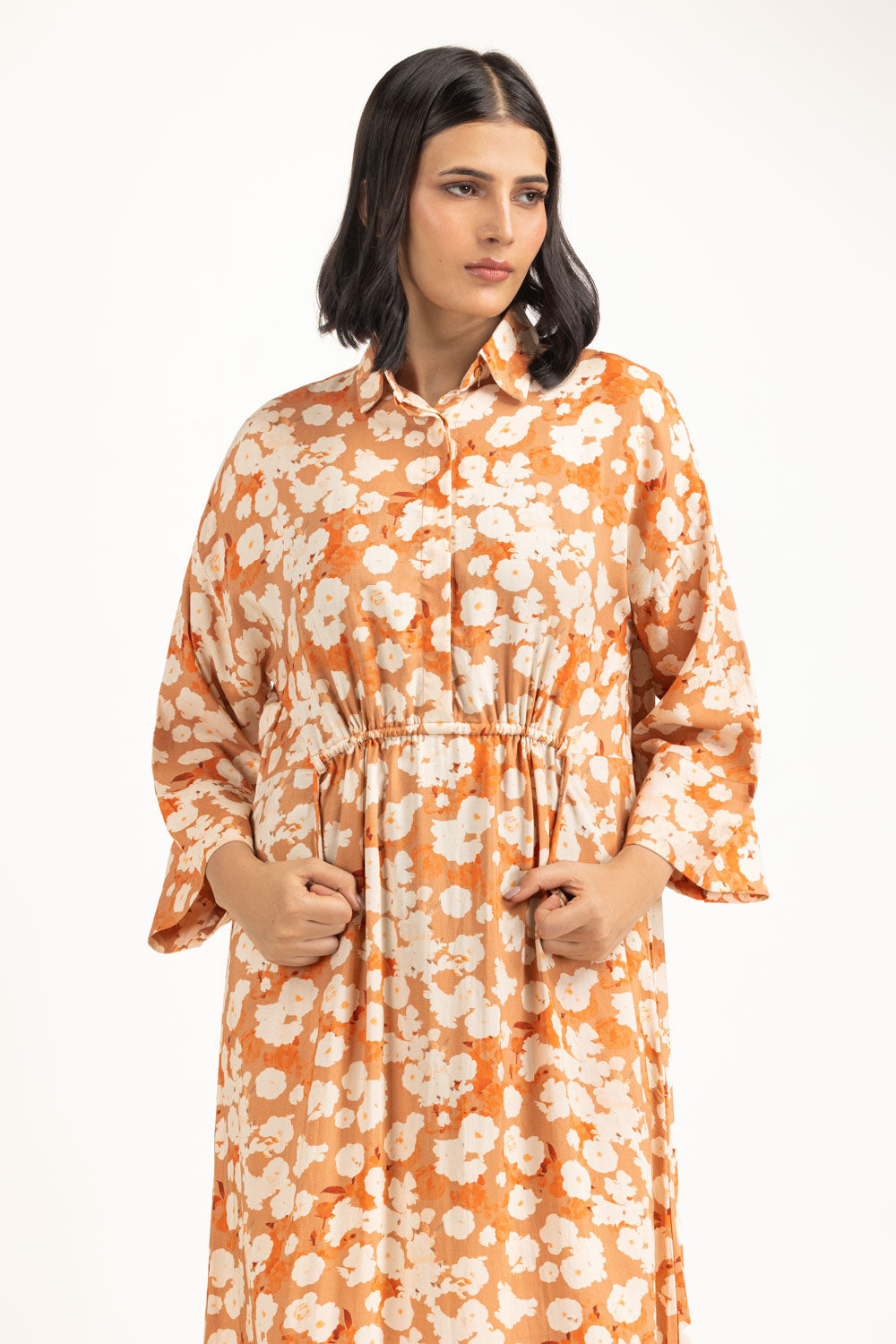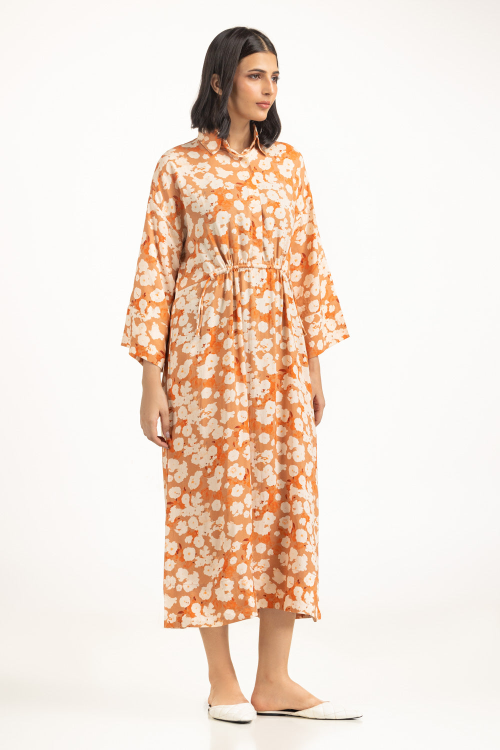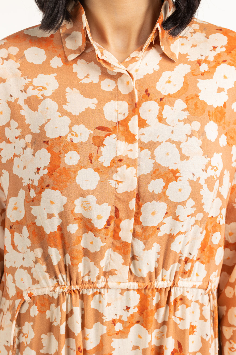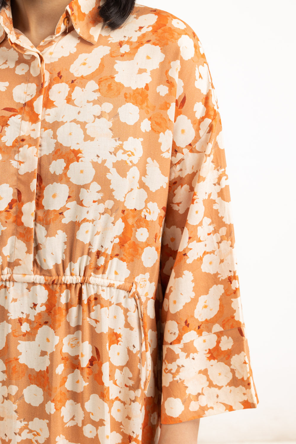 A beautiful floral printed dress, crafted in a soft viscose fabric that drapes effortlessly through winter. The buttoned neckline with the adjustable drawstrings and a breezy regular fit keeps it comfortable while maintaining a flowy feminine structure.