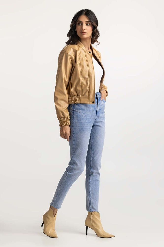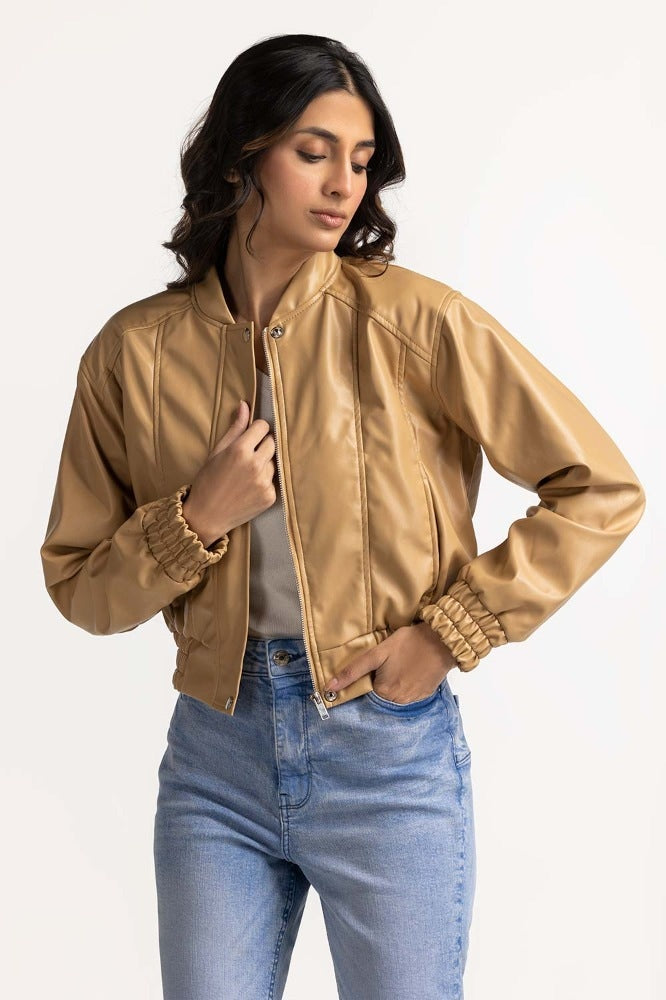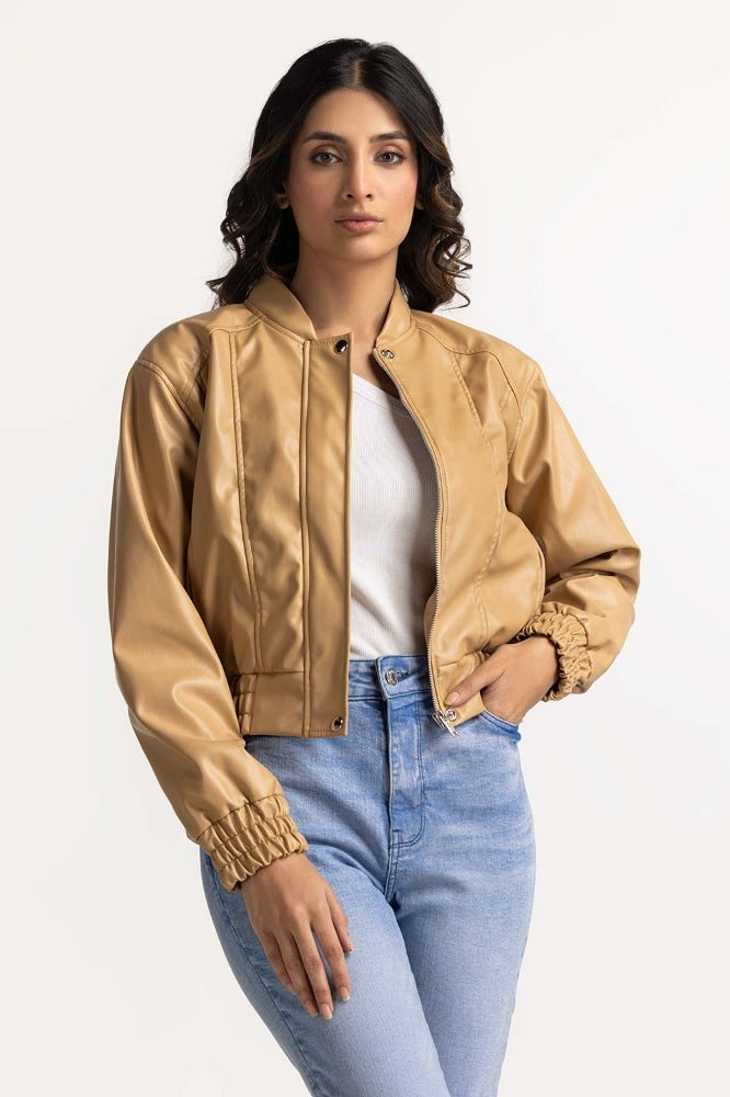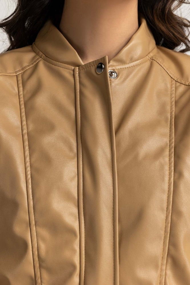 PU cropped jacket with front panels detail and elasticated bottom opening.