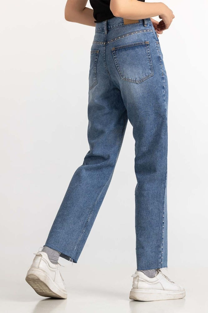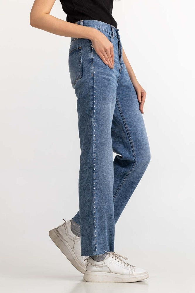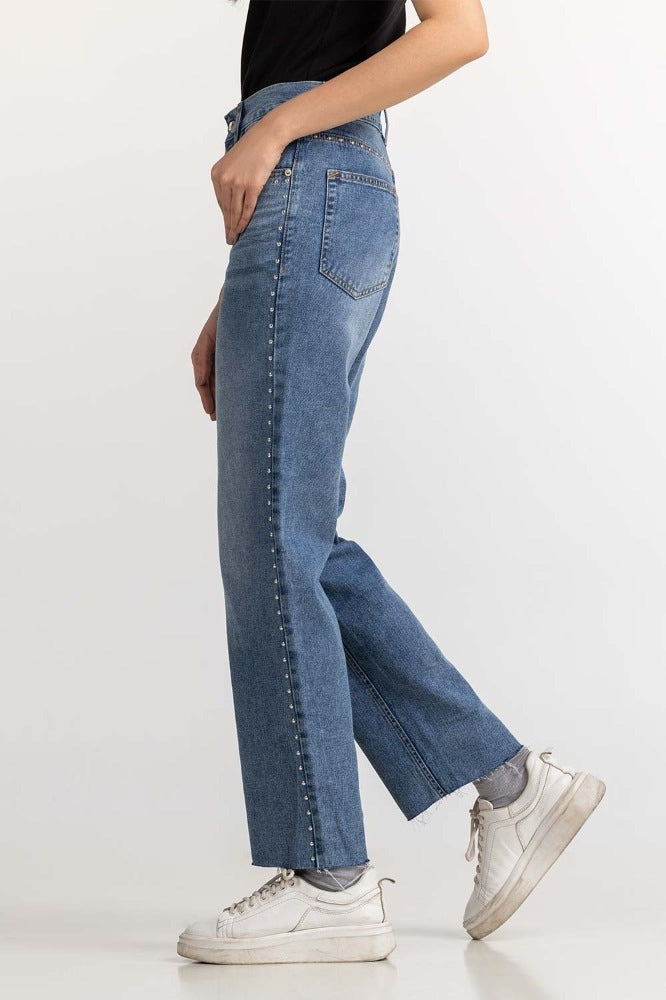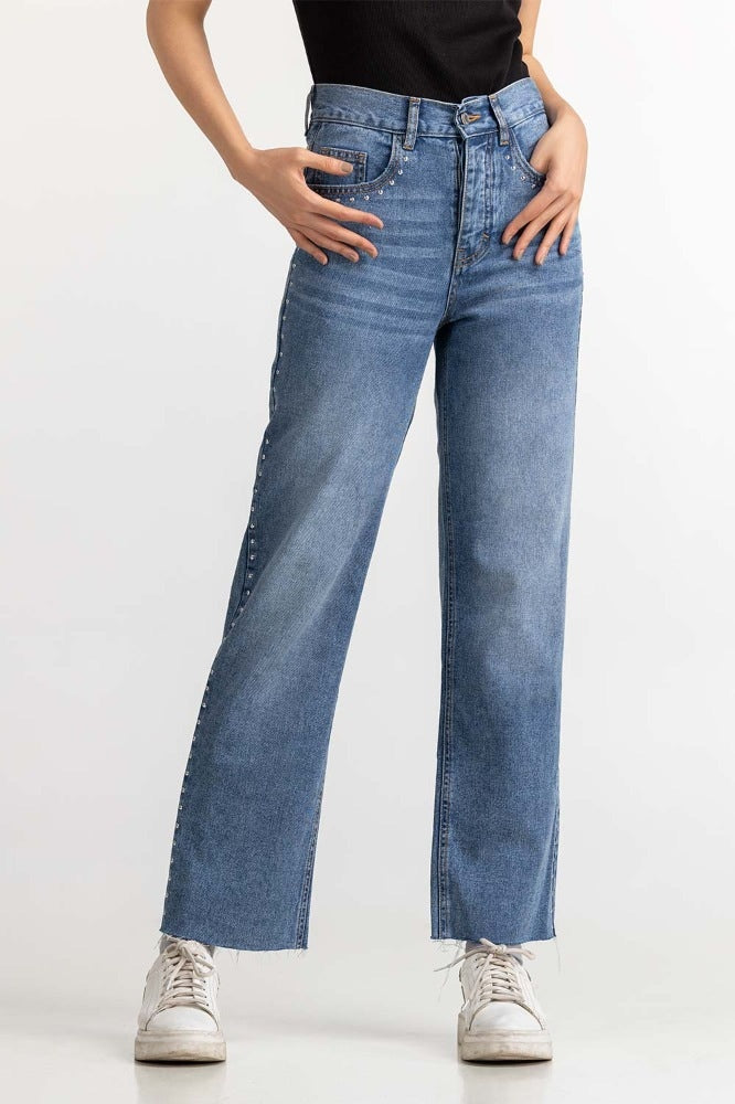 High rise wide leg denim with dimontes Wide Leg Model height is 5' 10". Model is wearing...