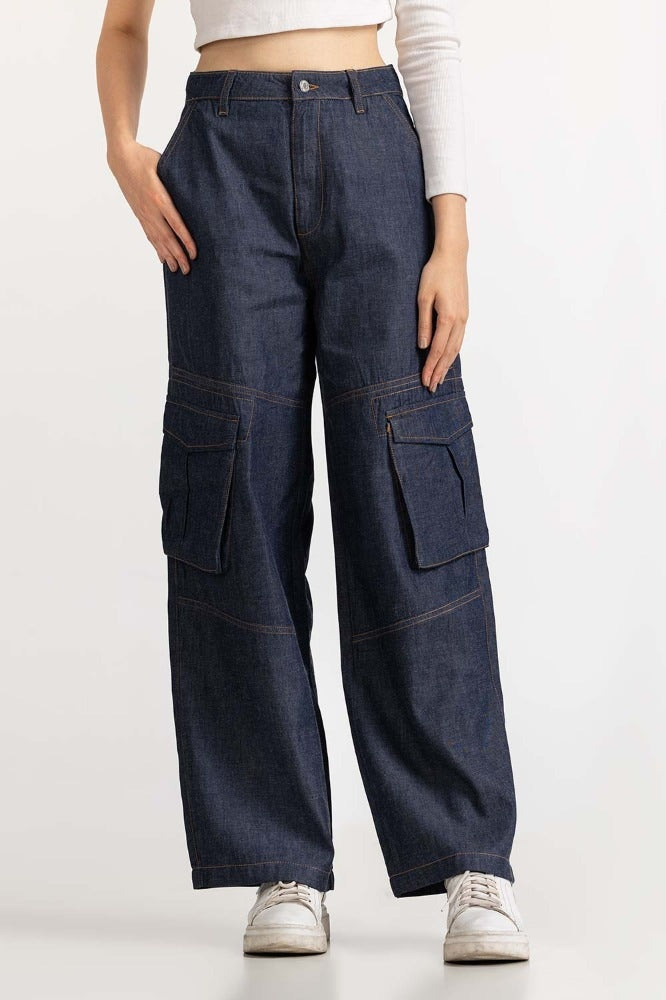Indigo wash high rise cargo wide leg denim Wide Leg Model height is 5' 10". Model is...