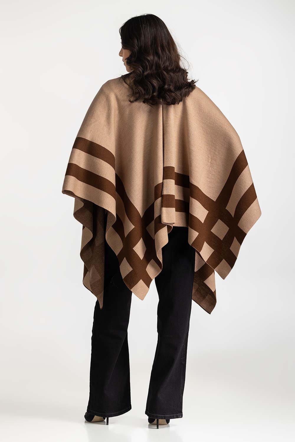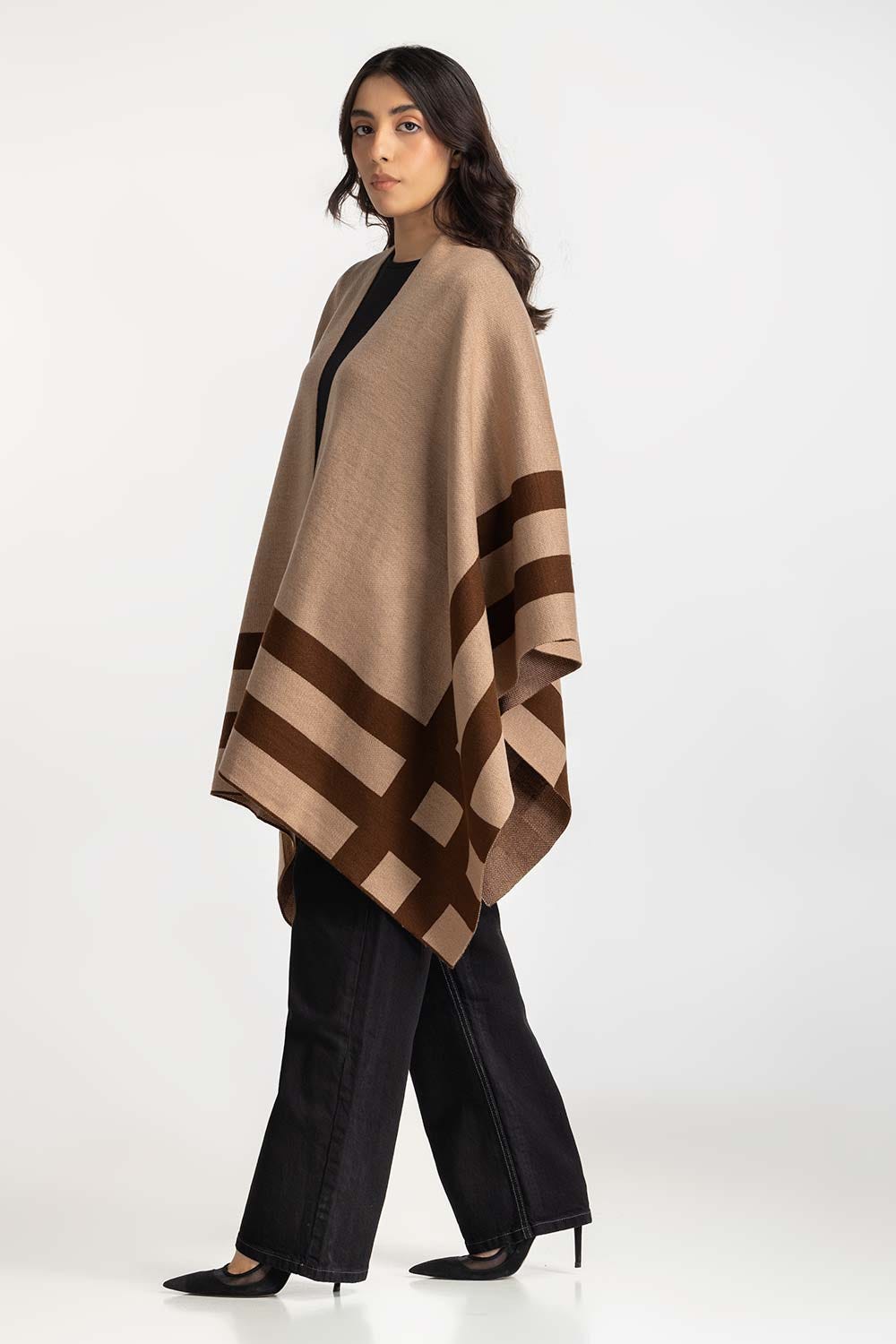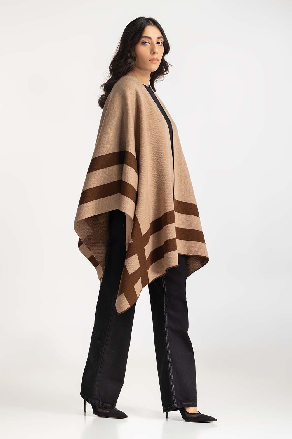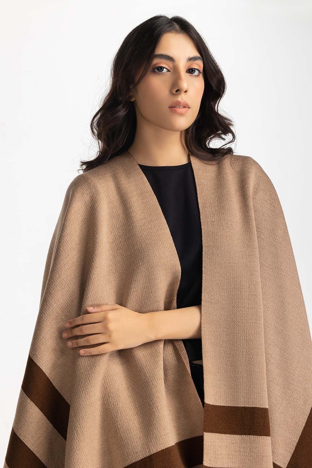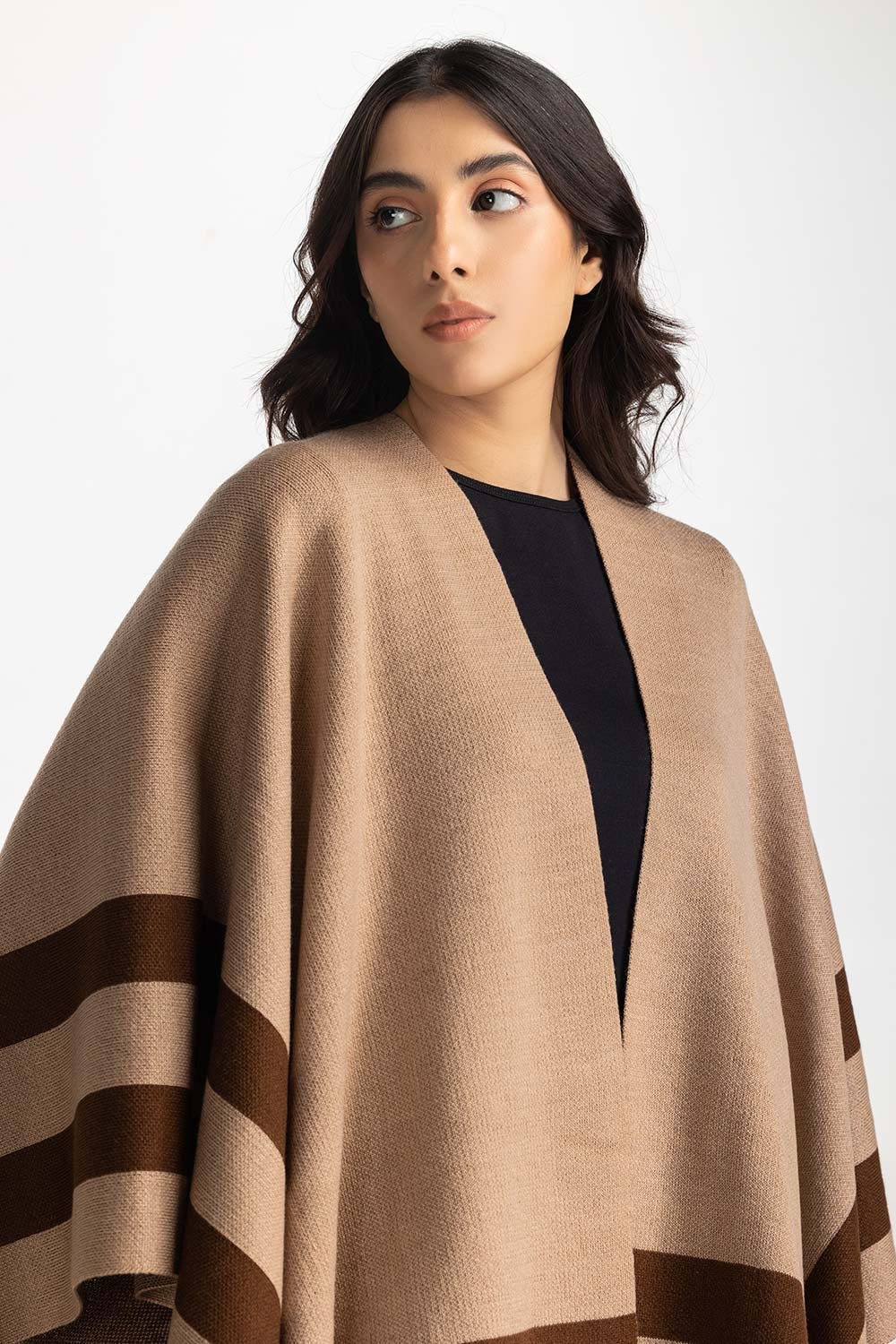 Beige Cape Shawls With Stripes At Side With Dark Brown Color