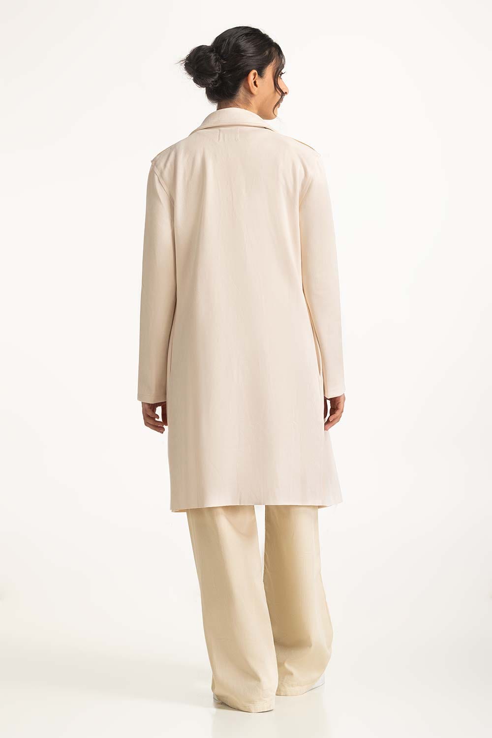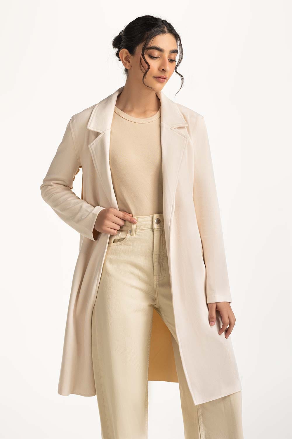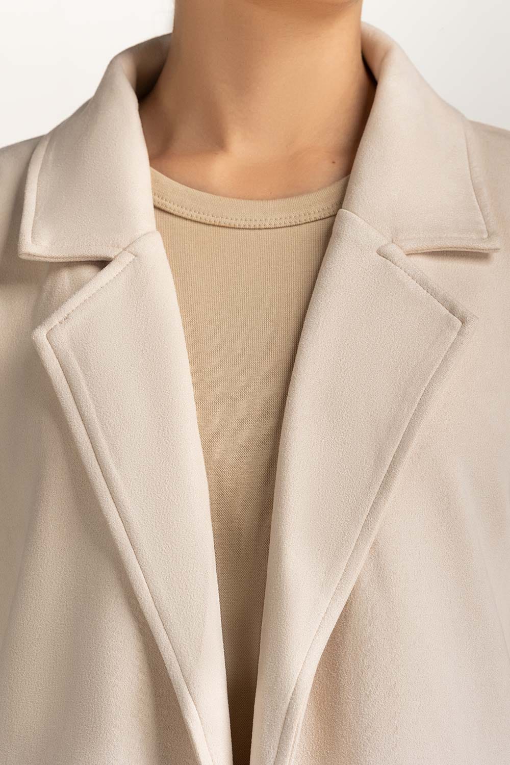 Offwhite suede knee length long coat with resort collar and pockets at front