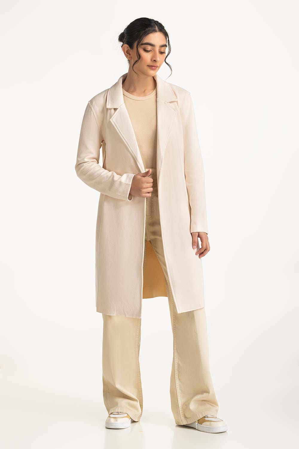 Offwhite suede knee length long coat with resort collar and pockets at front  Regular Fit Model height...