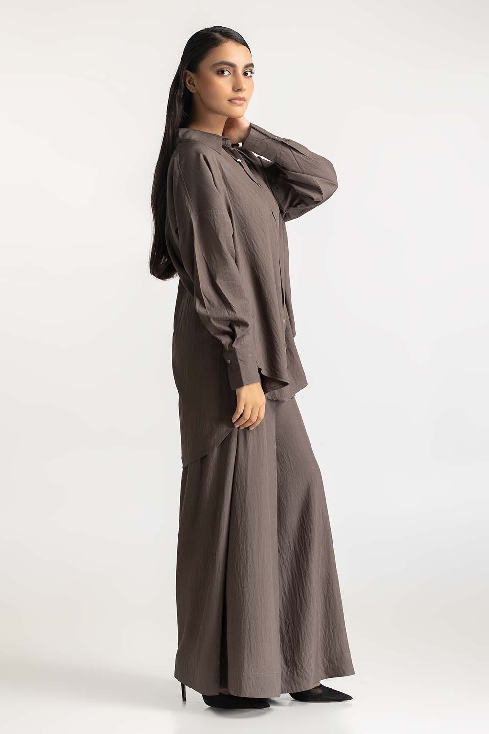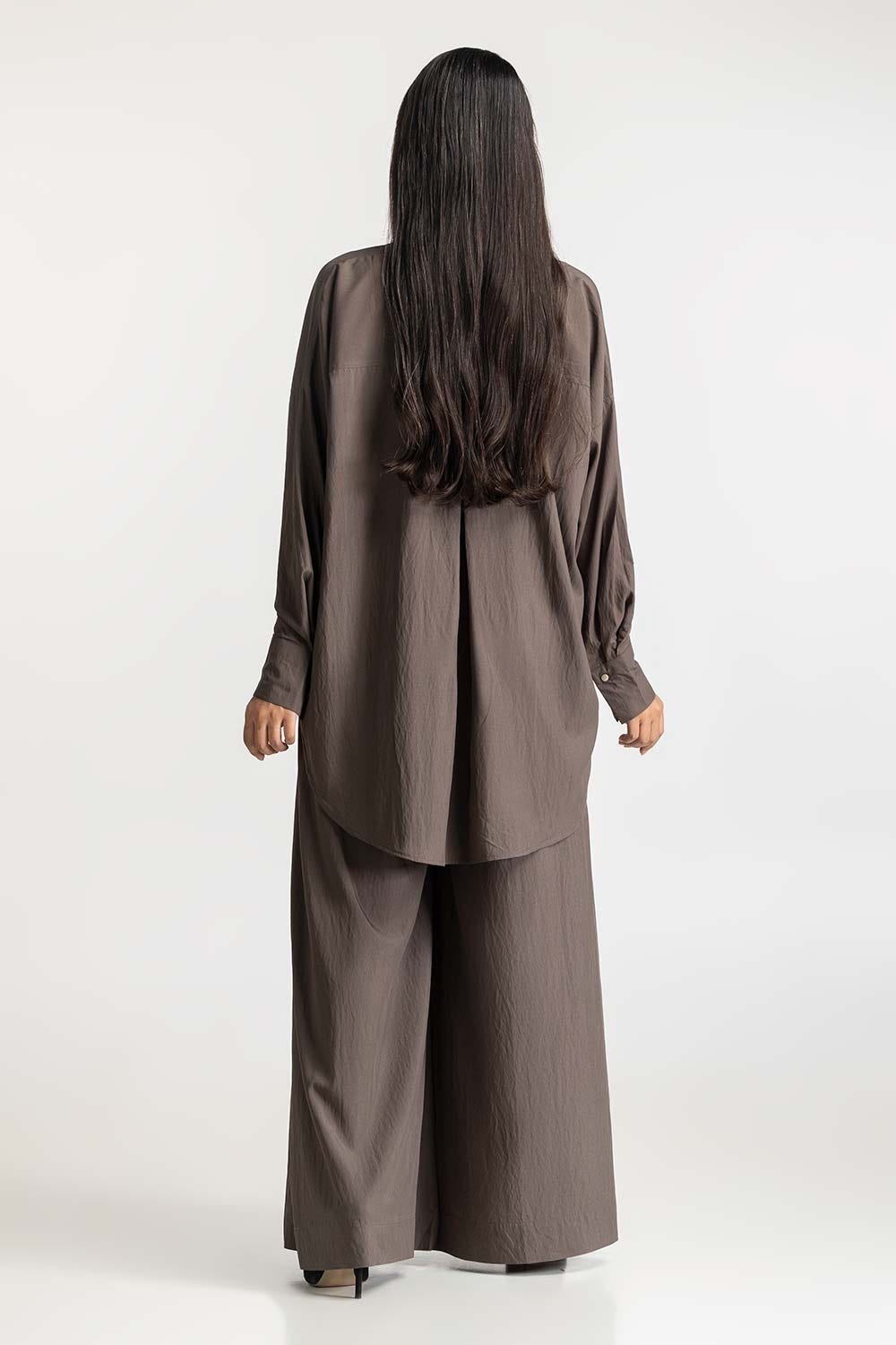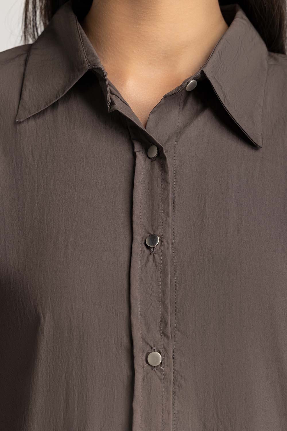 Collared loose fit shirt with drop shoulders and metal buttons on front. Full sleeves with cuff and pleat detail on back yoke.