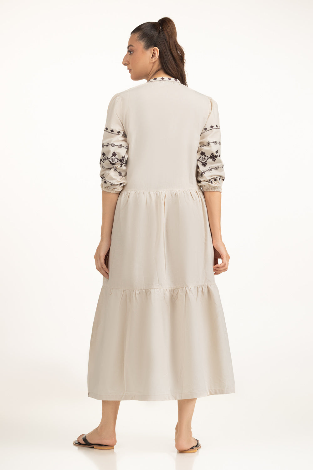 This beautifully embroidered dress blends natural fibers for a textured feel that works wonderfully through cooler days. The regular fit maintains an easy, graceful fall, while the intricate stitching adds a layer of artisanal character. With its soft eggnog tone, it offers subtle elegance perfect for winter afternoons.