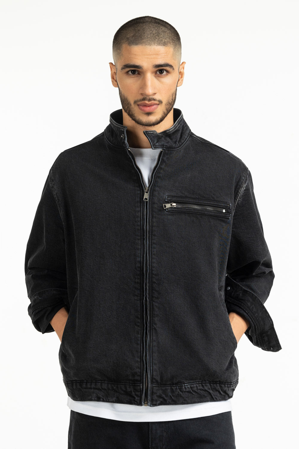 Sharp and minimal, this black jacket in a regular fit offers structure, while the band neck adds a refined touch. Finished with a sleek front zipper pocket, it combines function with timeless sophistication.