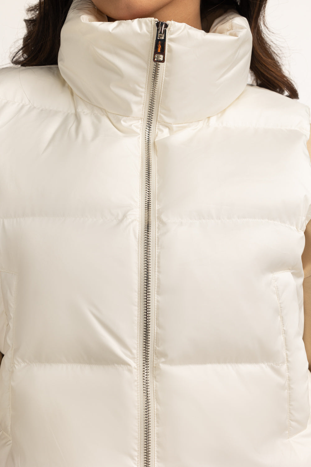 This sleeveless puffer jacket combines sleek modernity with functional design. Cut in a regular fit, it features a high-neck design for cozy comfort, a zipper closure for ease, and two pockets for practical storage. Making it a refined winter layering essential.