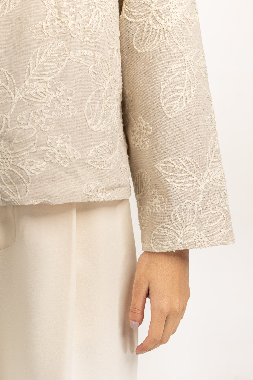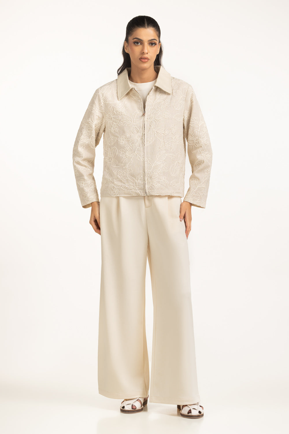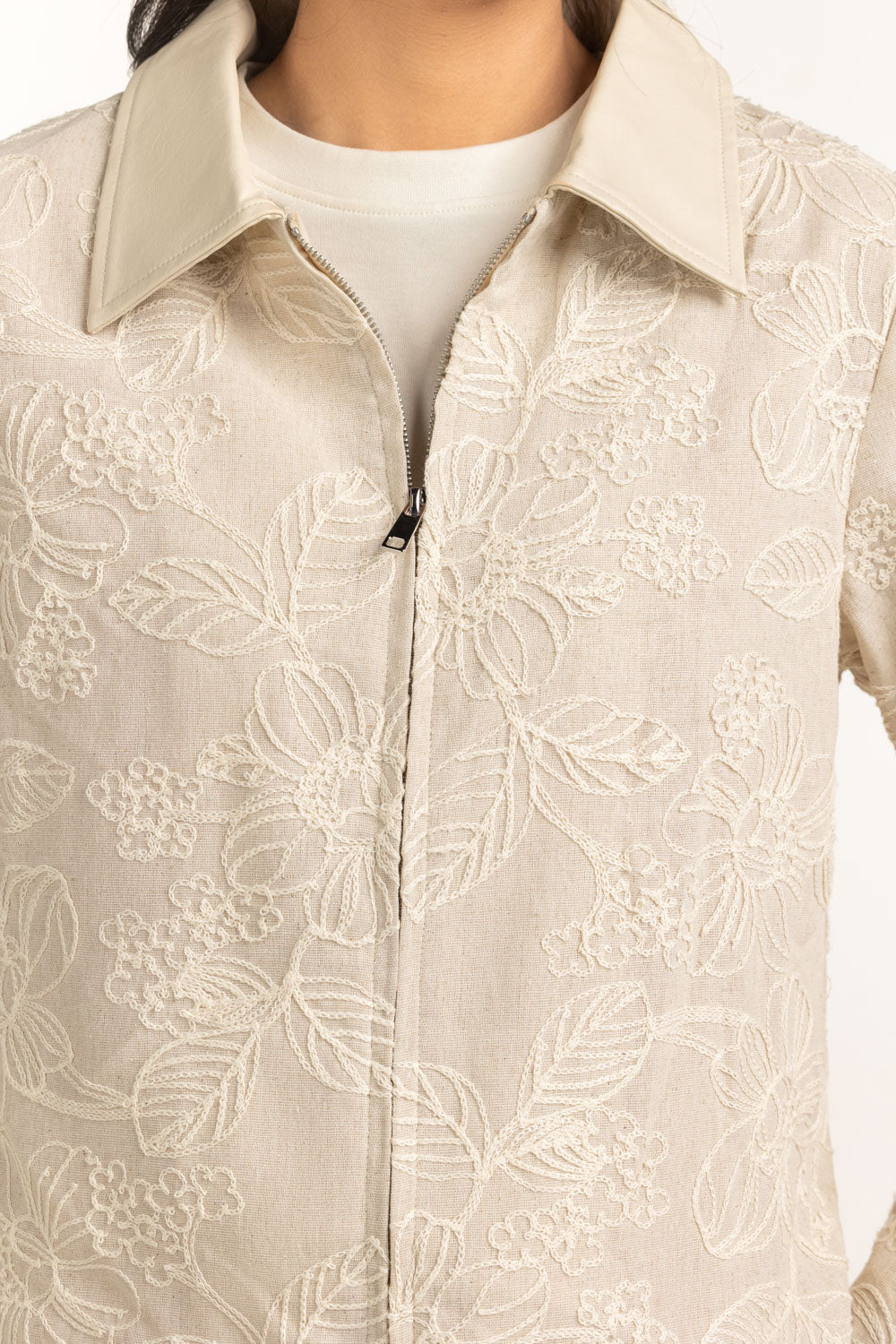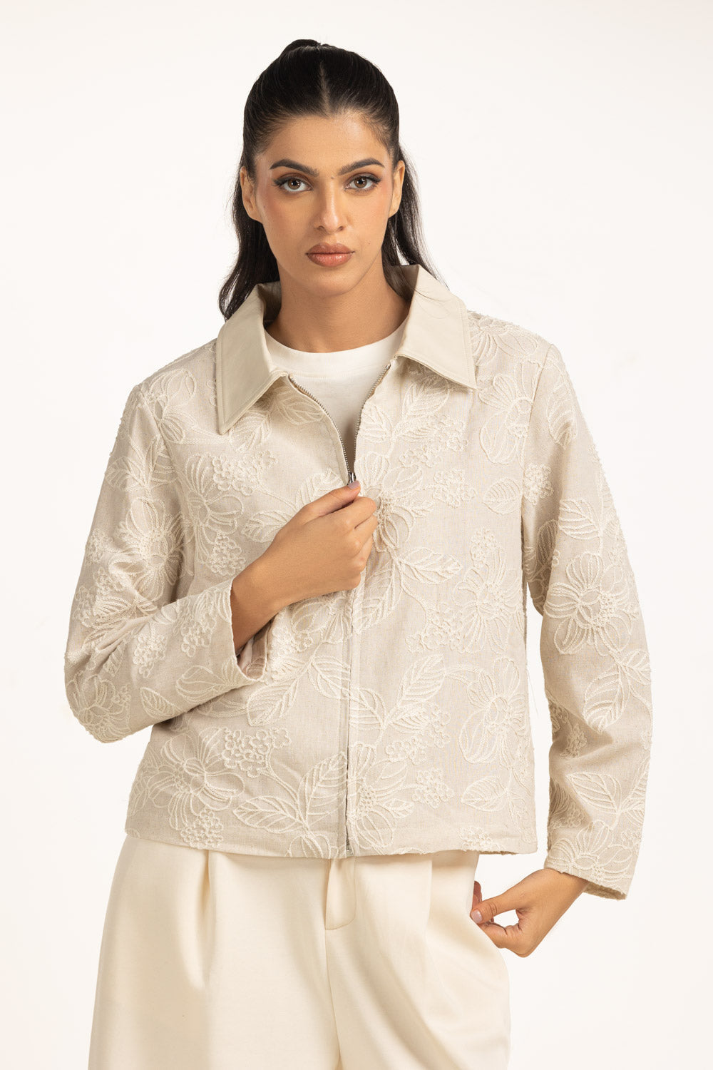 This embroidered shacket blends softness and structure, designed in regular fit with a sleek zipper front. The delicate embroidery elevates its aesthetic, while the silhouette ensures layering ease. It transitions seamlessly across casual and semi-polished winter looks.