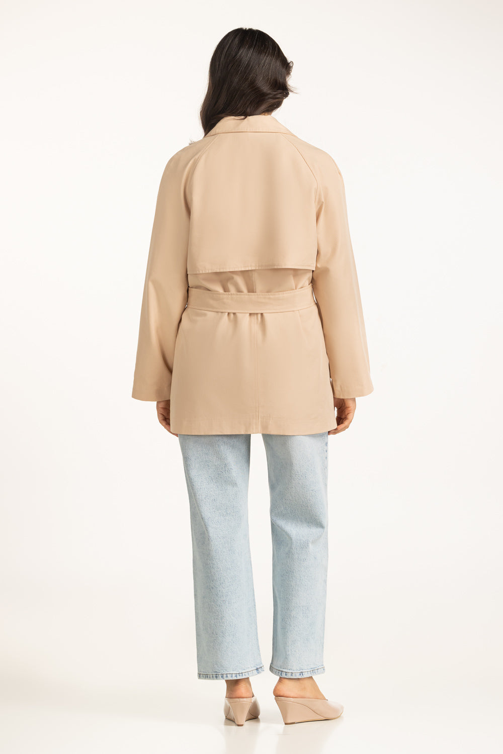 A modern classic in your winter wardrobe, this trench coat offers sleek structure with a soft beige hue. The tailored collar and mid-length cut make it ideal for layering through chilly days.
