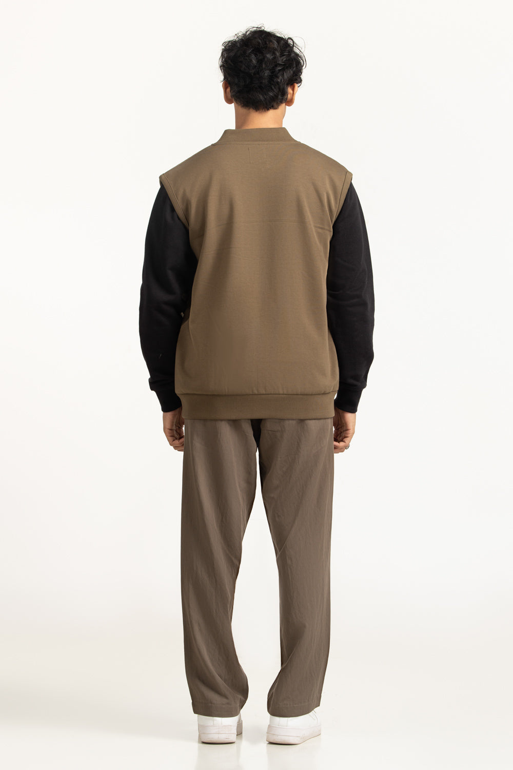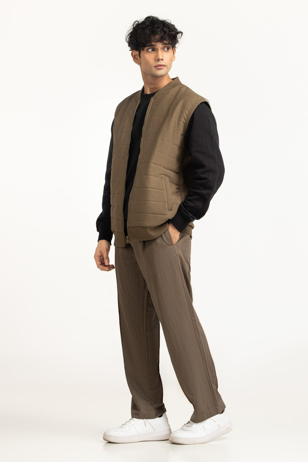 A tailored silhouette comes alive through the winter-friendly fabric, shaped into a classic knitted vest. Its earthy olive tone with a front zipper and a band-collar exudes structured look that layers effortlessly all day long.