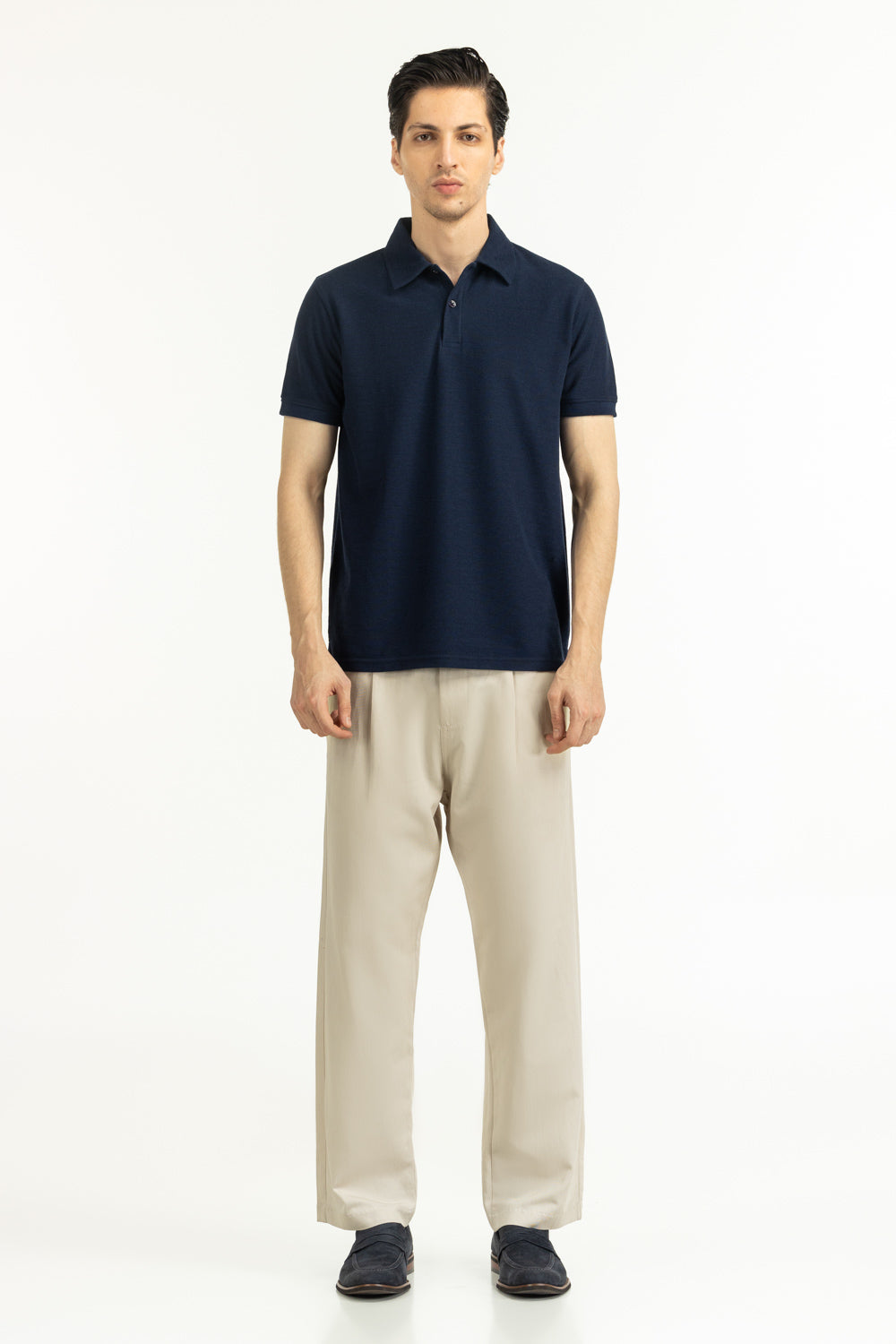 Designed in a rich Prussian blue, this textured polo blends structure and softness for everyday versatility. The regular fit ensures ease of movement, while the button neckline adds a refined touch.