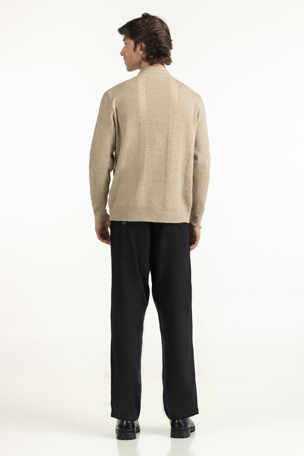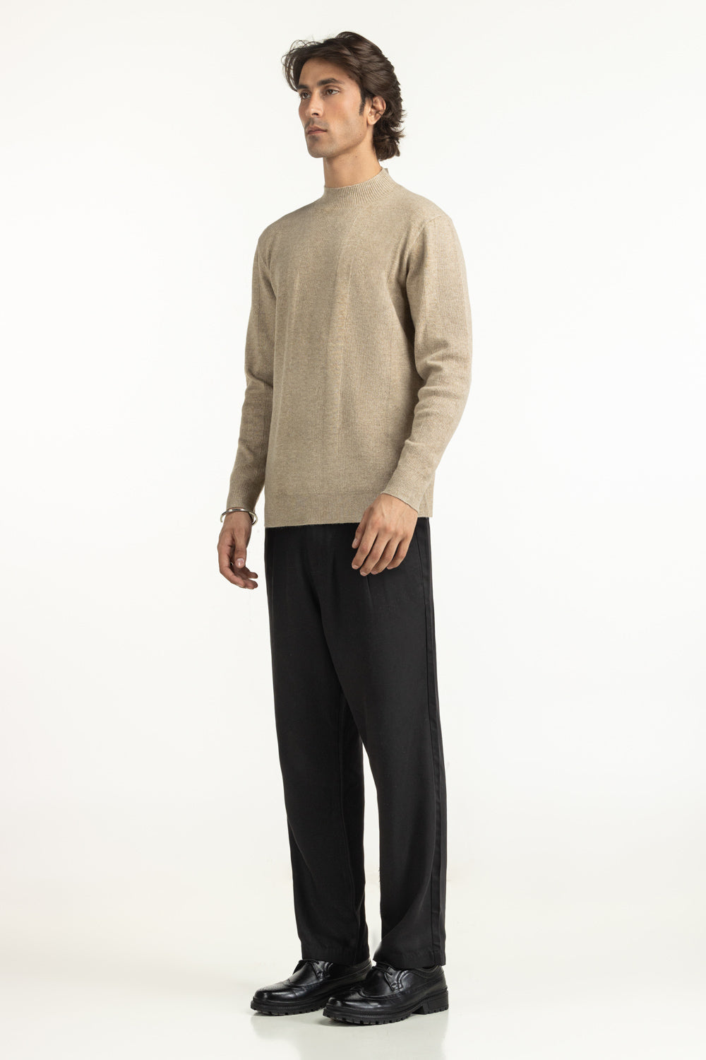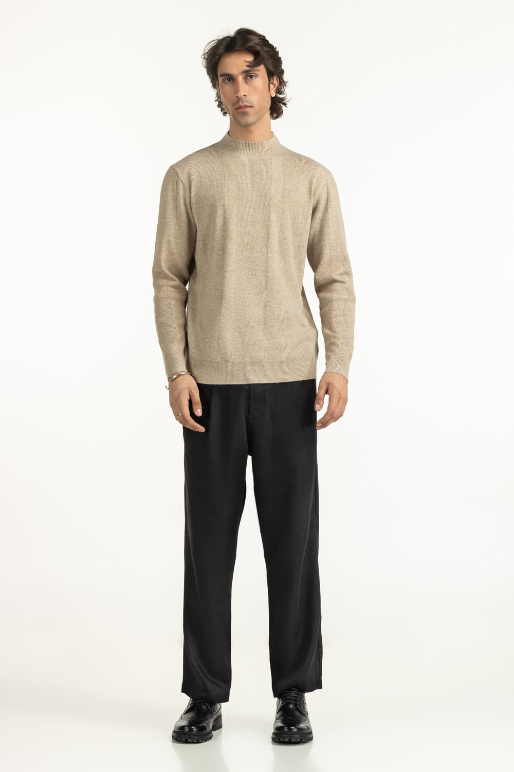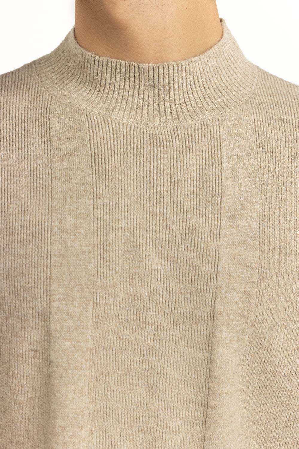 In a calm beige hue, this sweater brings understated luxury to winter dressing. Its mock-neck design frames the face with modern appeal. While the textured fabric adds quiet depth, giving it character, no matter how you style it.