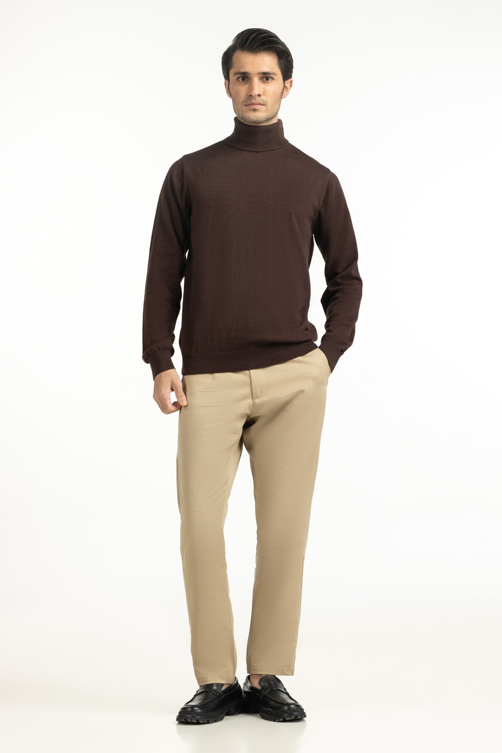 Crafted with precision, this high-neck sweater comes in a deep brown shade. Its pure cotton construction ensures breathable comfort, while the regular fit provides everyday versatility.